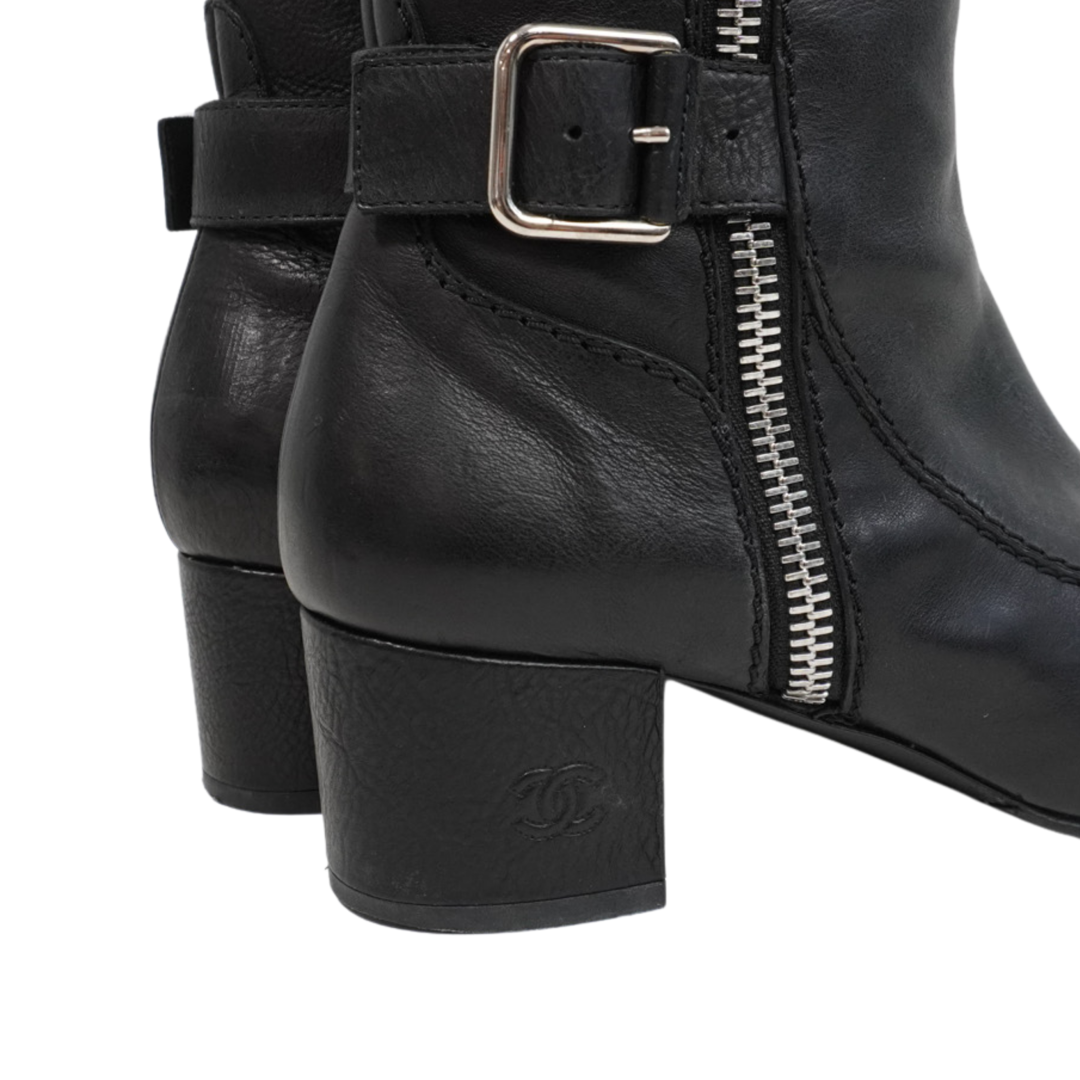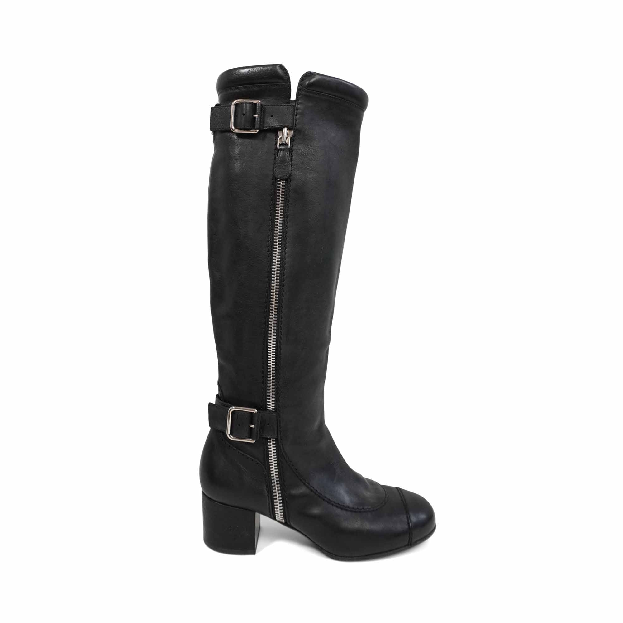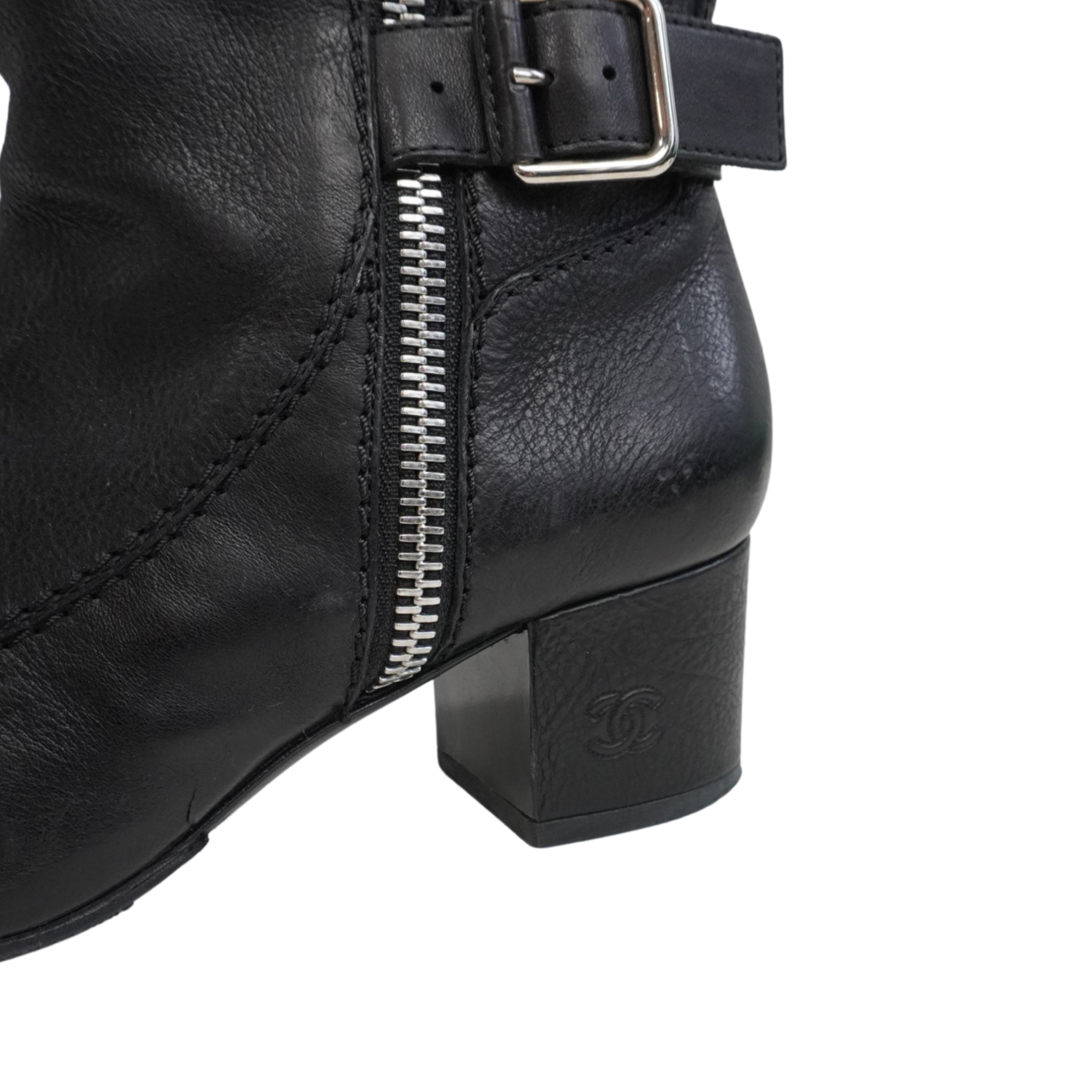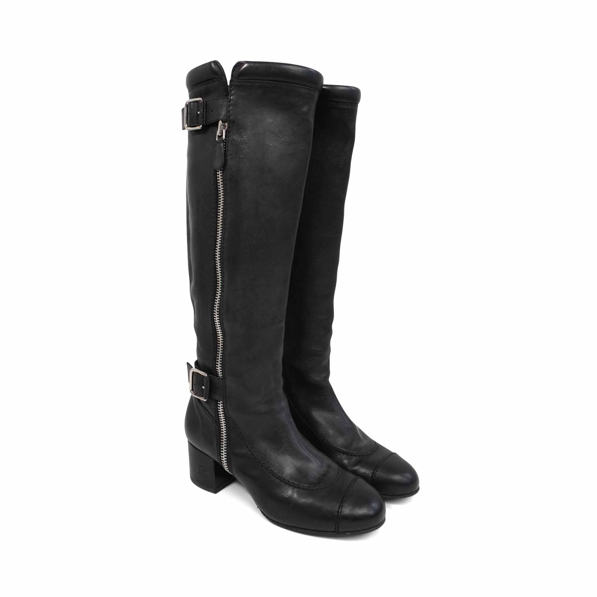 Chanel riding boots in a knee high, moto-inspired style, in black leather with embossed CC logo heels and toe cap detailing. Features silver zippers down the length of the shaft with buckles at the top and bottom.