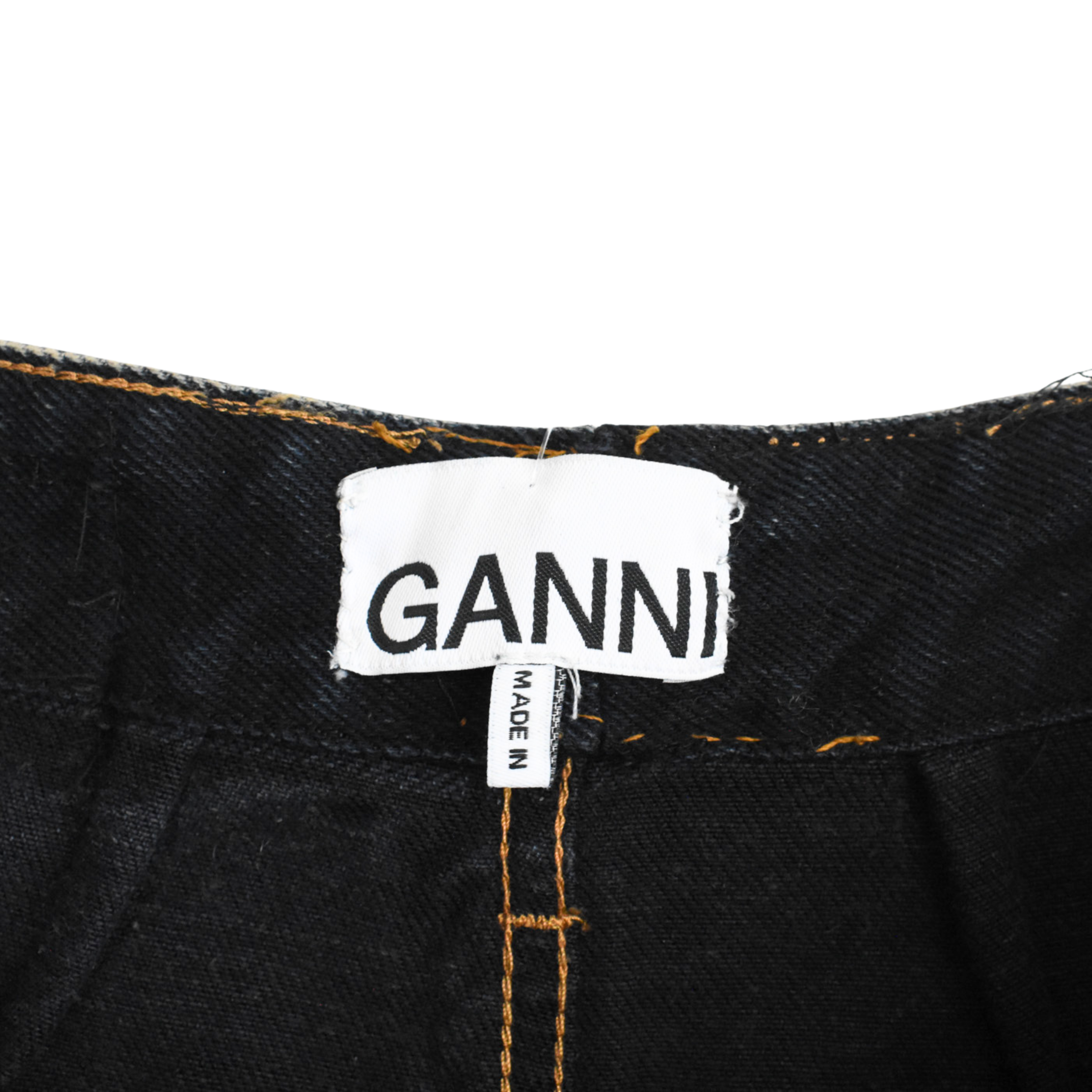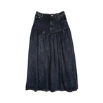Ganni denim maxi skirt in dark acid washed denim with a ruched drop waist, a button-fly closure, five pockets around waist like classic jeans, and a black leather logo patch on the back of the waistband.