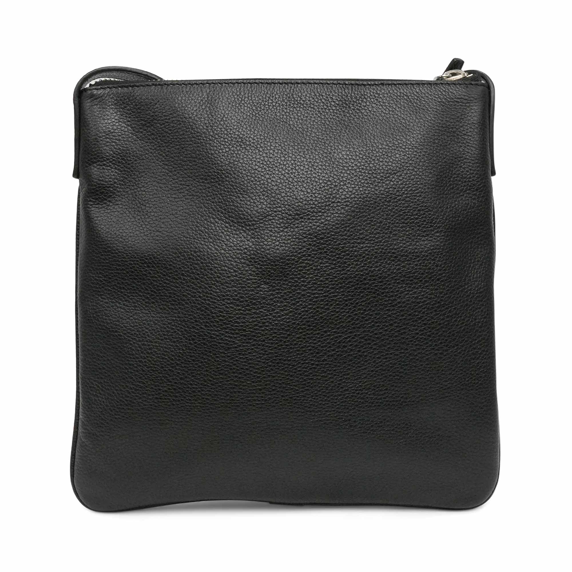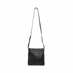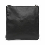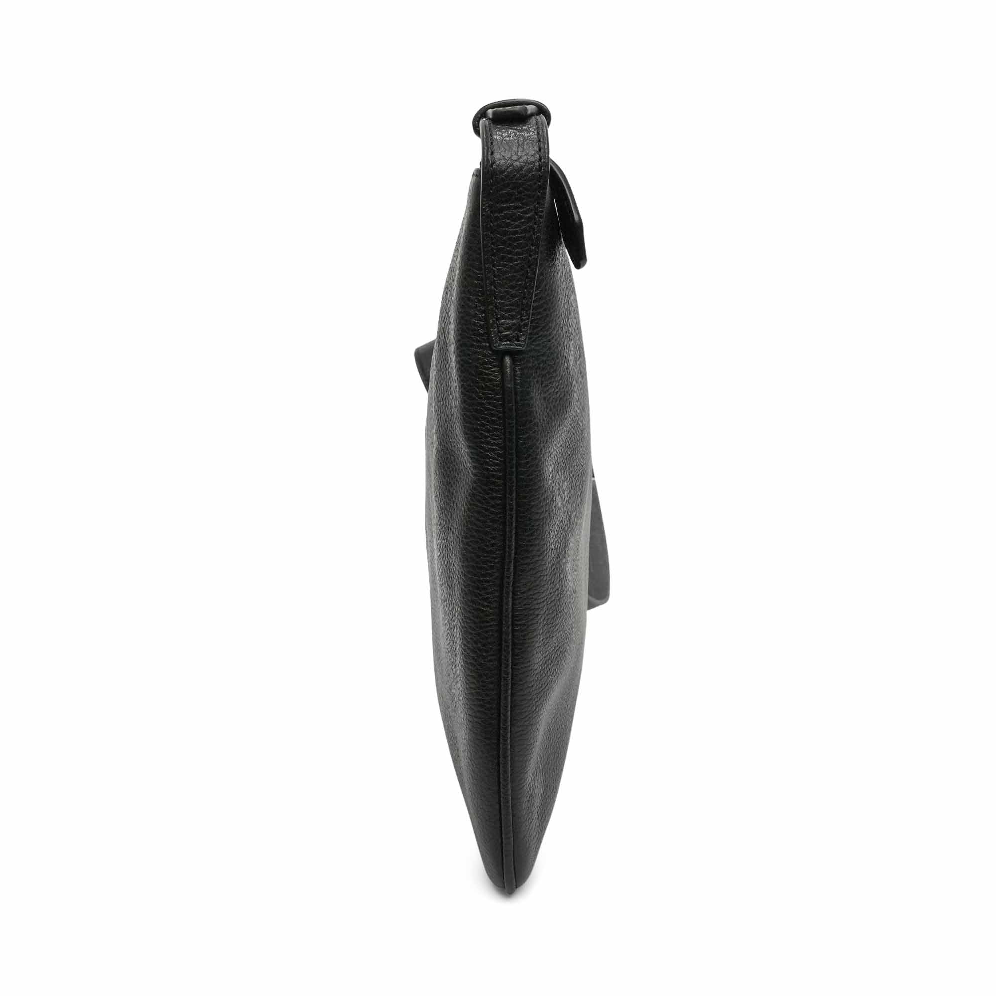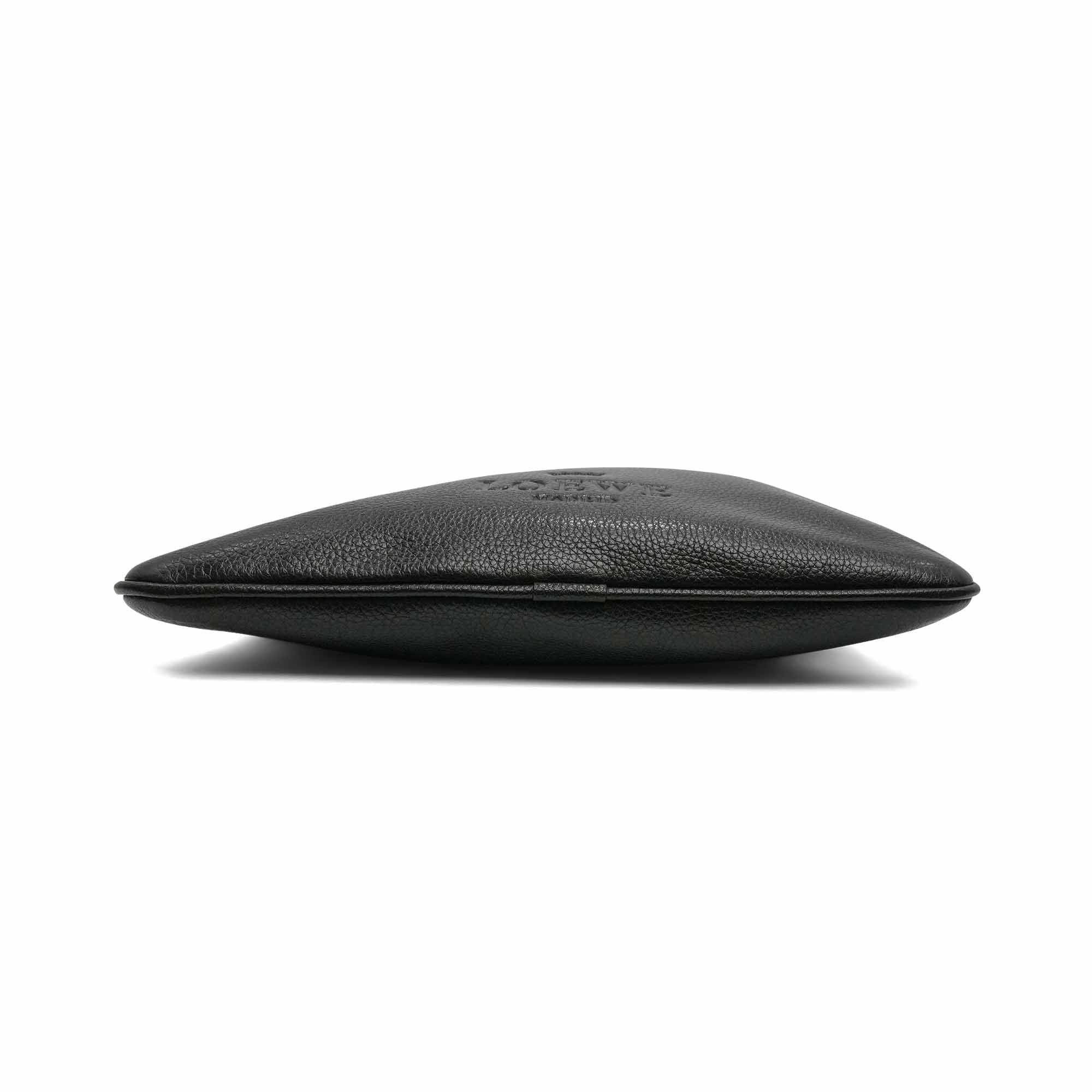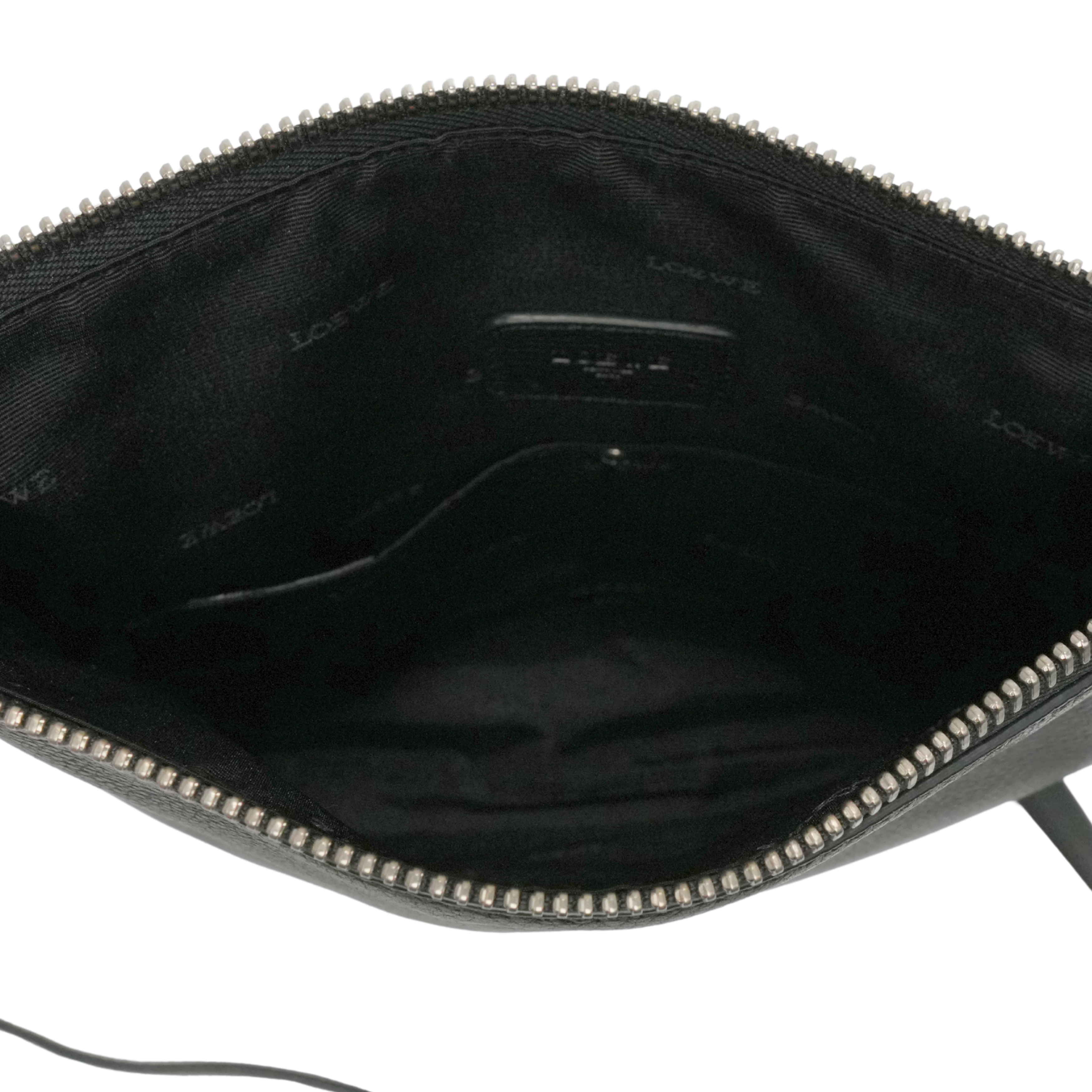 Loewe flat, crossbody bag in black pebbled leather. Features embossed logo on the front, adjustable crossbody strap, zip closure and two inner slip pockets.
