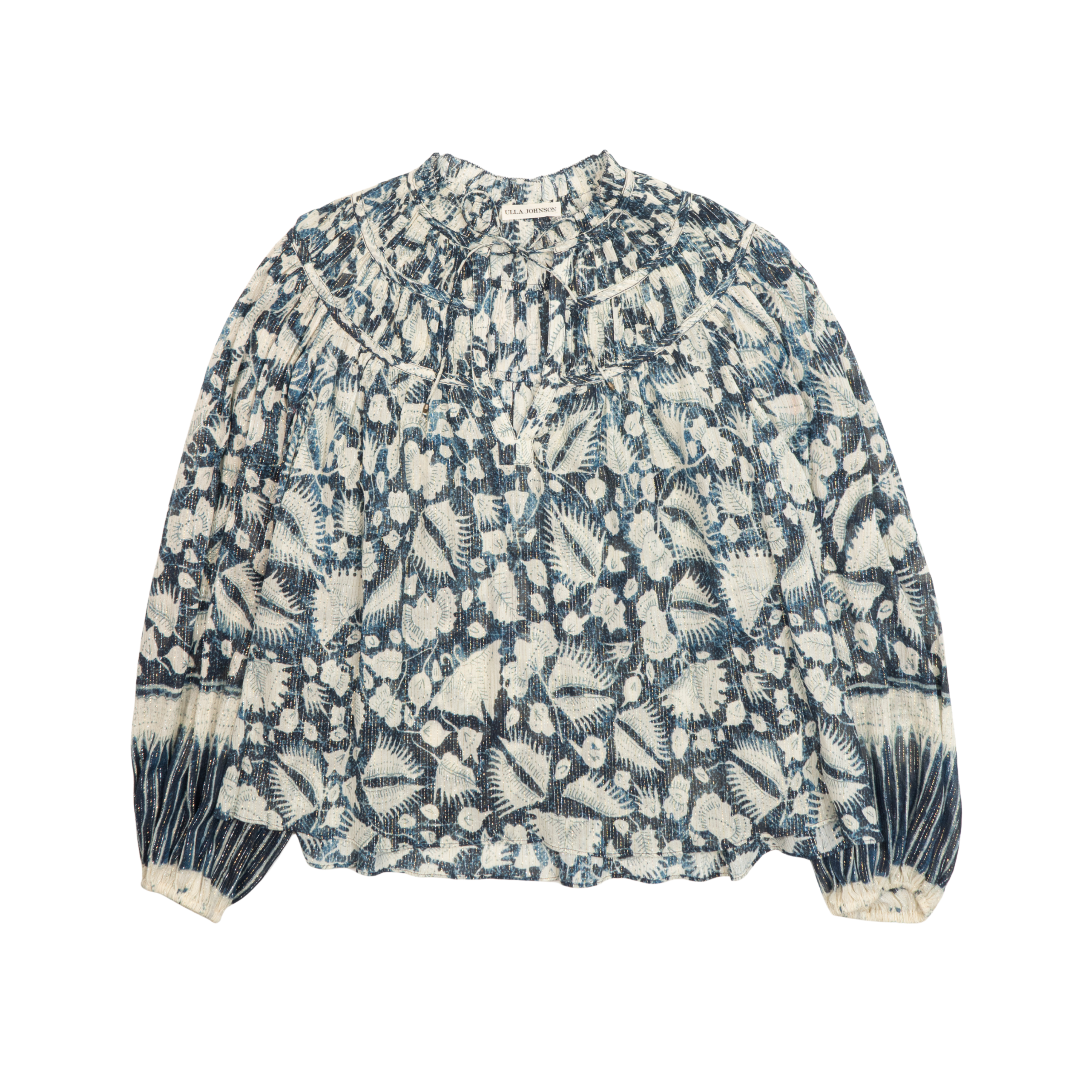 Ulla Johnson 'Yulia' blouse in a blue and cream floral silk blend with metallic lurex stripes throughout, ties at the neckline, pleating details, and a ruffle collar trim.