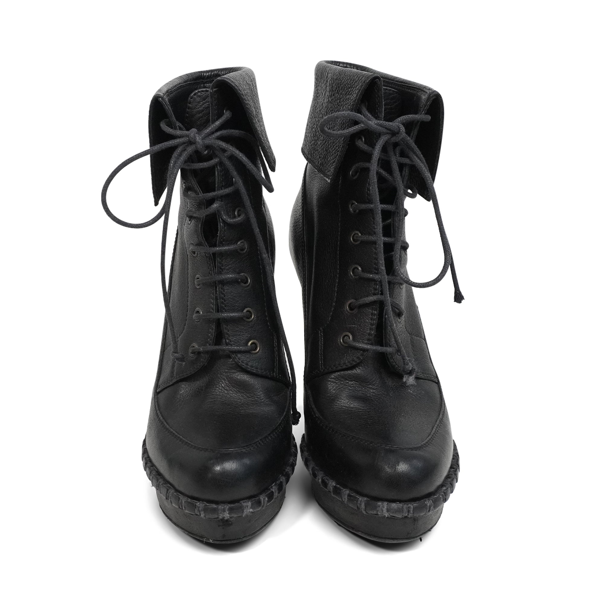 Yves Saint Laurent ankle booties in black leather with a lace up front, a fold-over ankle, and a platform sole. Features a braided stitch detail along the front sole.