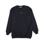 Acne Studios pullover crewneck sweater in navy blue cotton with a purple cross-stitched 'AS' logo embroidery on the chest.