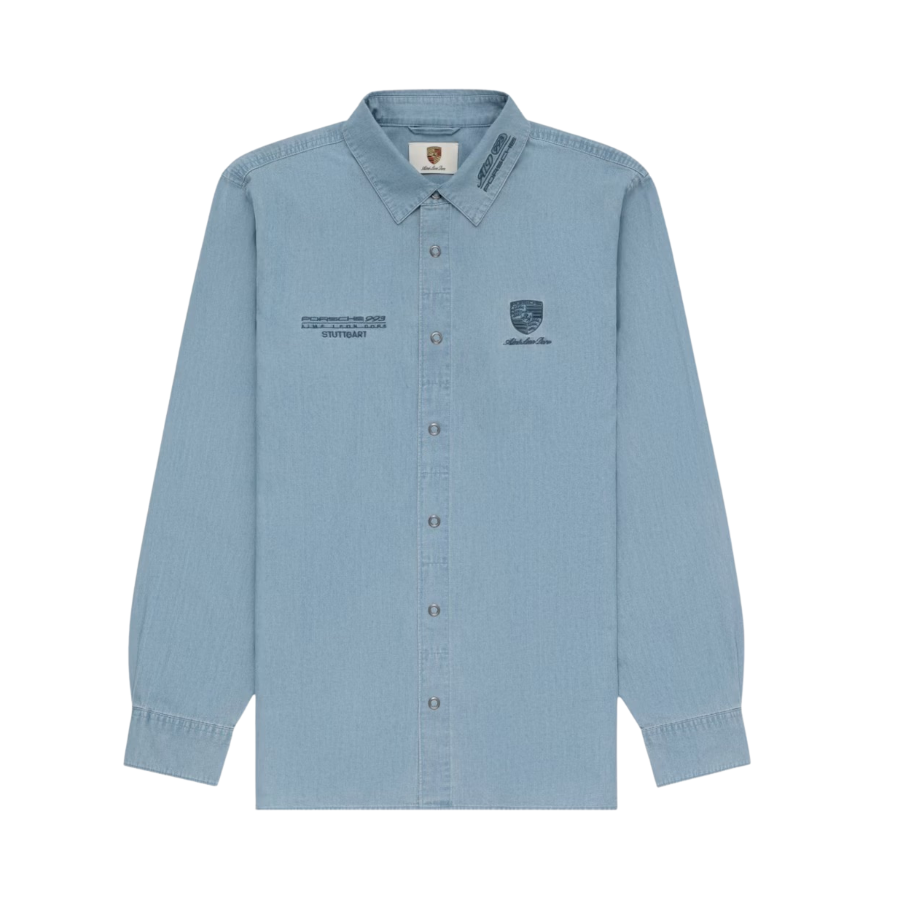 Aime Leon Dore x Porsche longsleeve button down shirt in light blue denim with small embroidered chest logos and embroidery on the collar. Featuring pleated back yoke and barrel cuffs.