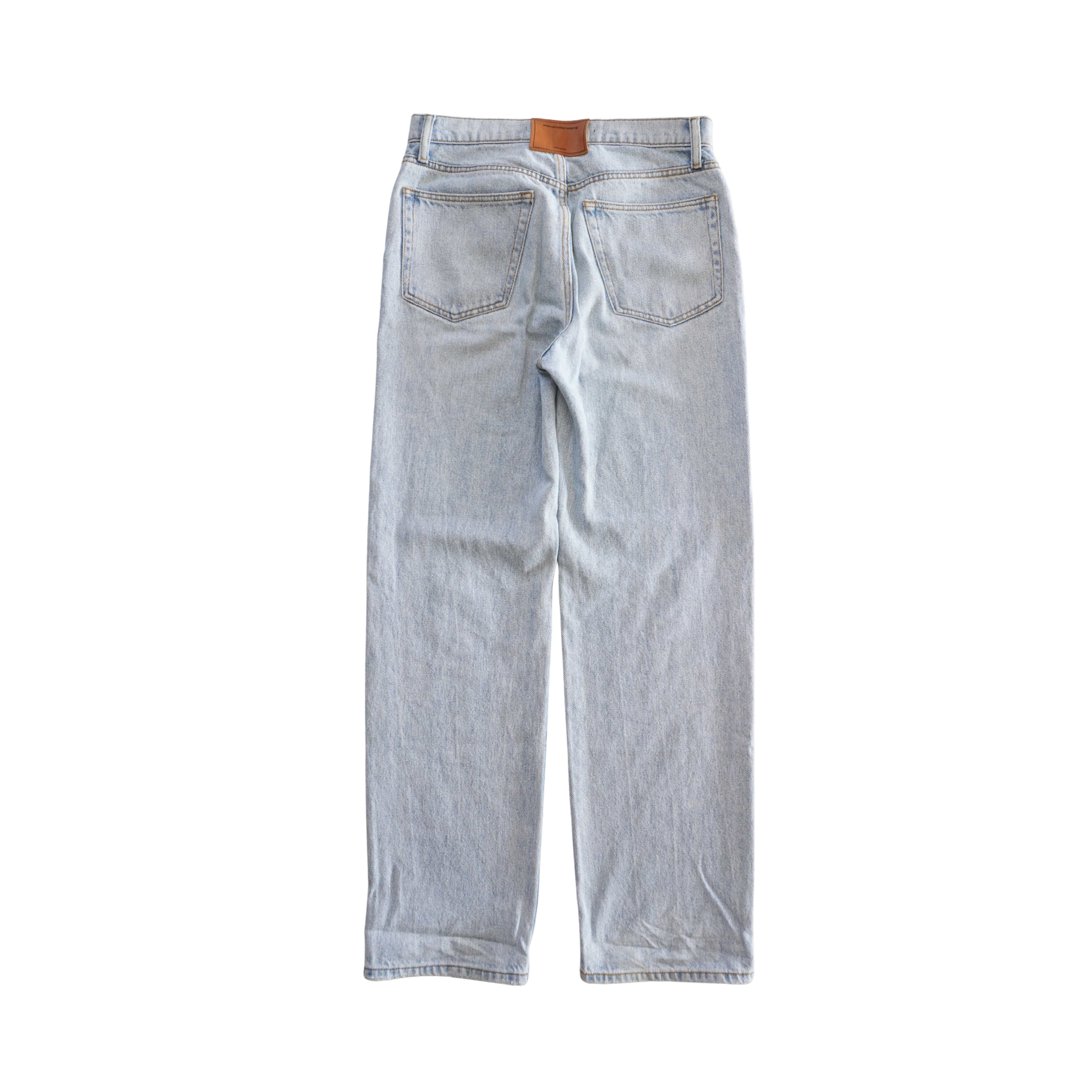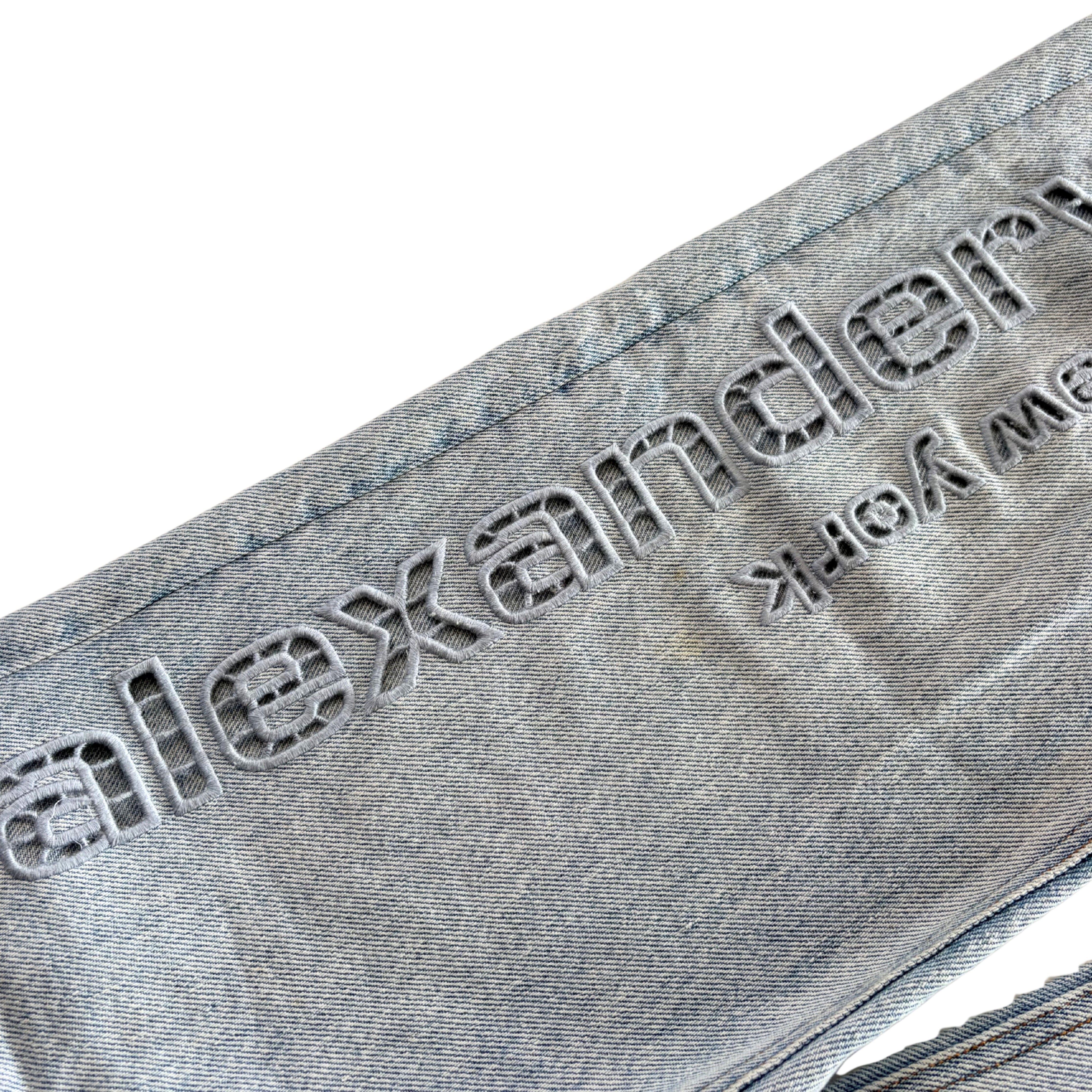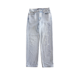 Alexander Wang 'EZ Cut-Out Logo' jeans in light washed blue denim with a high rise, a straight leg, and a cutout logo down the leg.