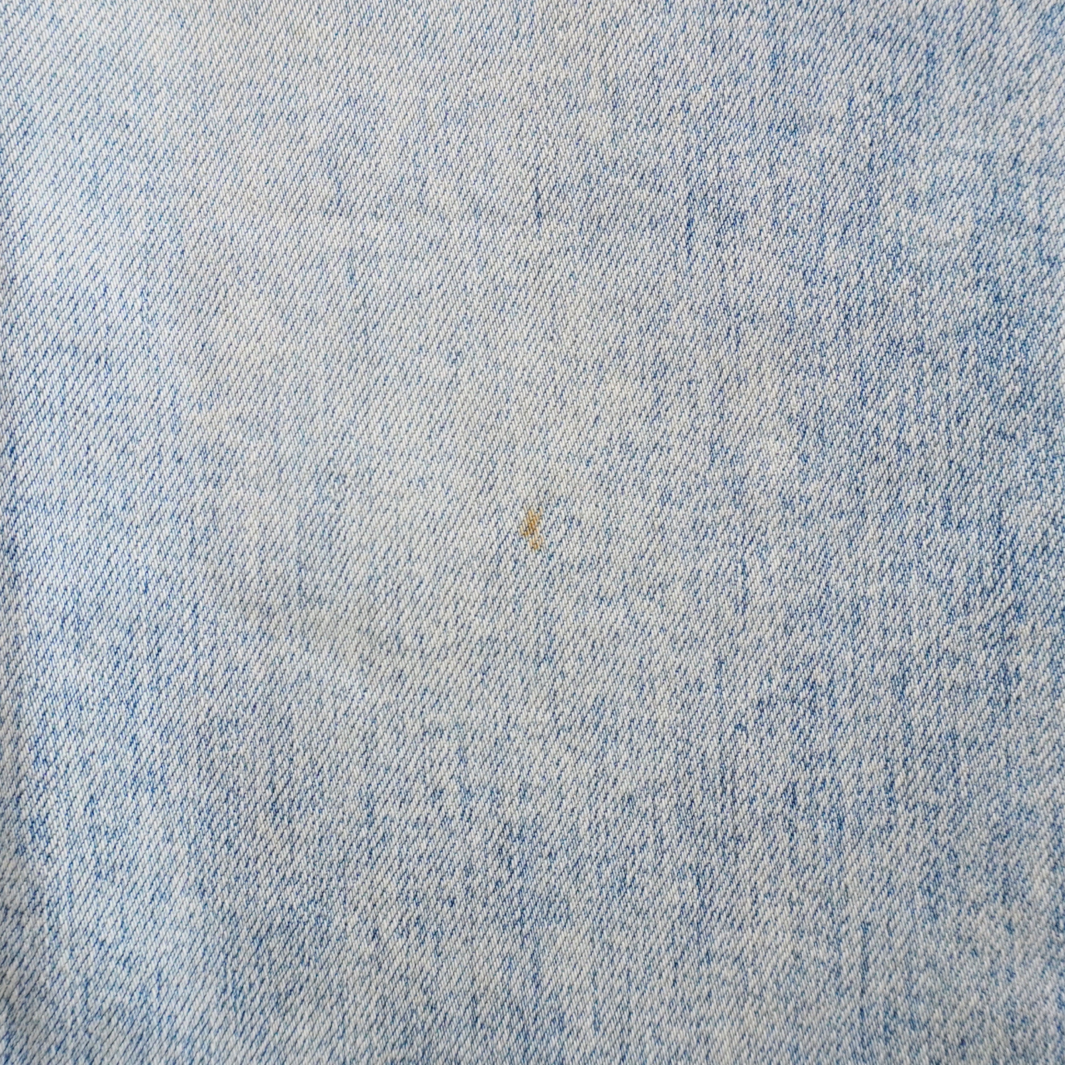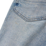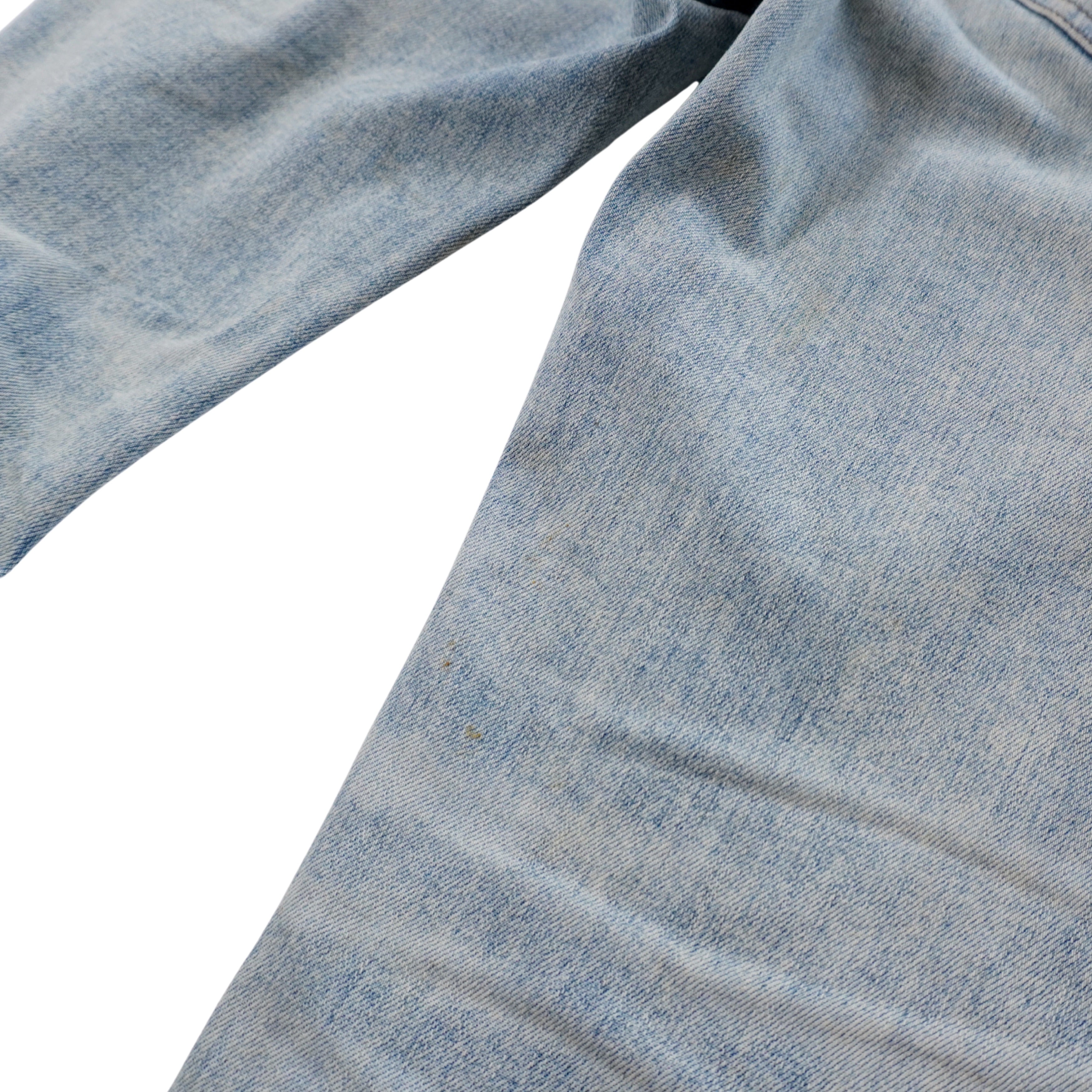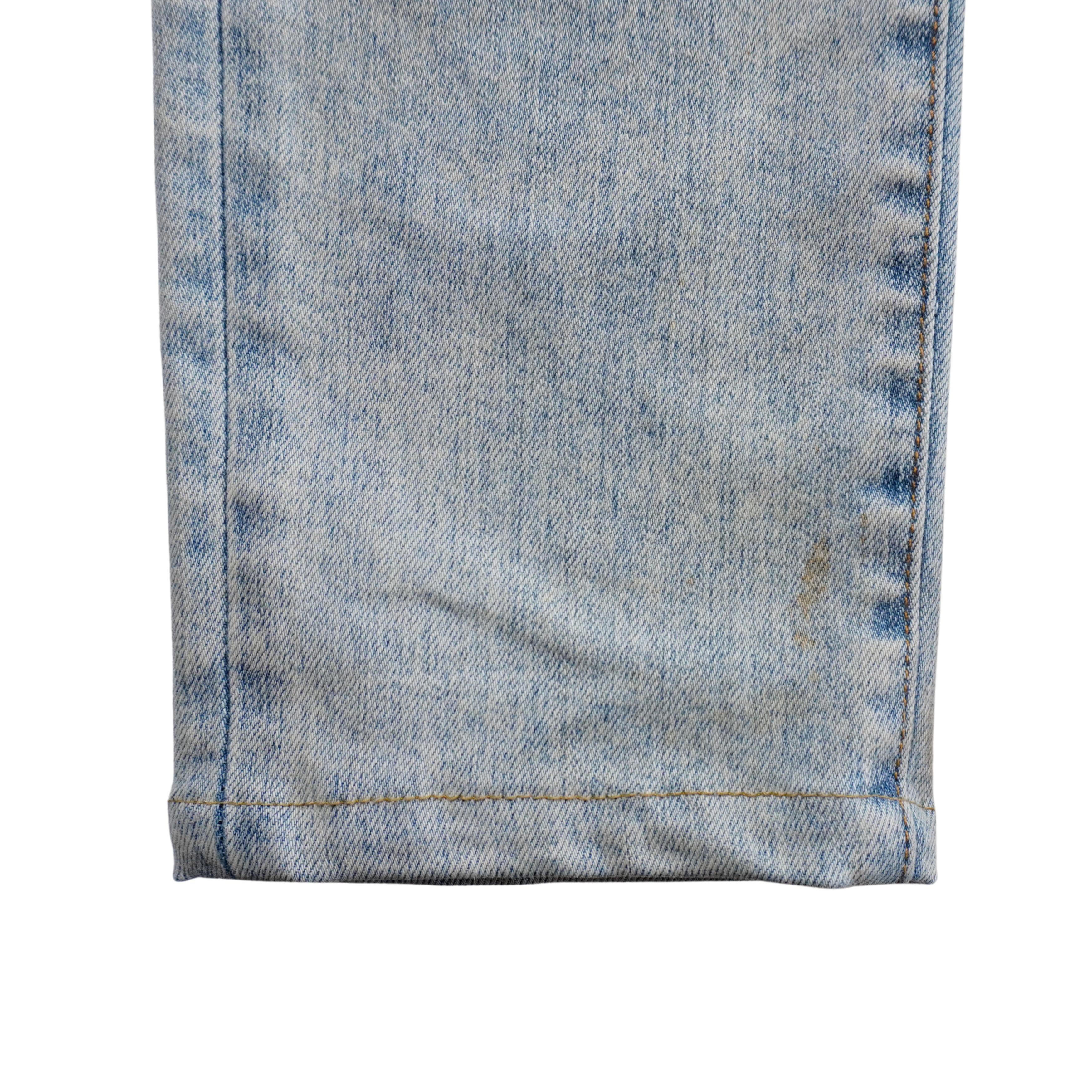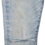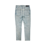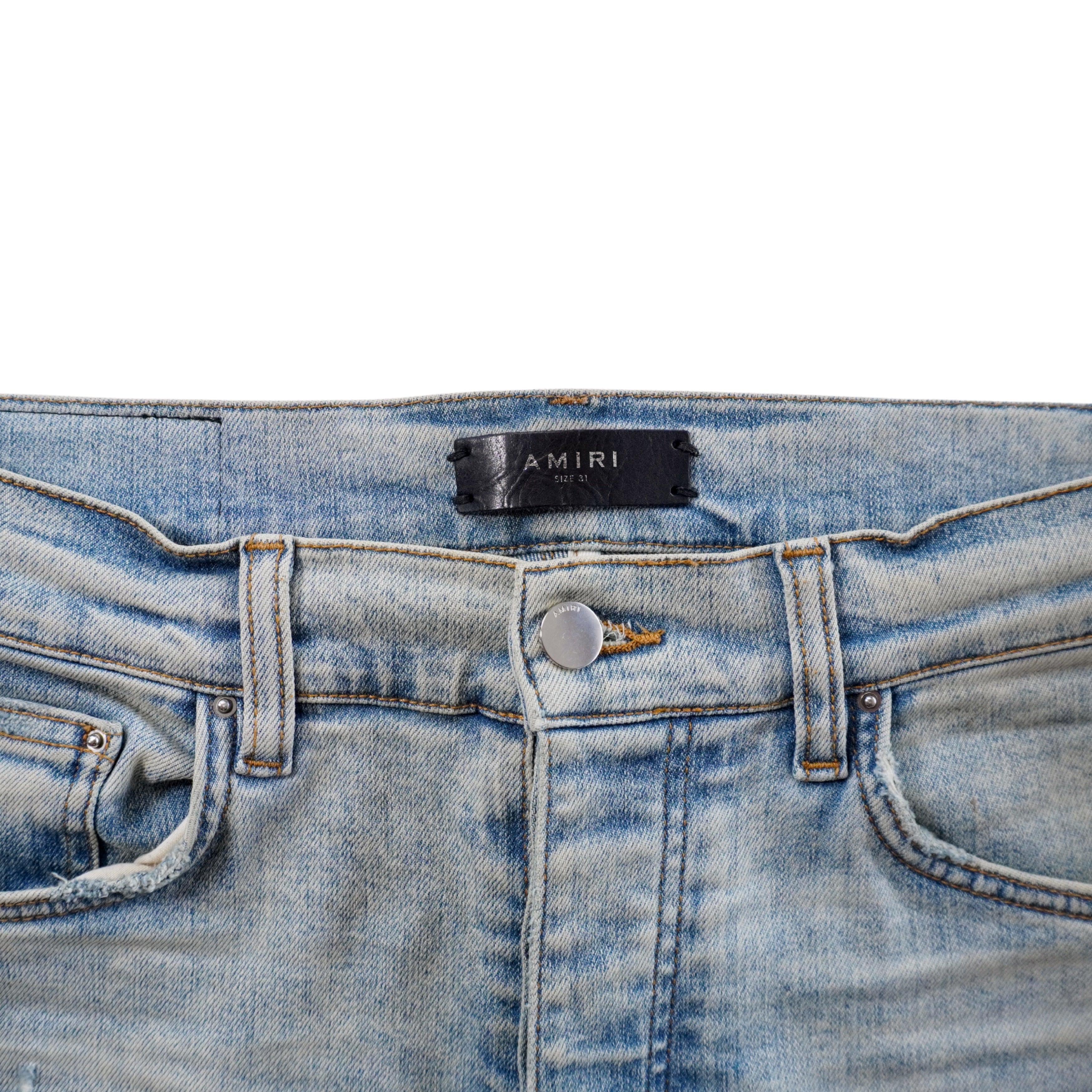 Amiri skinny jeans in light acid washed blue denim with rip distressing at the knees, silver button hardware, and a black leather logo patch on the back waistband.