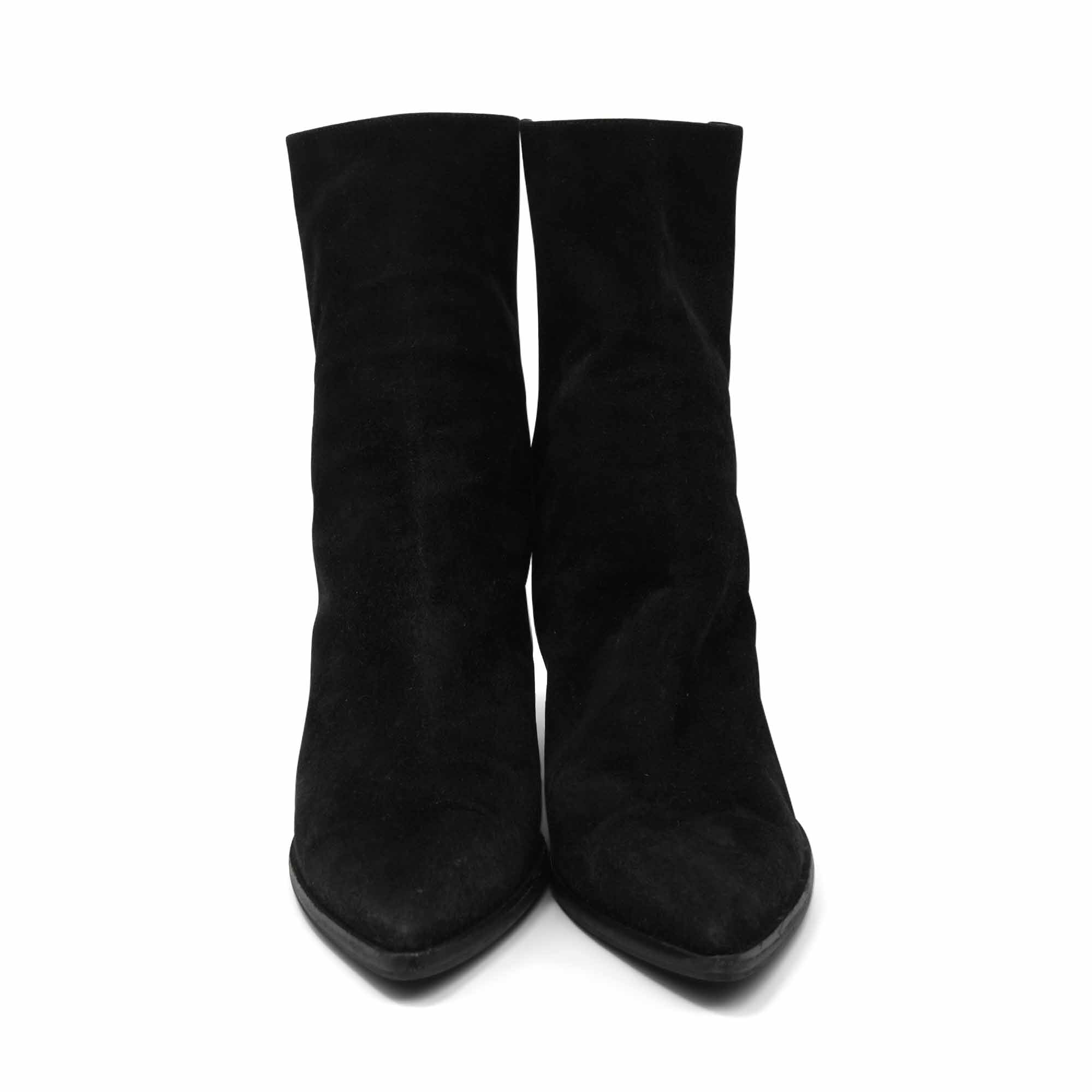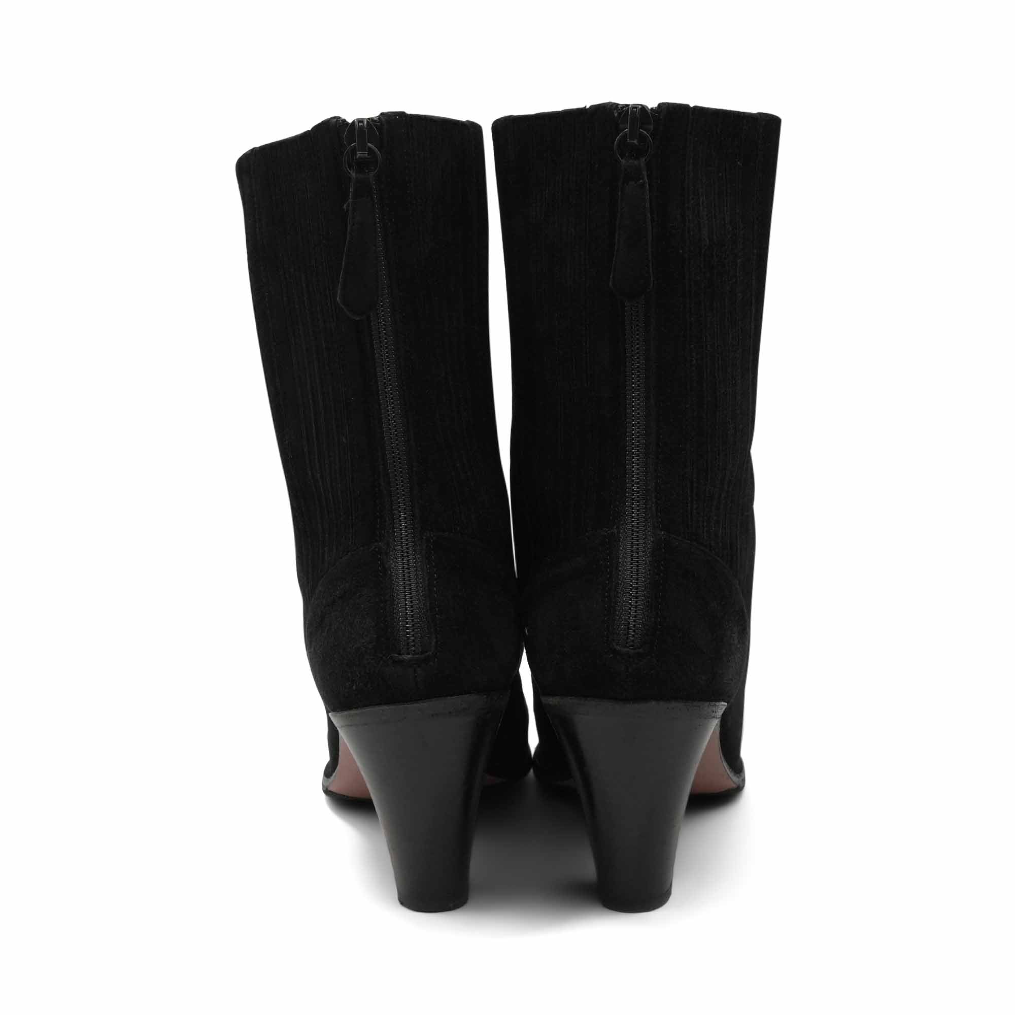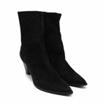Aquazzura pointed-toe ankle boots in black suede with an elasticated ankle, back zipper and stacked heel.