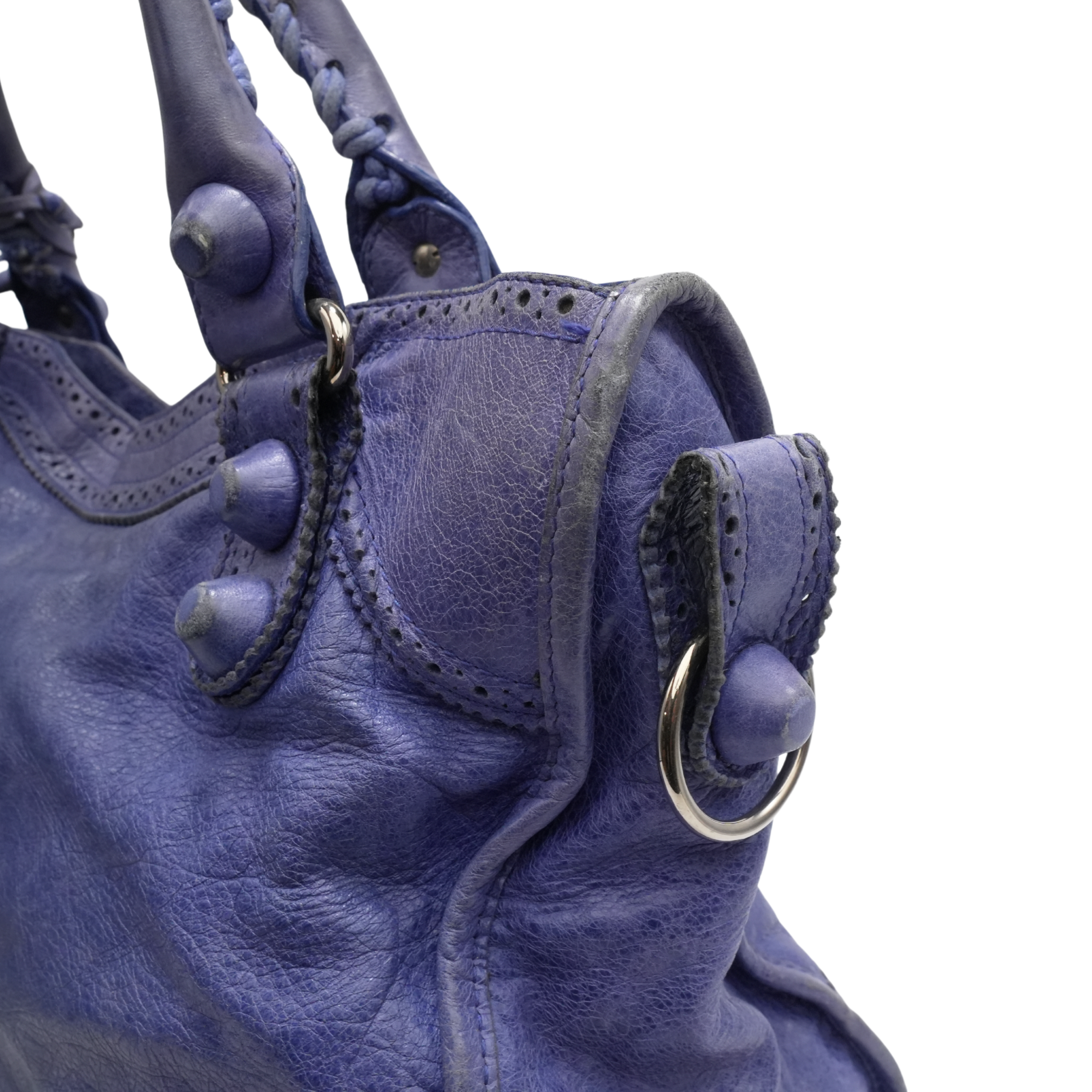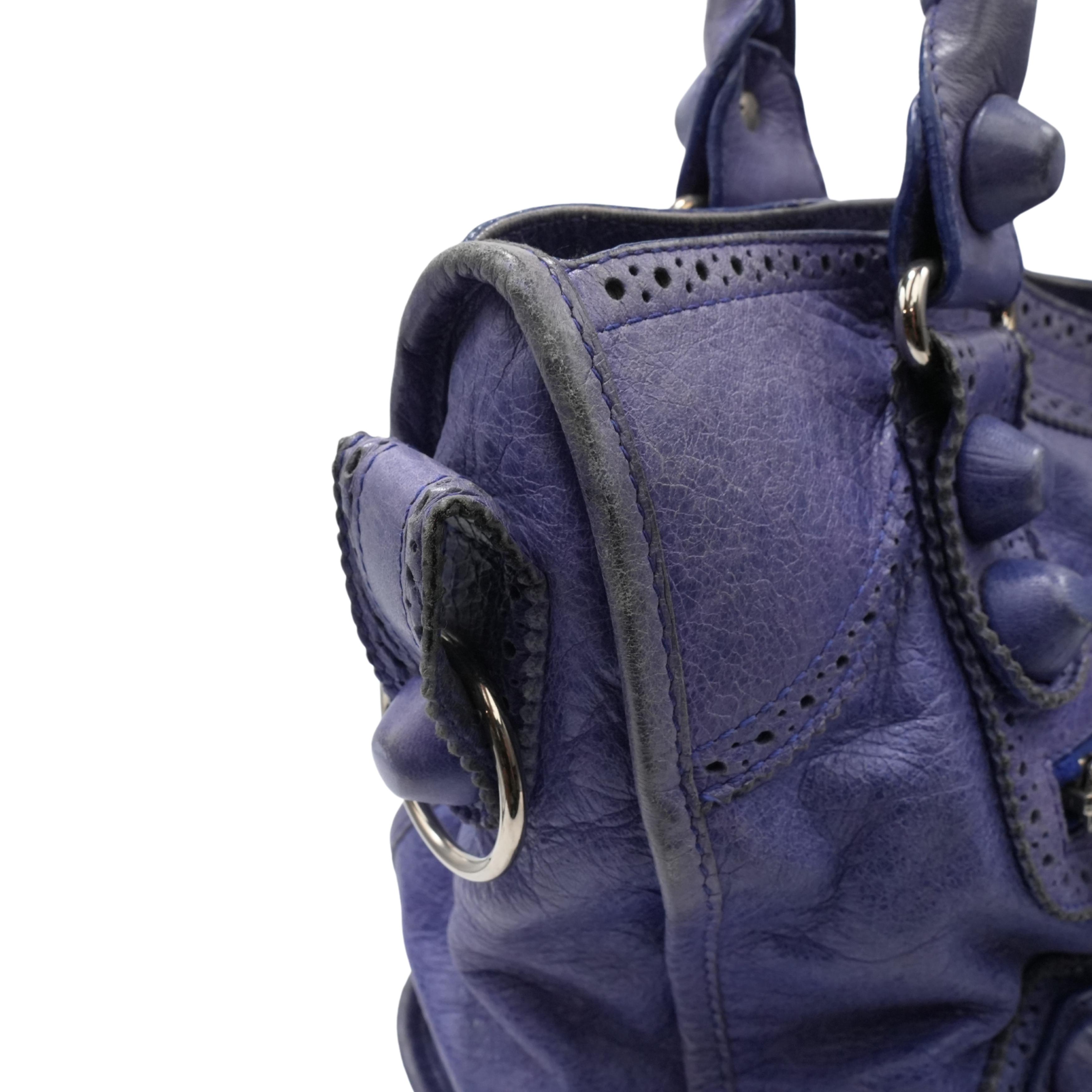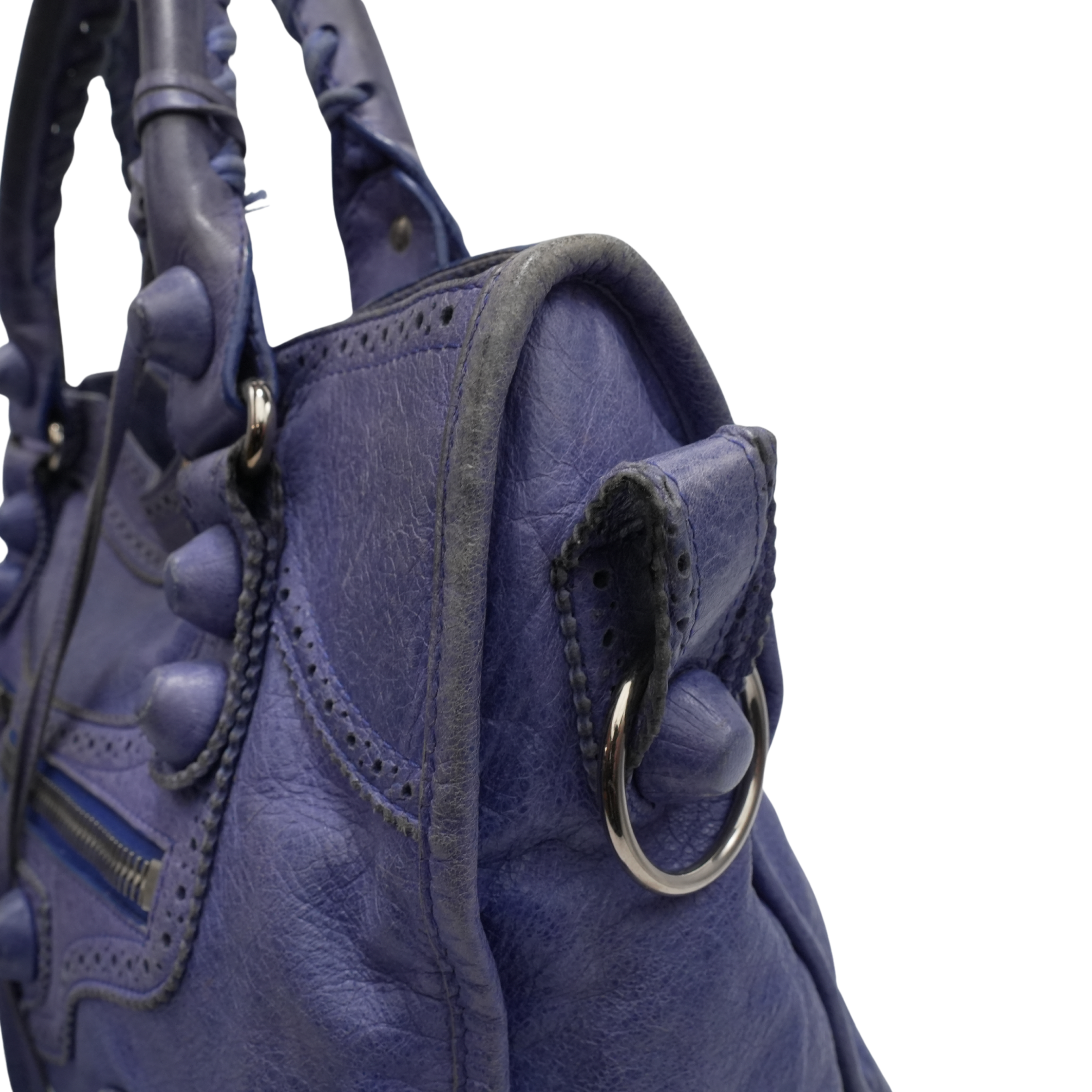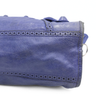 Balenciaga 'City' bag in blue leather silver hardware throughout and 'Giant Brogue' studding. Features a two-way zip closure with elongated leather zipper pulls and a black fabric lining with a zip pocket. The bag has top handles with whipstitch detailing and a removable leather shoulder strap. Includes leather framed mirror.