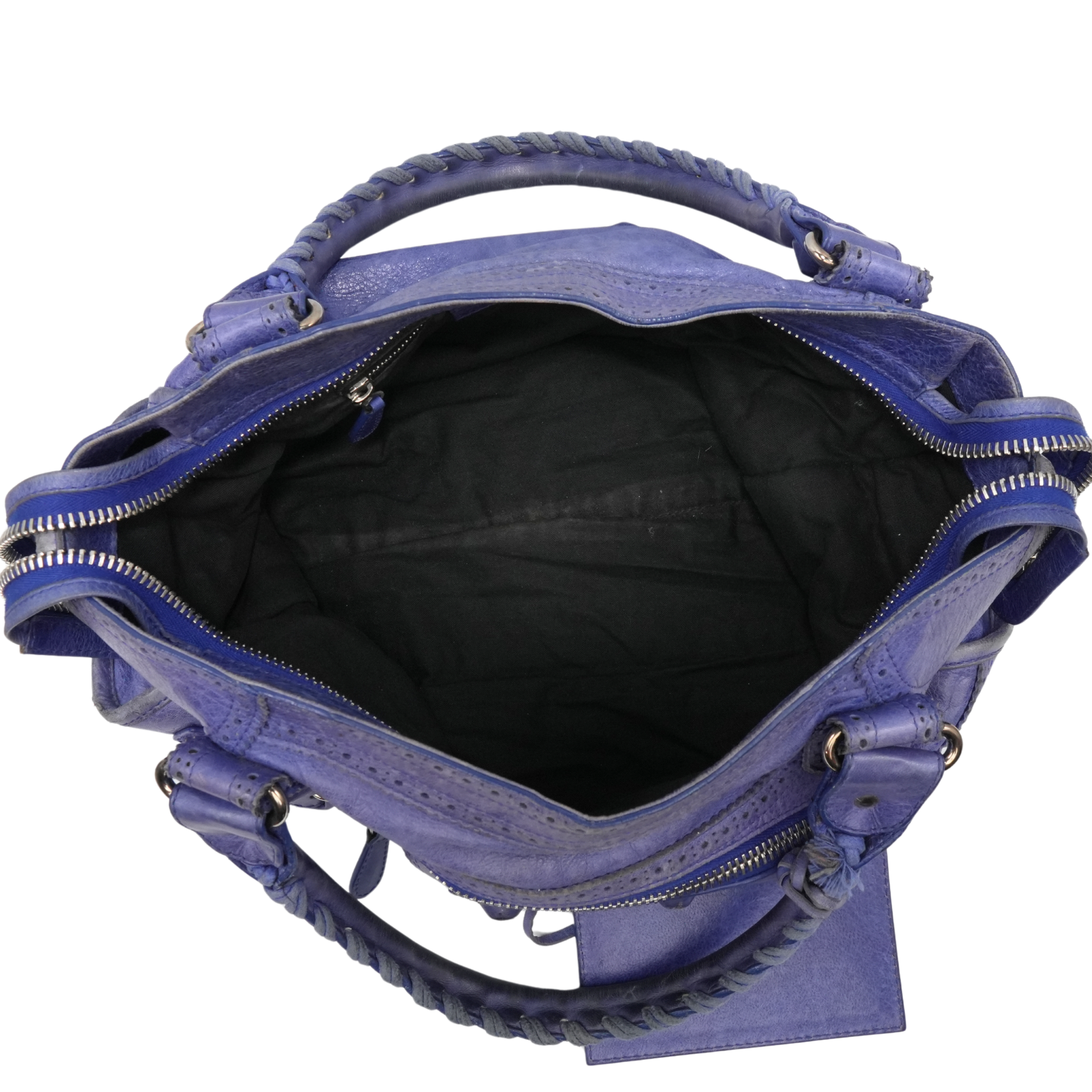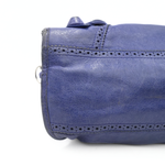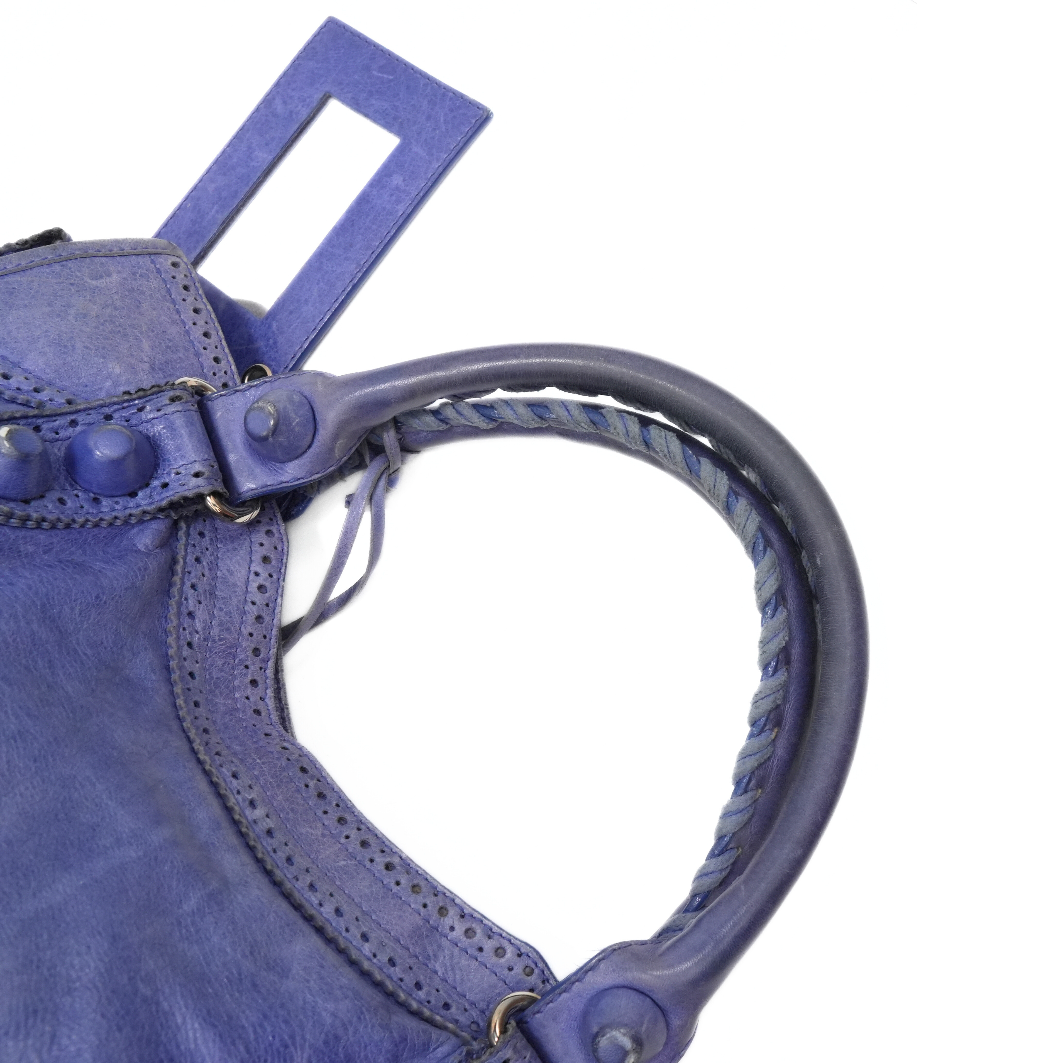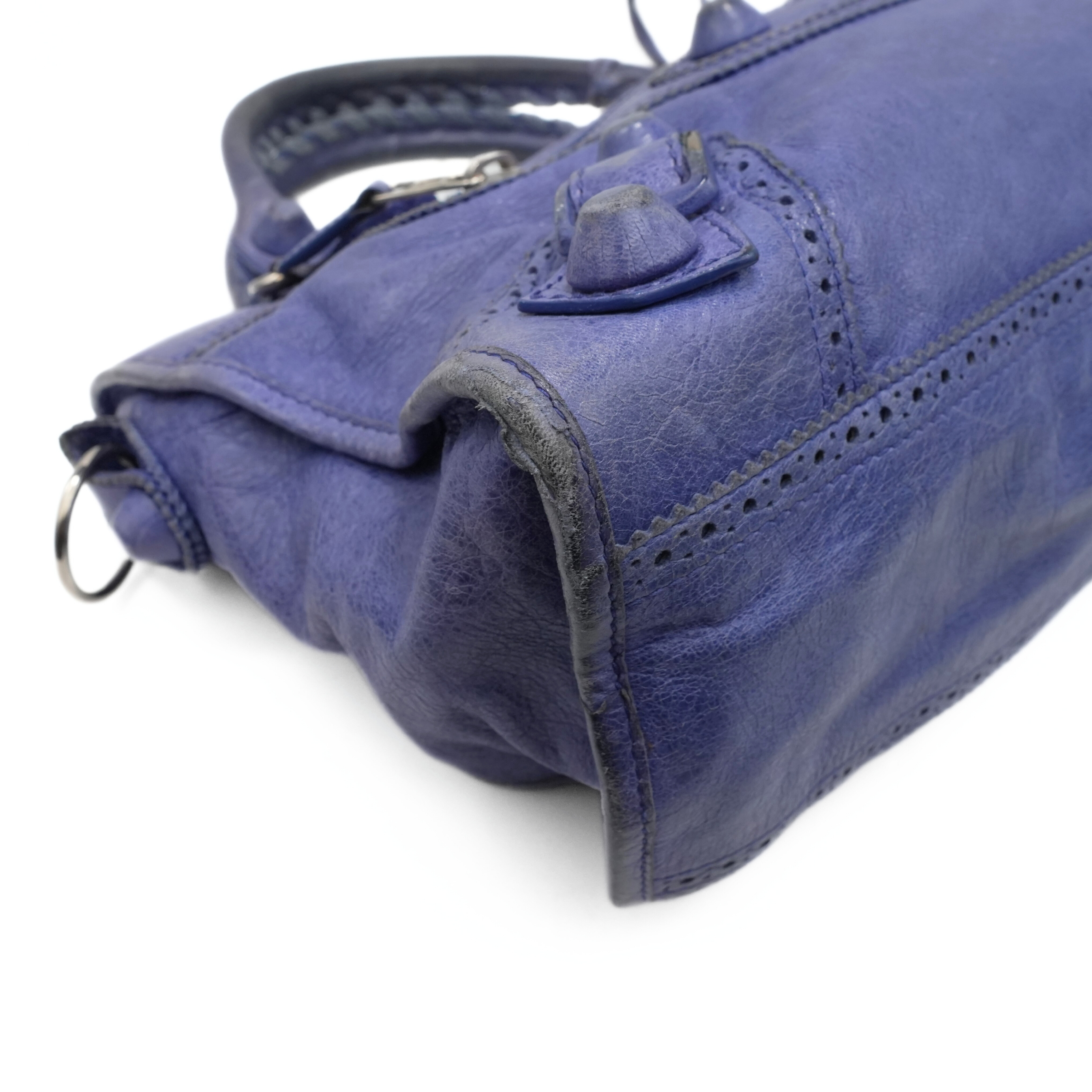 Balenciaga 'City' bag in blue leather silver hardware throughout and 'Giant Brogue' studding. Features a two-way zip closure with elongated leather zipper pulls and a black fabric lining with a zip pocket. The bag has top handles with whipstitch detailing and a removable leather shoulder strap. Includes leather framed mirror.
