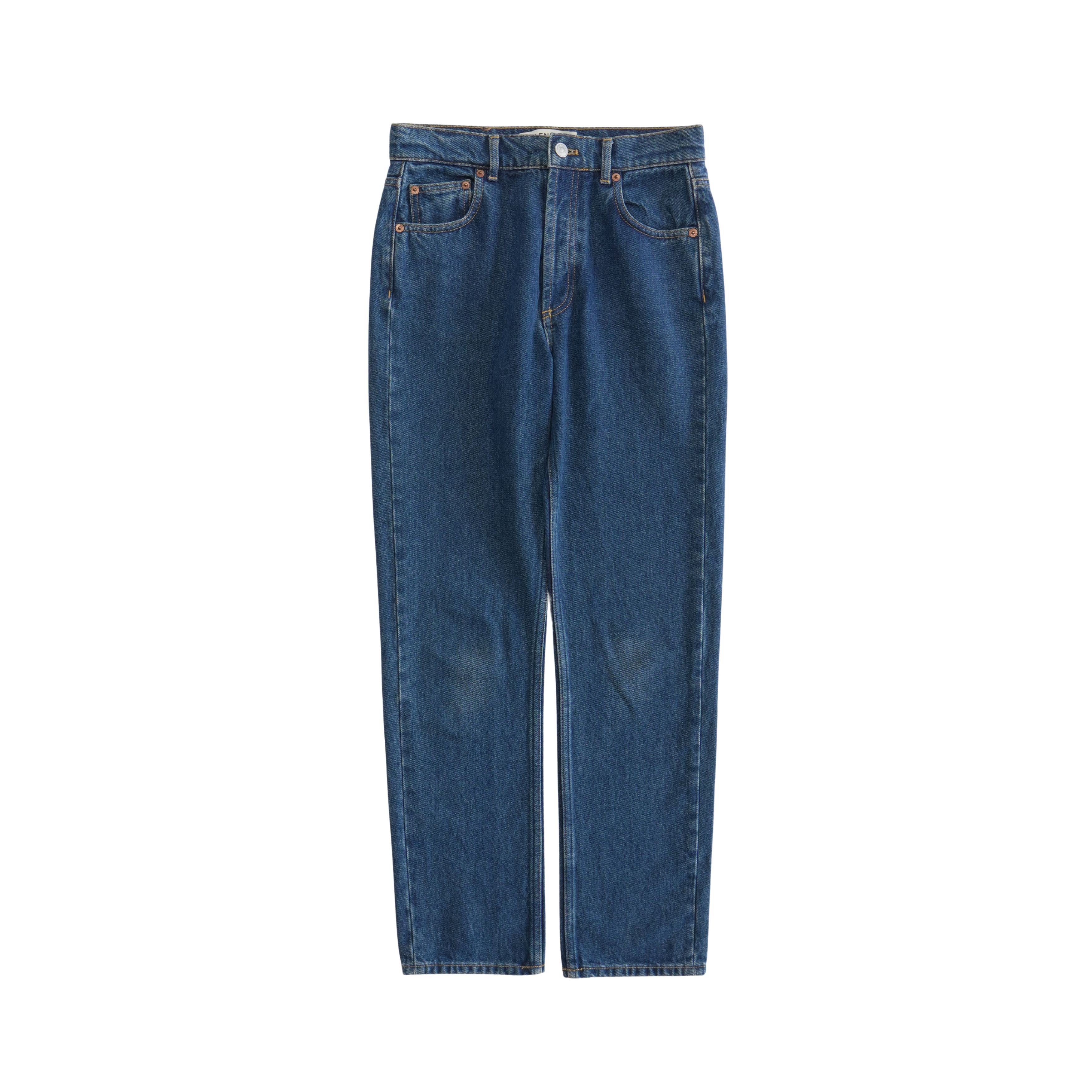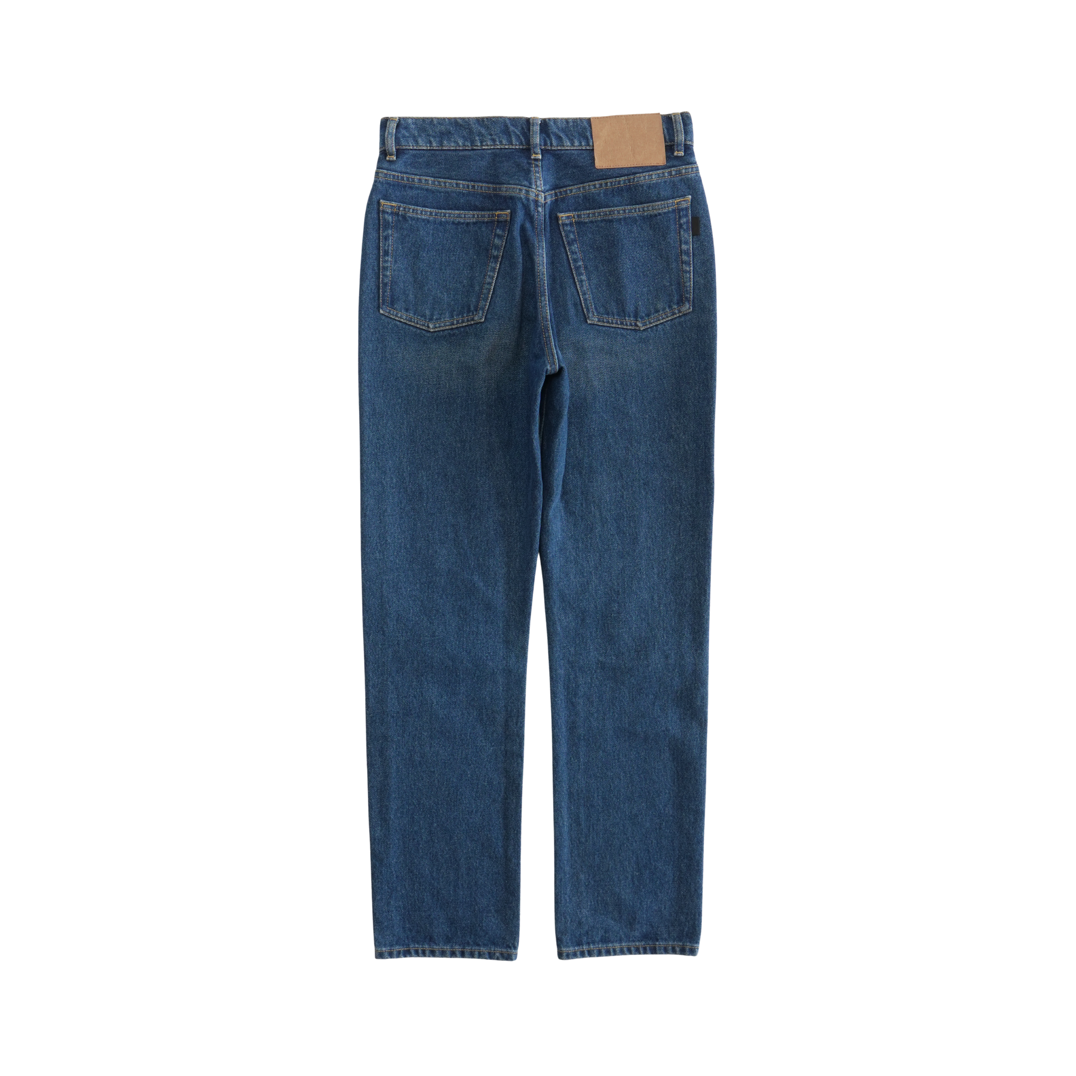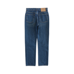 Balenciaga high-waisted jeans in medium wash blue denim with a brown leather logo patch at the back waistline and a straight leg fit.