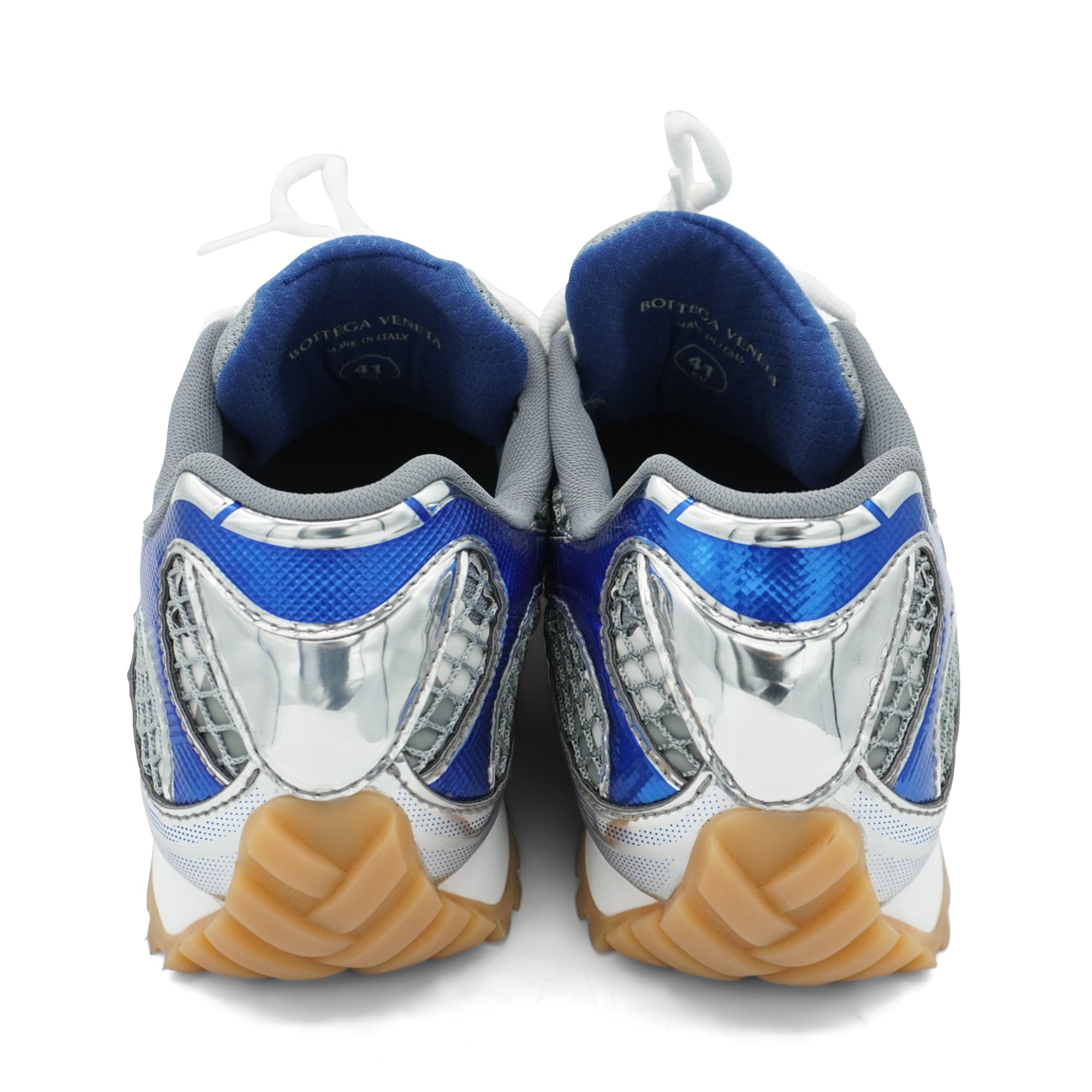 Bottega Veneta 'Orbit' sneakers in metallic silver and blue leather with mesh panelling and a cream and white rubber sole.