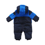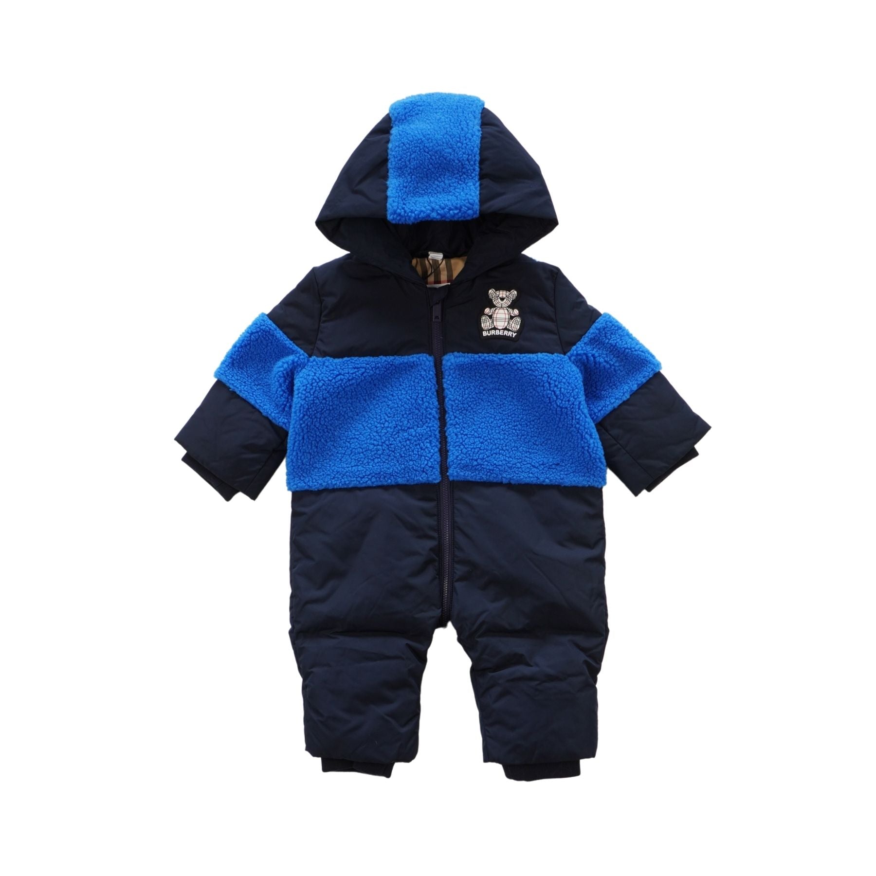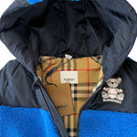 Burberry Children snowsuit in navy blue nylon with blue shearling panel on the front, arms, and hood. Features a full front-to-back zip closure, navy blue elasticized arm and leg cuffs, a hood, a white teddy bear logo patch on the front, and beige novacheck interior lining.