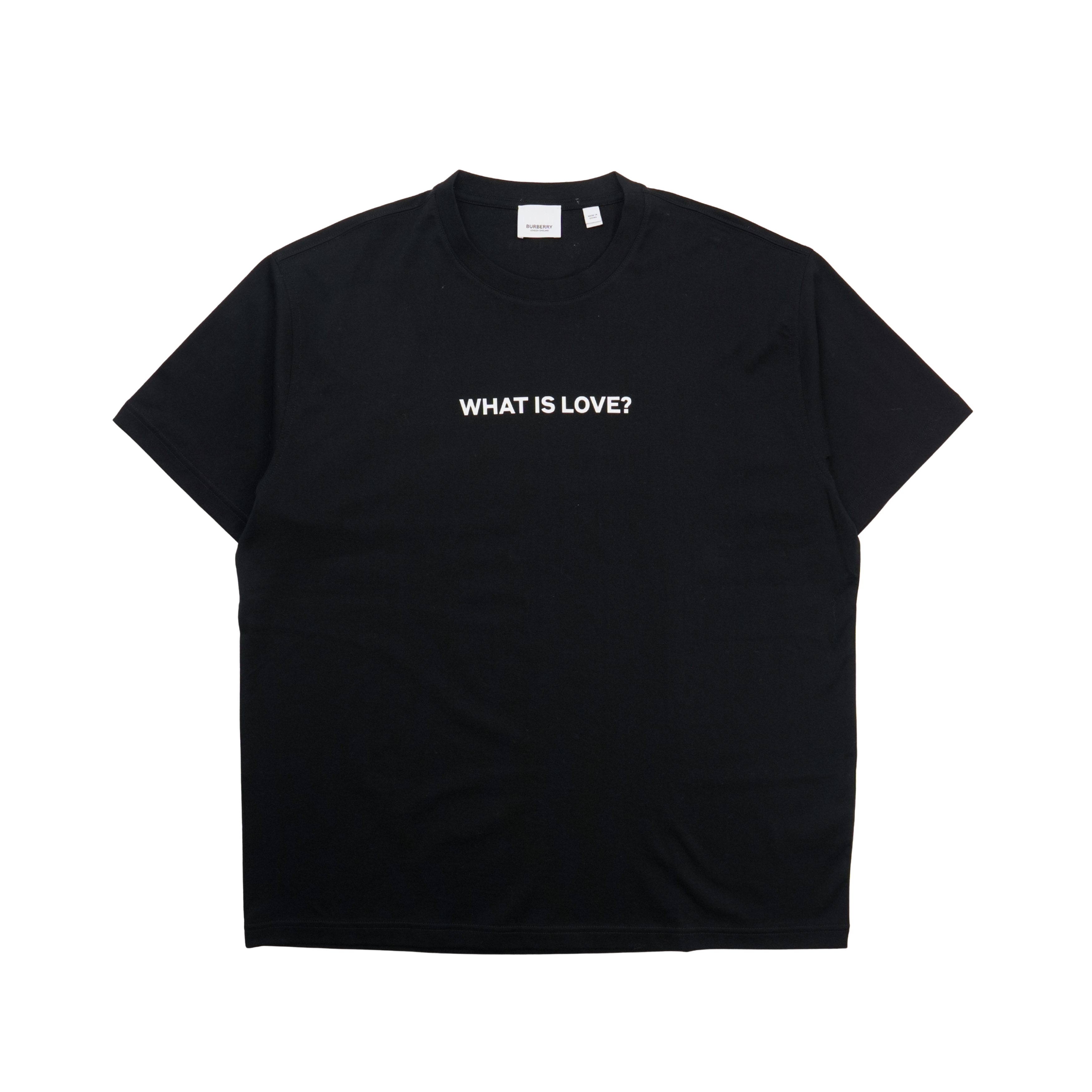 Burberry black t-shirt with white 'WHAT IS LOVE' graphic on the chest.