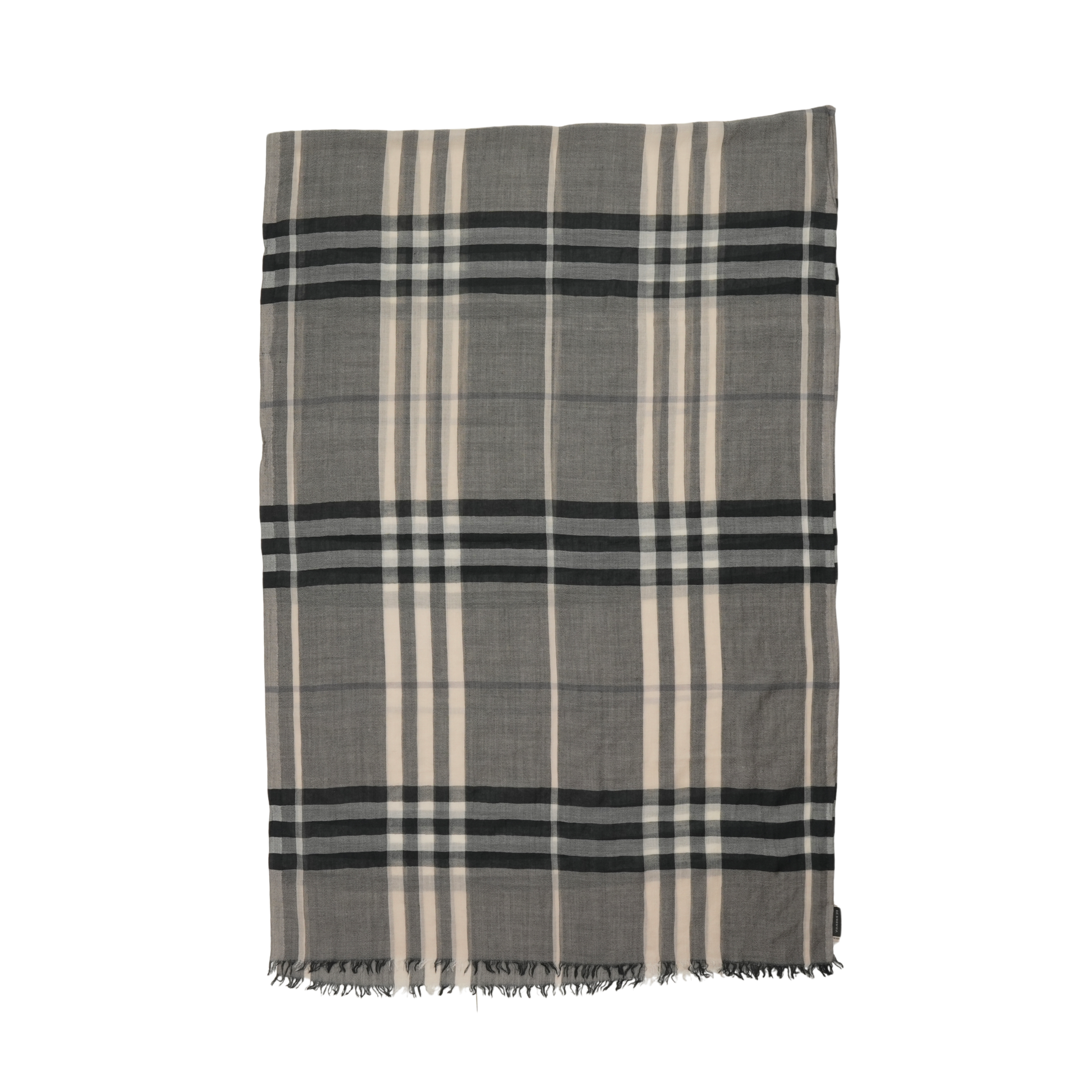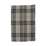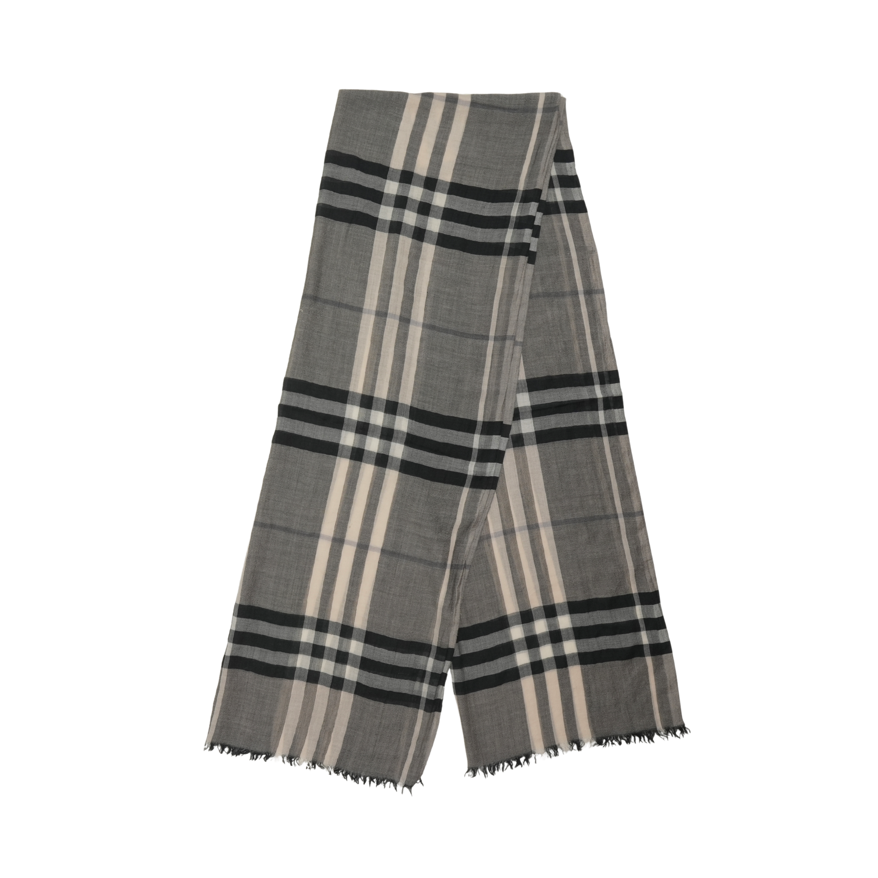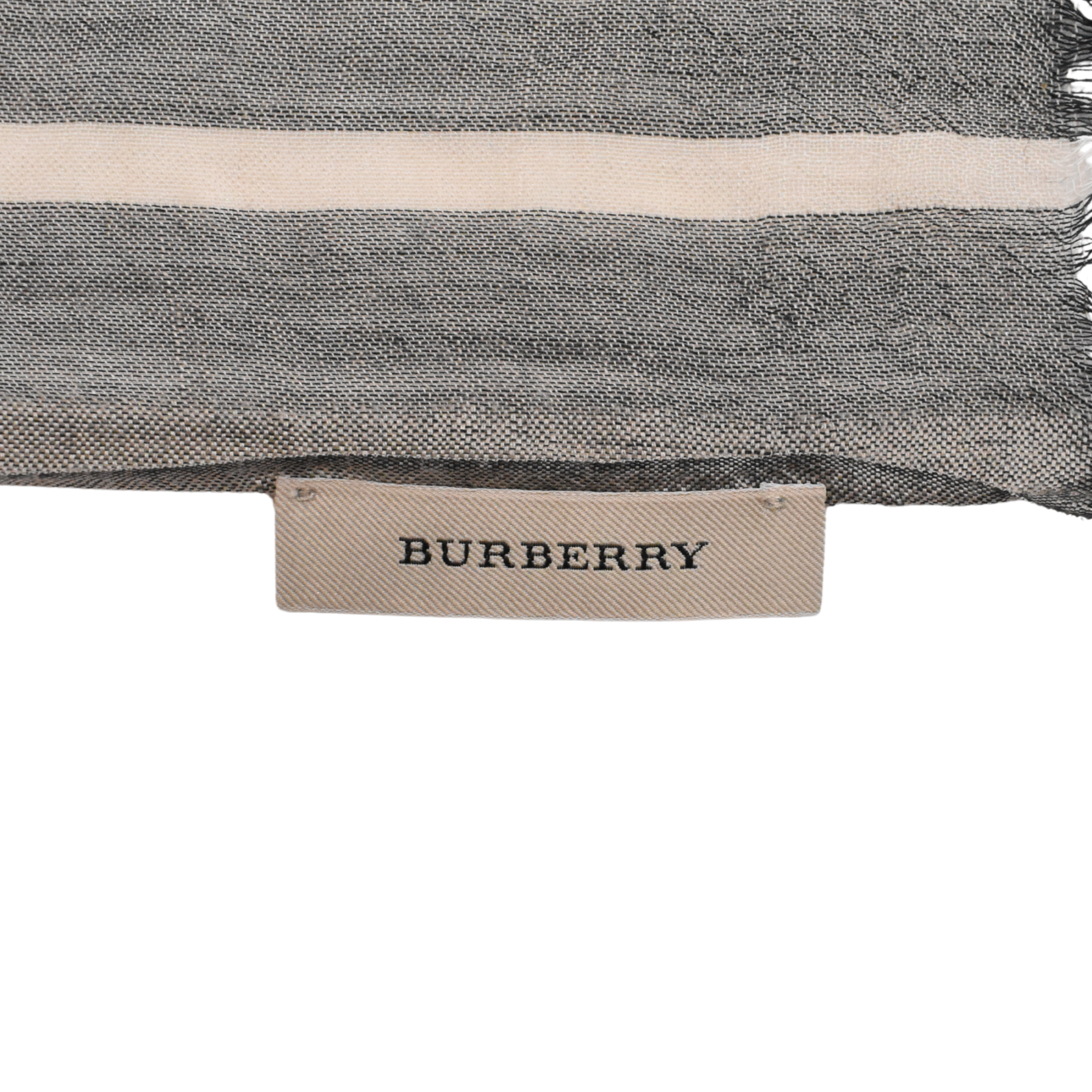 Burberry semi-sheer scarf in a cream, grey and black wool-silk blend with an all over novacheck pattern and frayed hems.