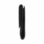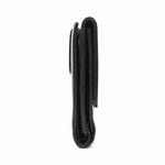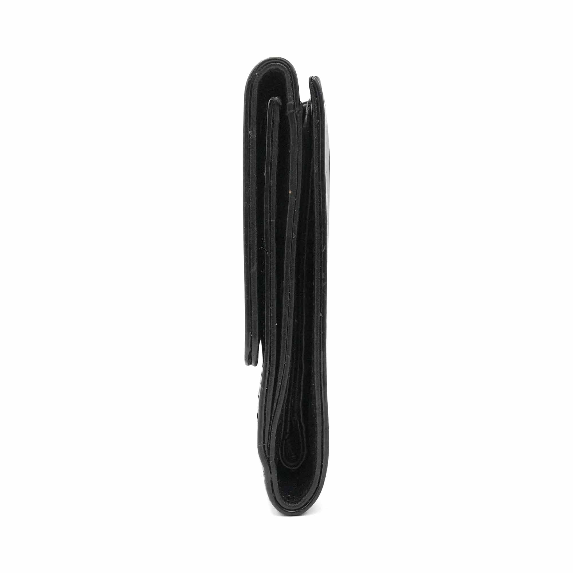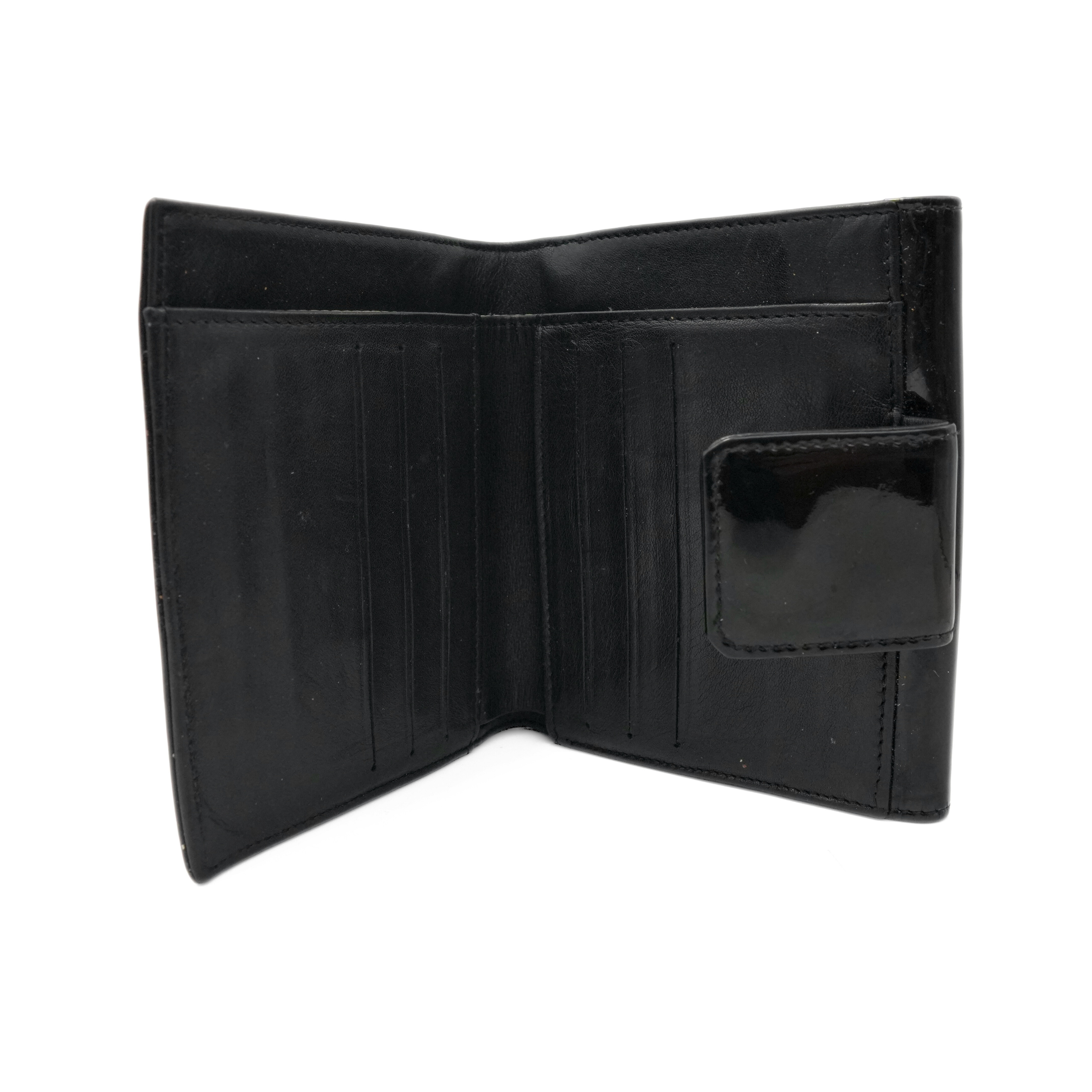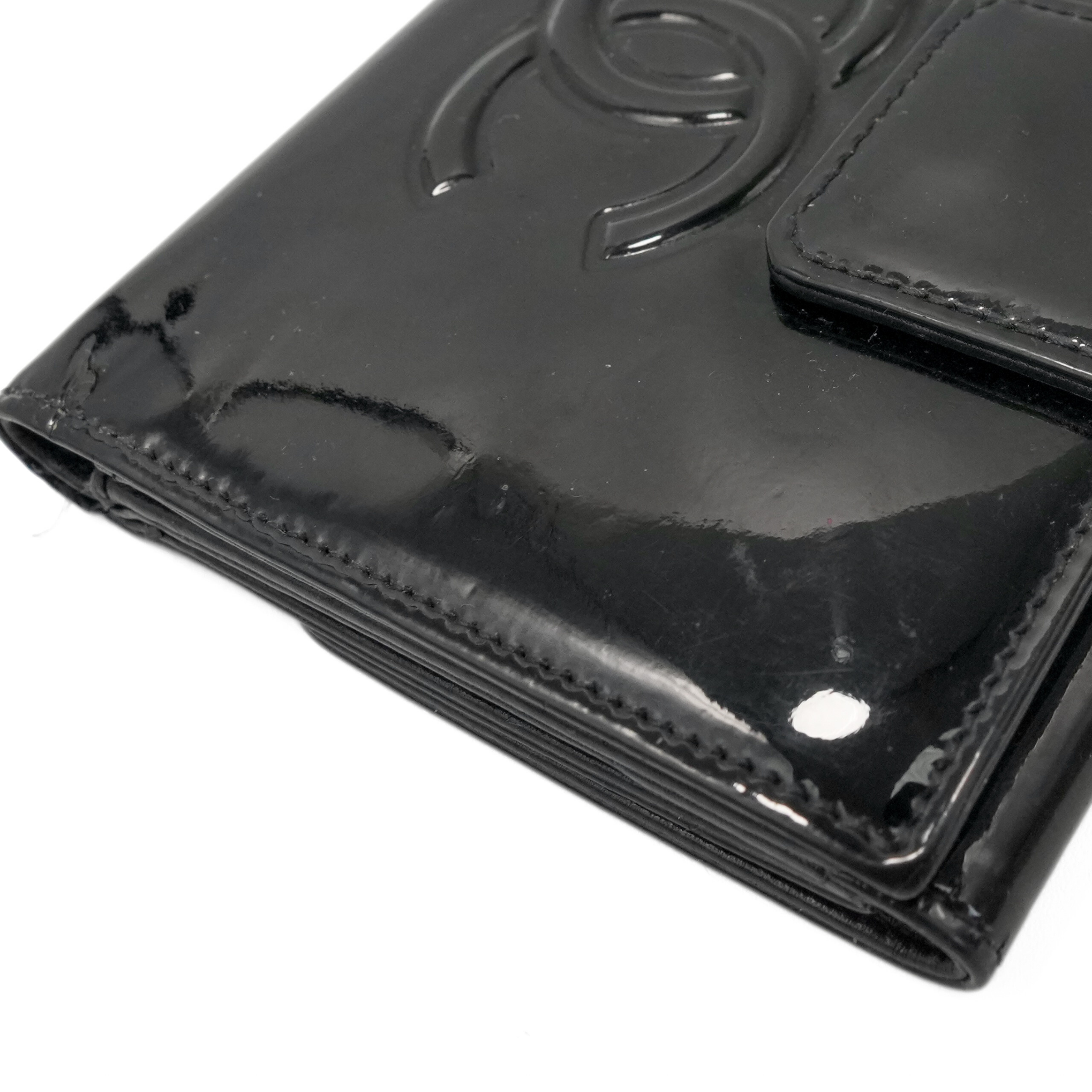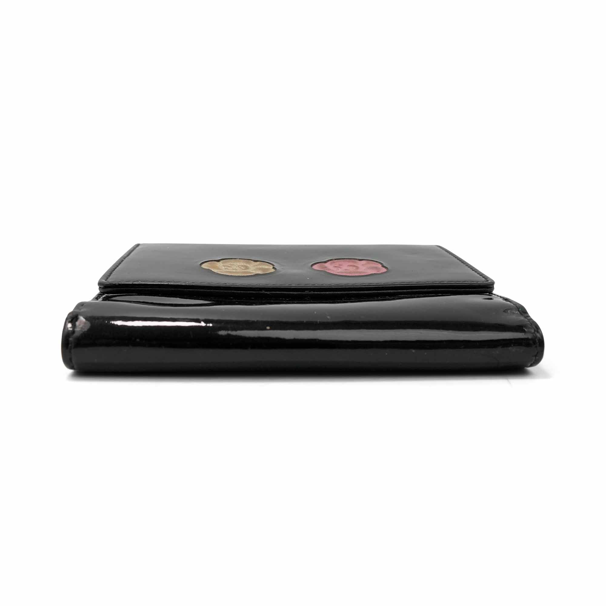 Chanel french wallet in black patent leather with pink and cream 'Camellia' flower appliqués on the front, a snap opening on to the coin pocket, a back embossed 'CC' logo, and snap opening to the main wallet compartment on the back.