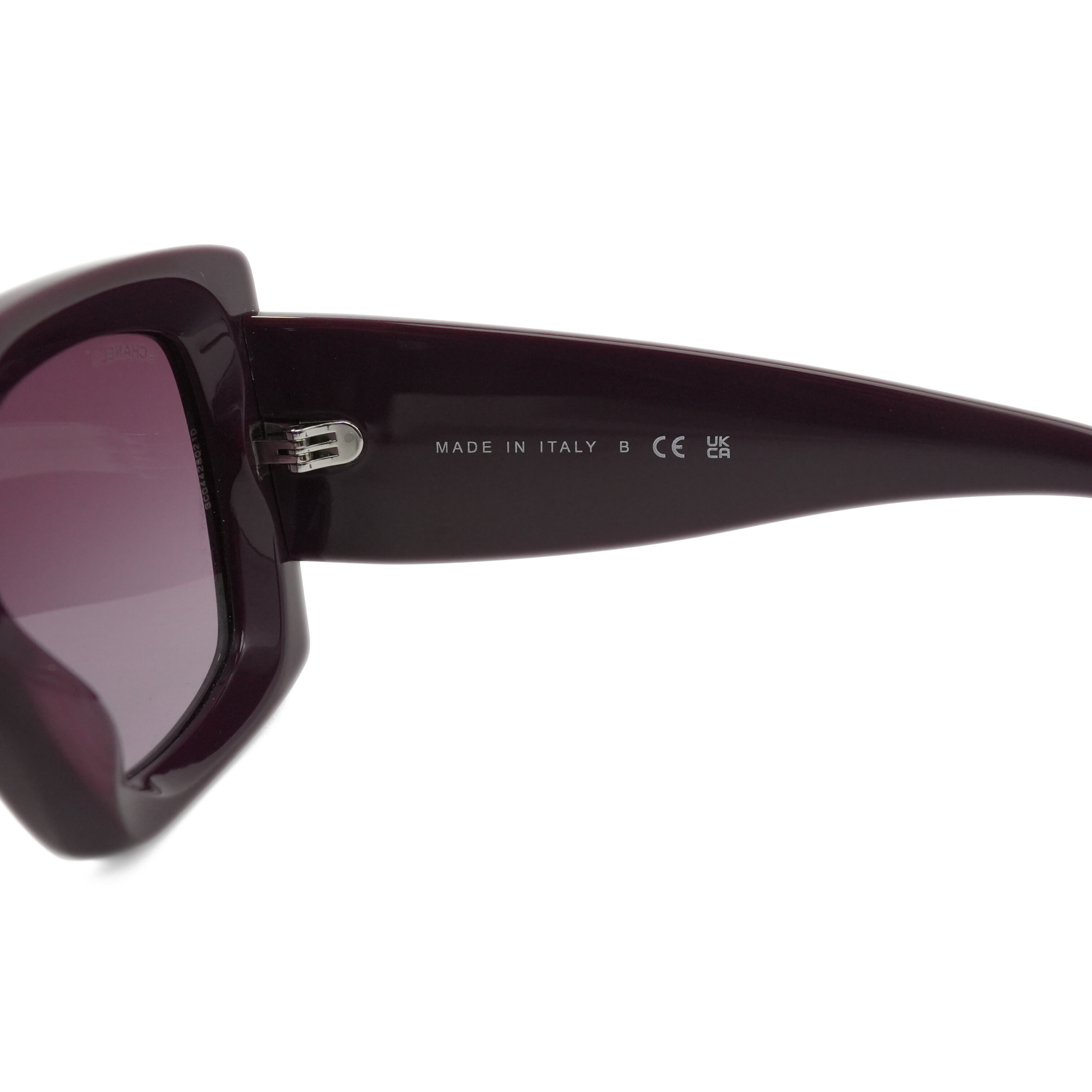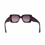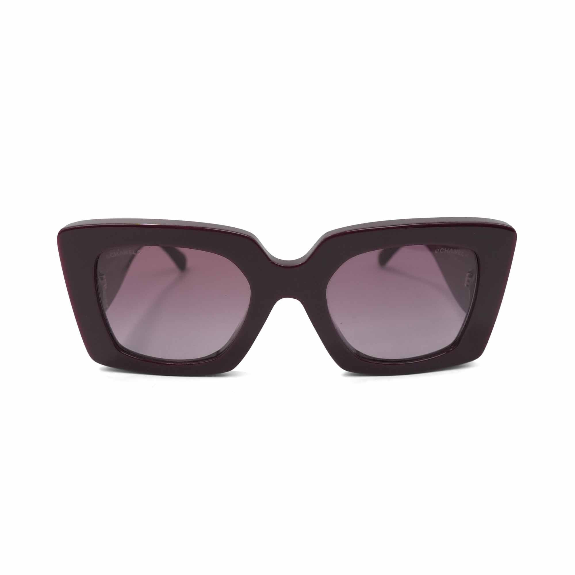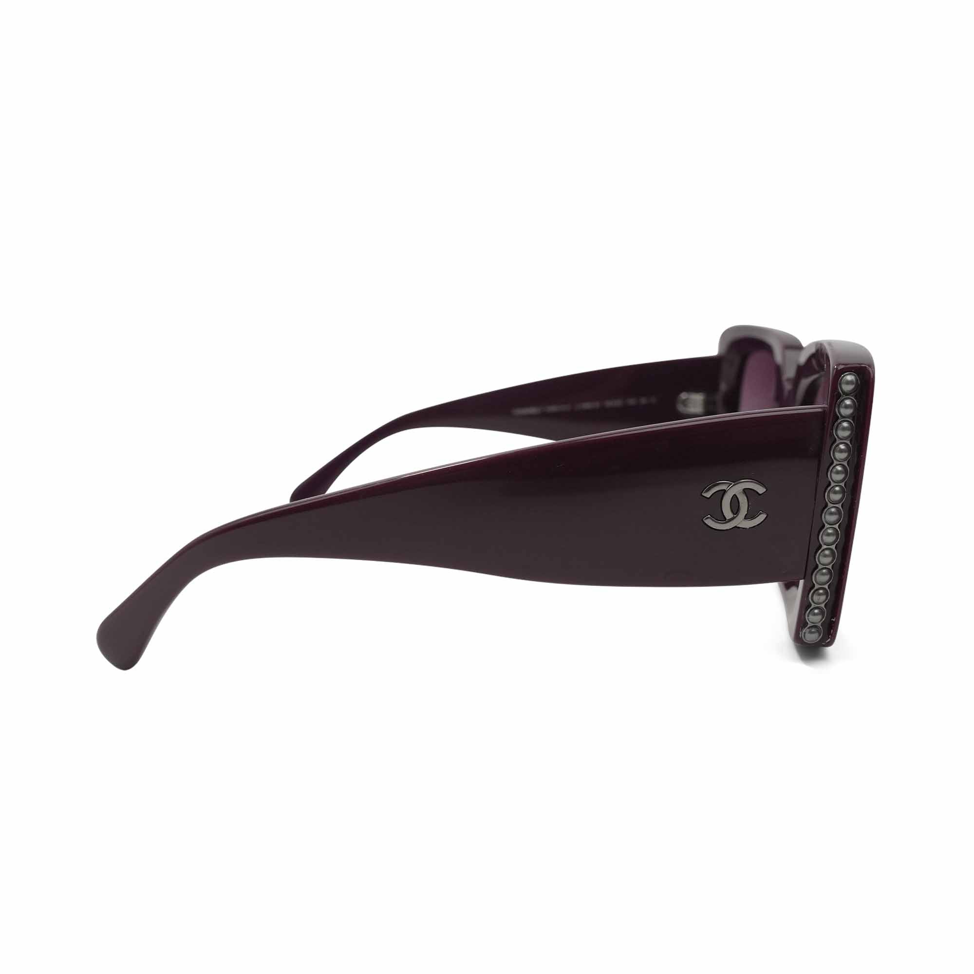 Chanel sunglasses in eggplant purple acetate with oversized rectangular lenses, thick arms and frames, and silver pearl trim down the sides.