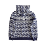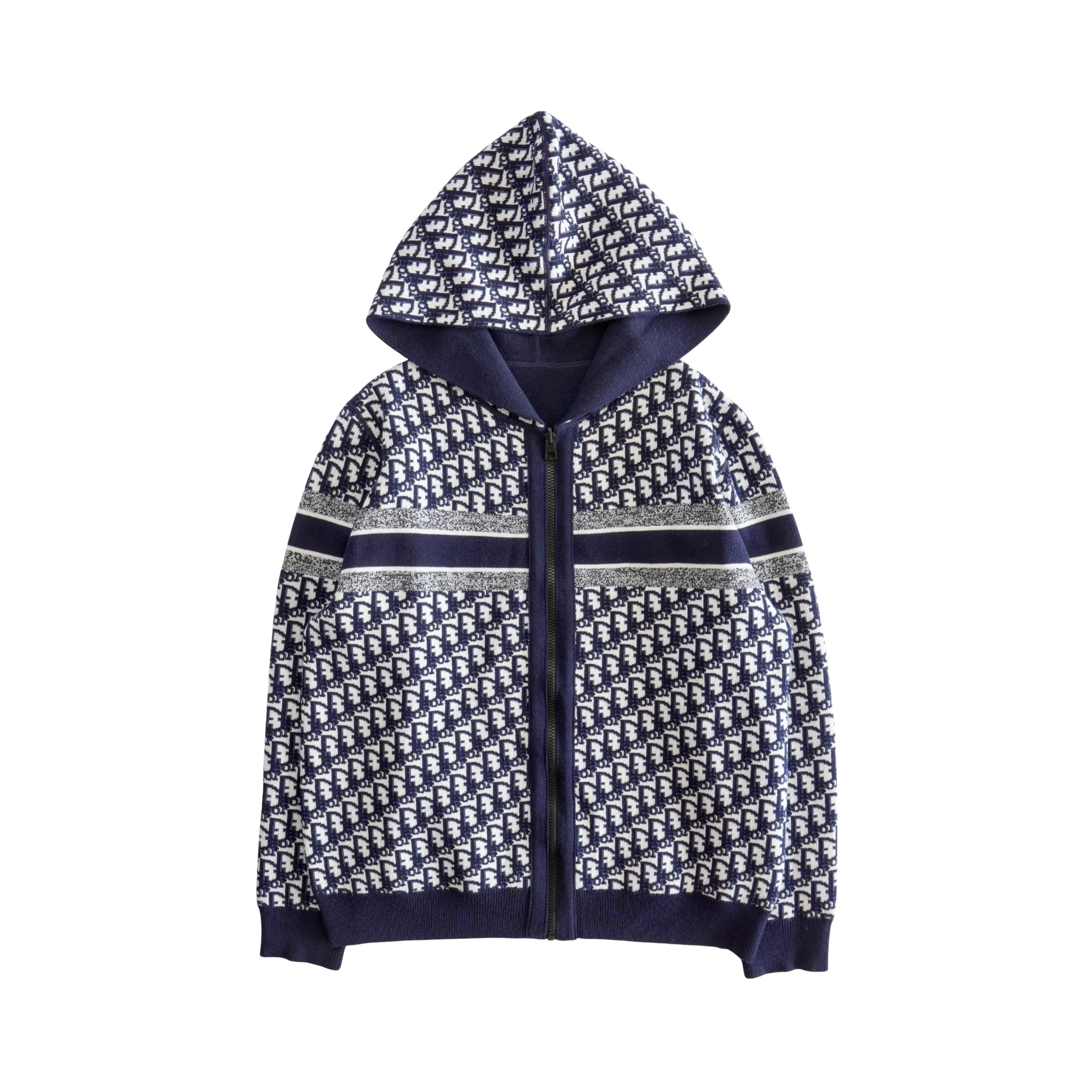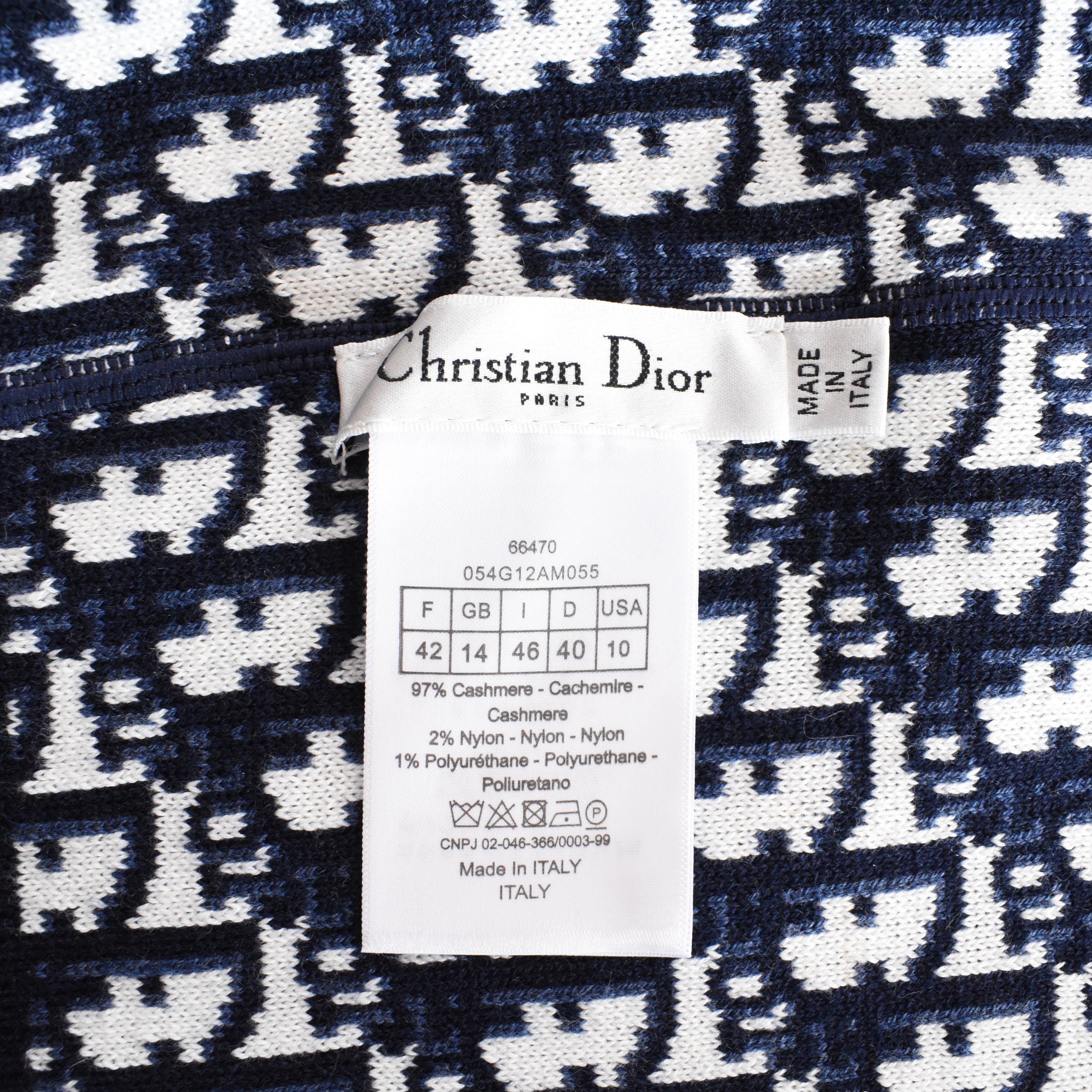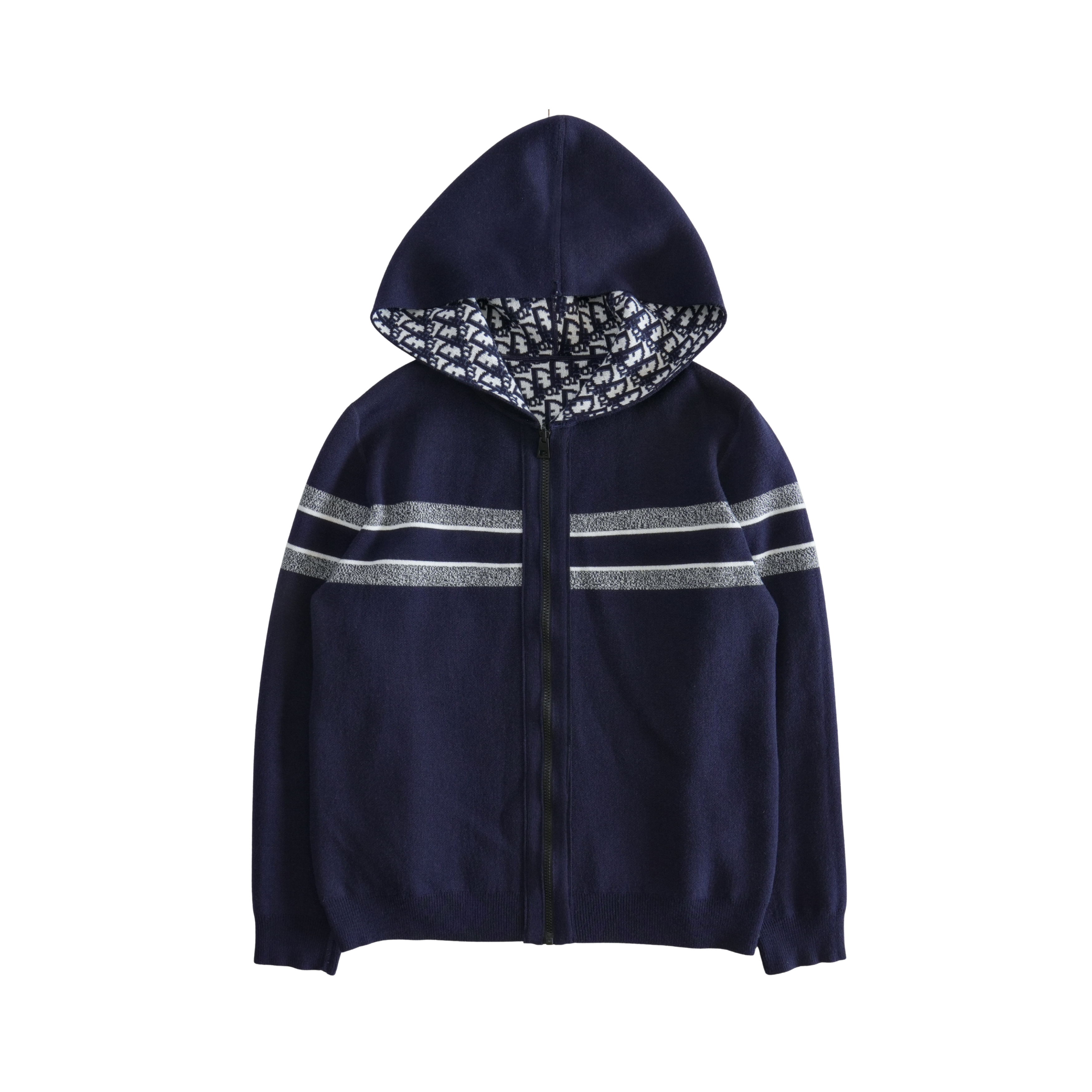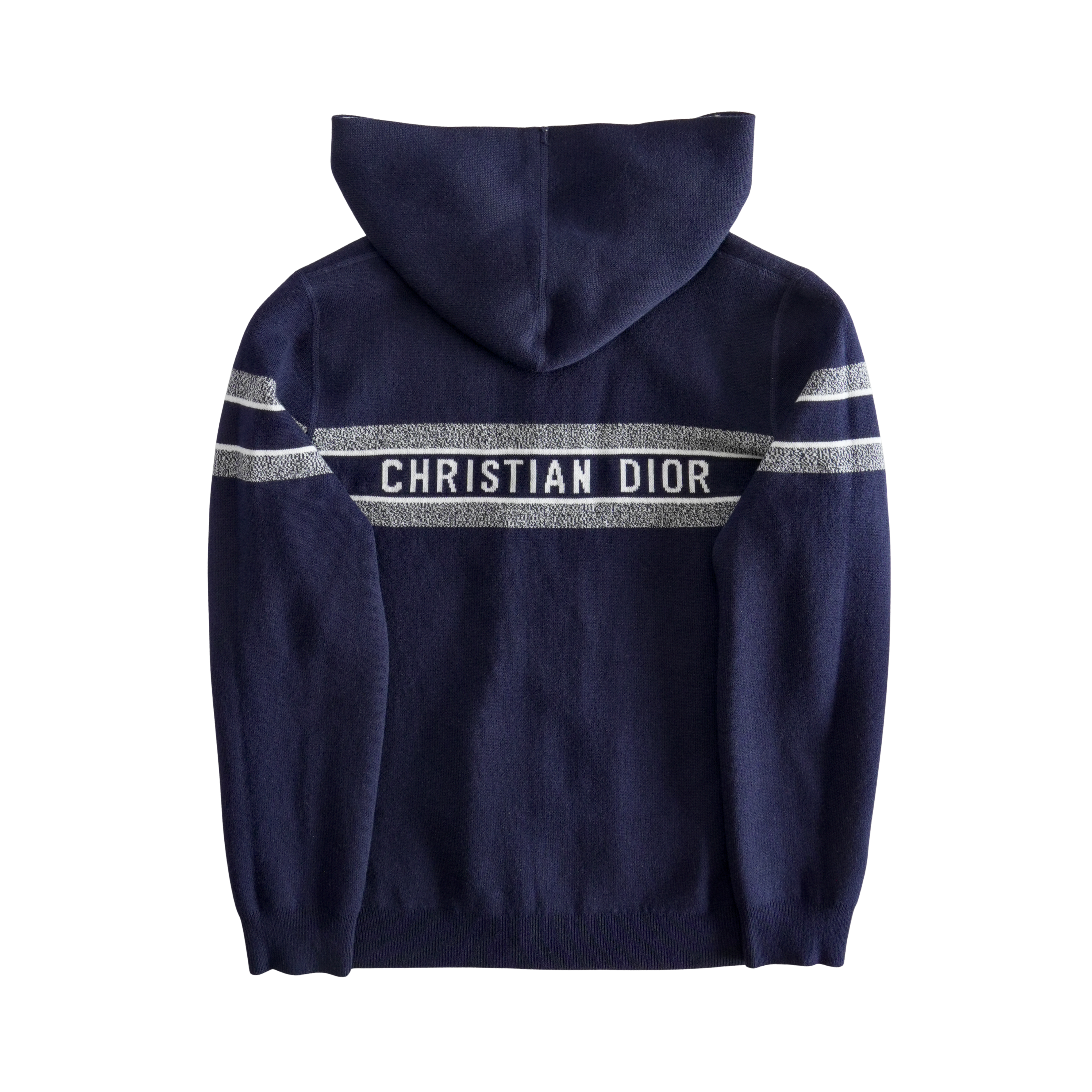 Christian Dior 'Reversible Zipped Cardigan' sweater in navy cashmere blend with striping around the chest and a reverse monogram trotter print side.