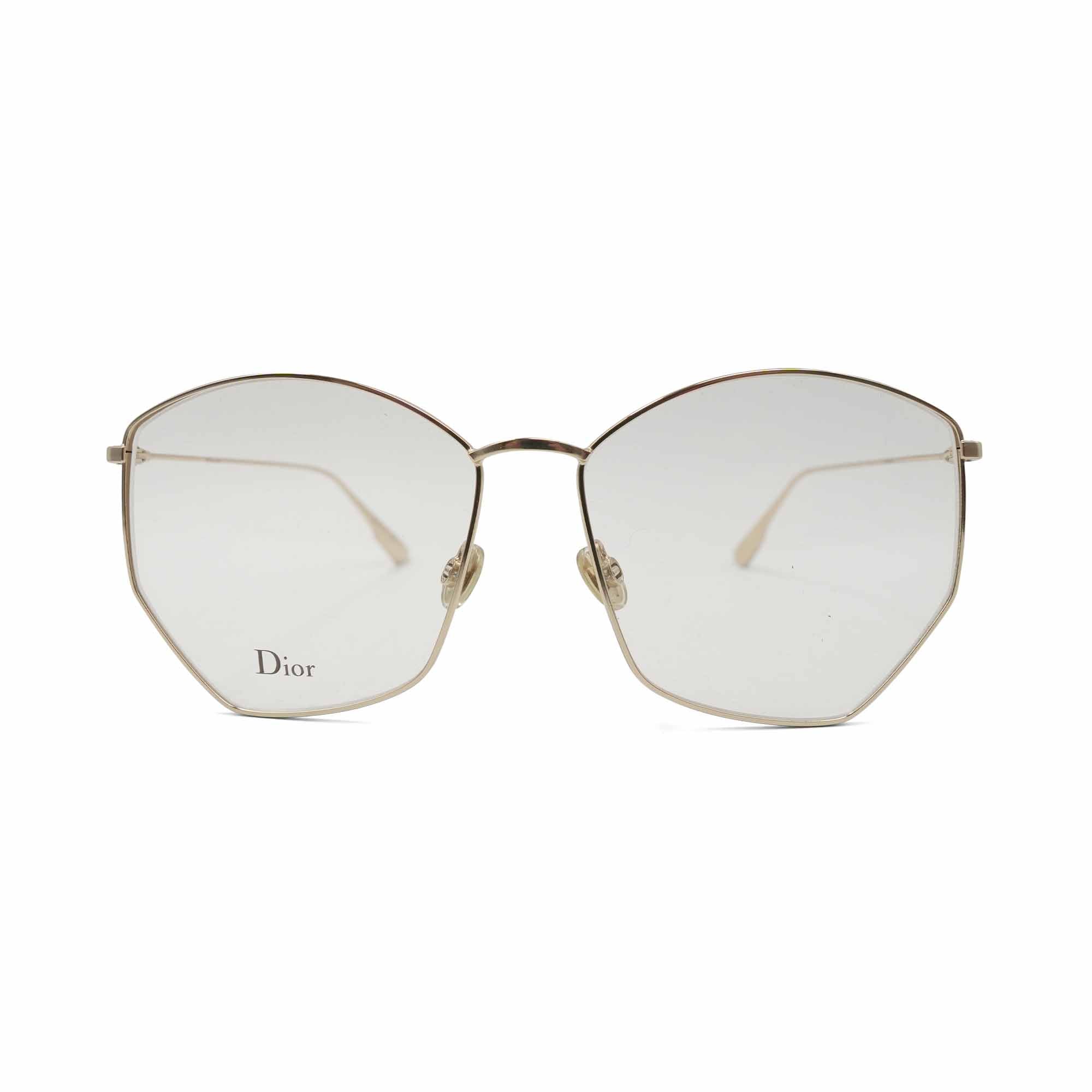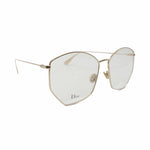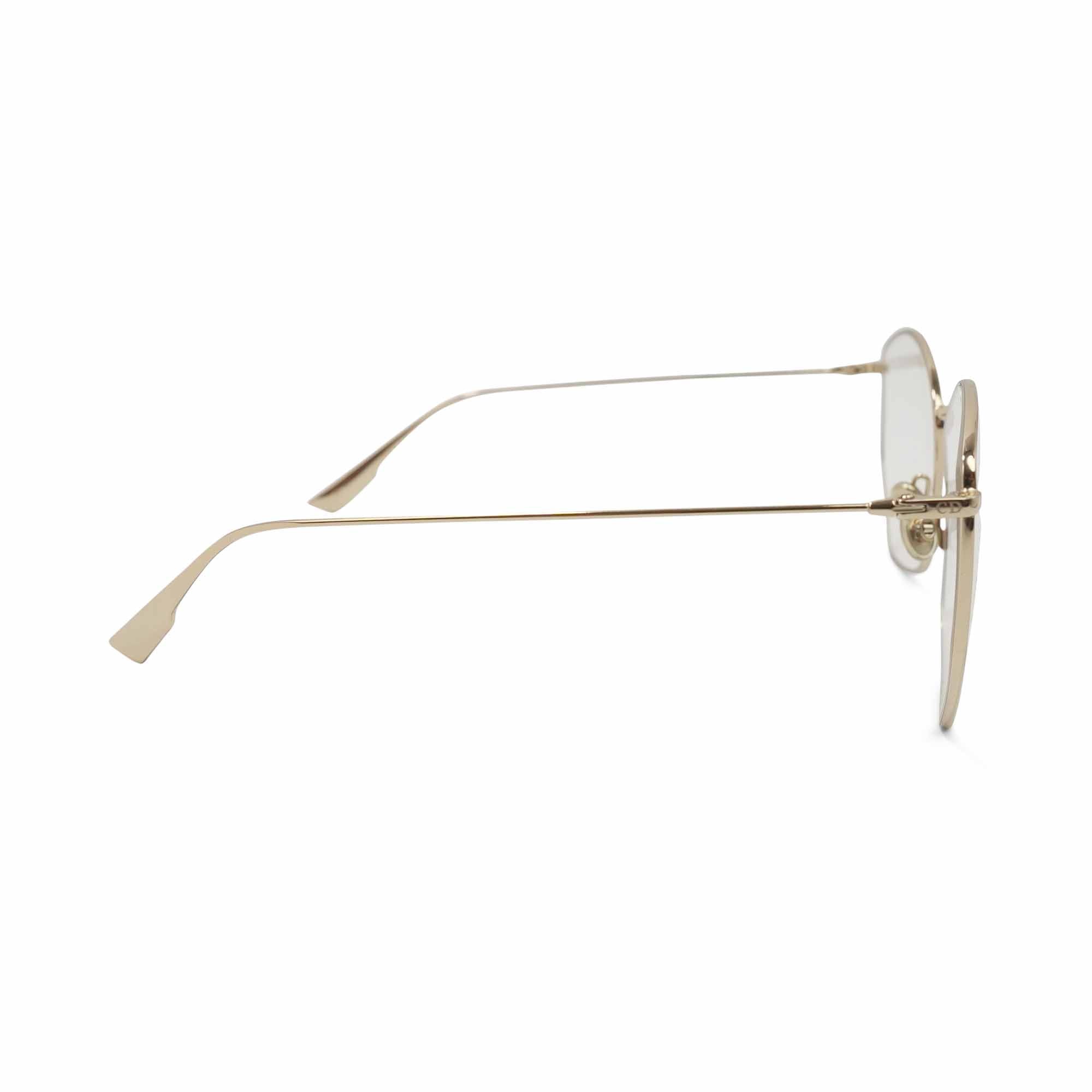 Christian Dior 'Stellaire04' eyeglasses in soft gold metal with oversized angular lenses and a small logo on the lens.