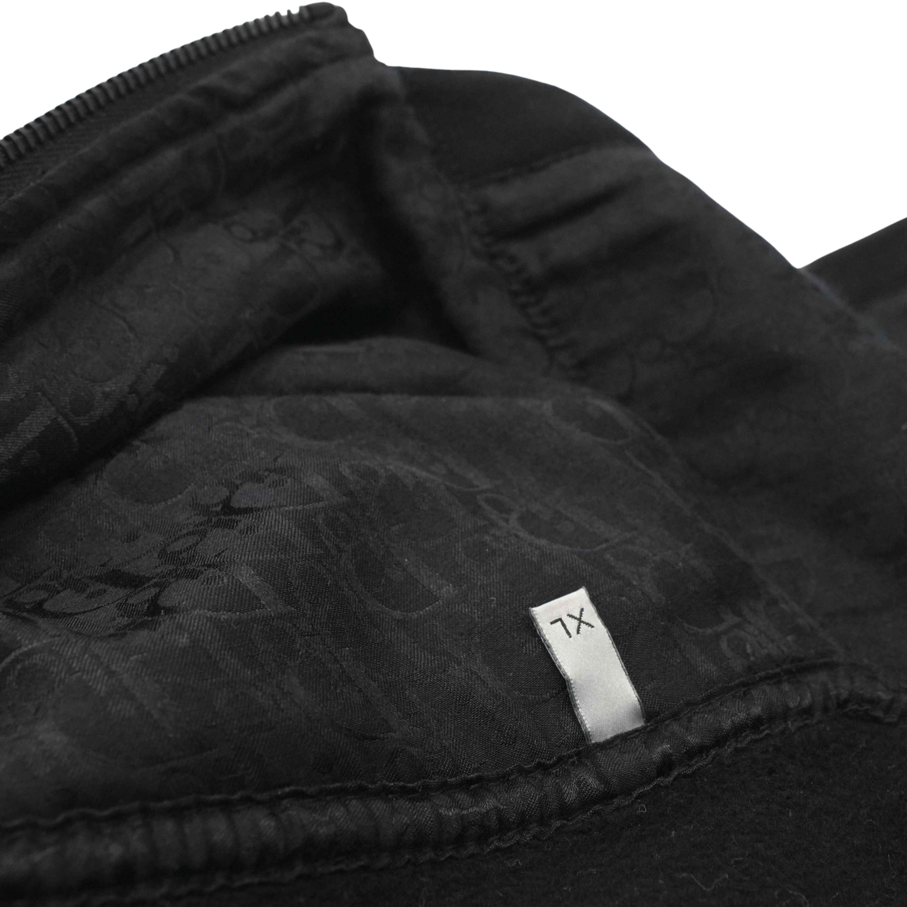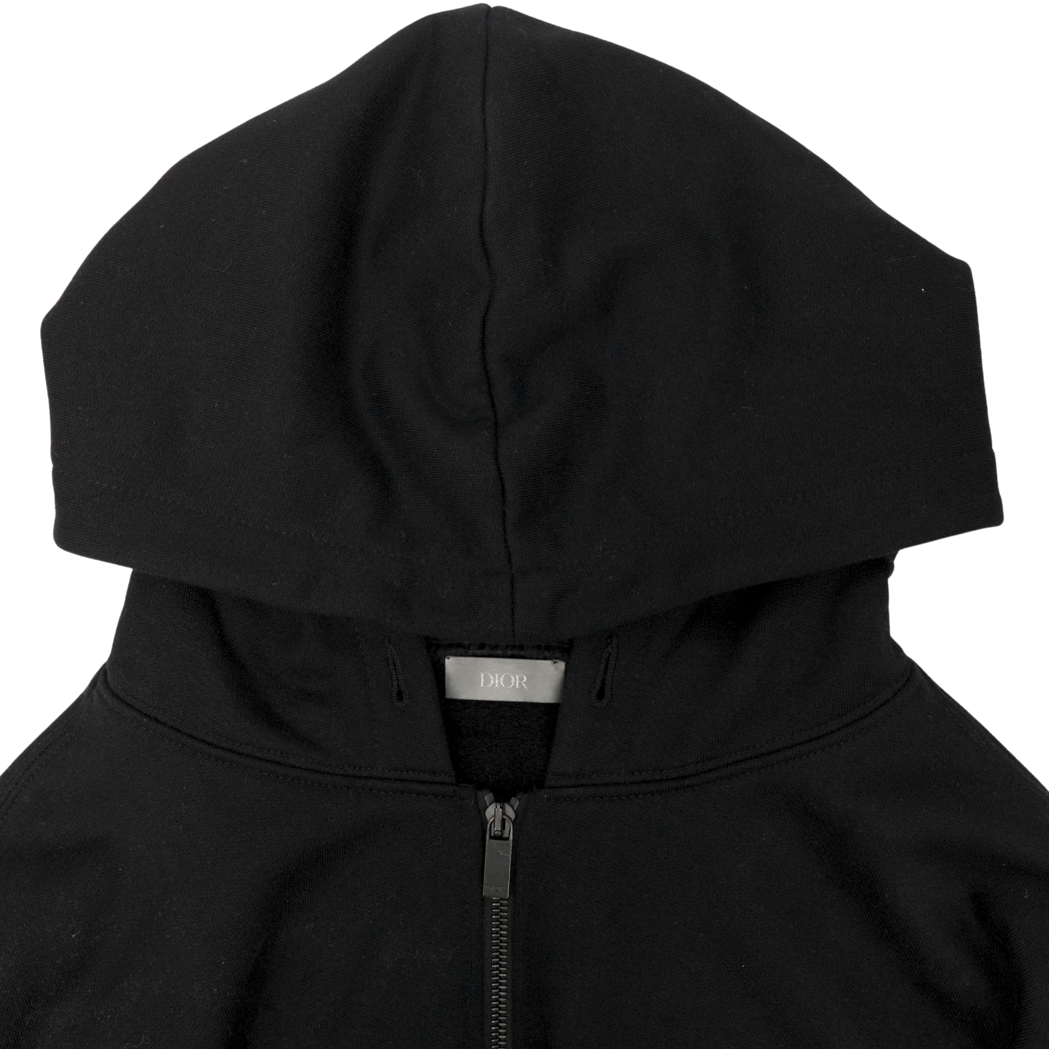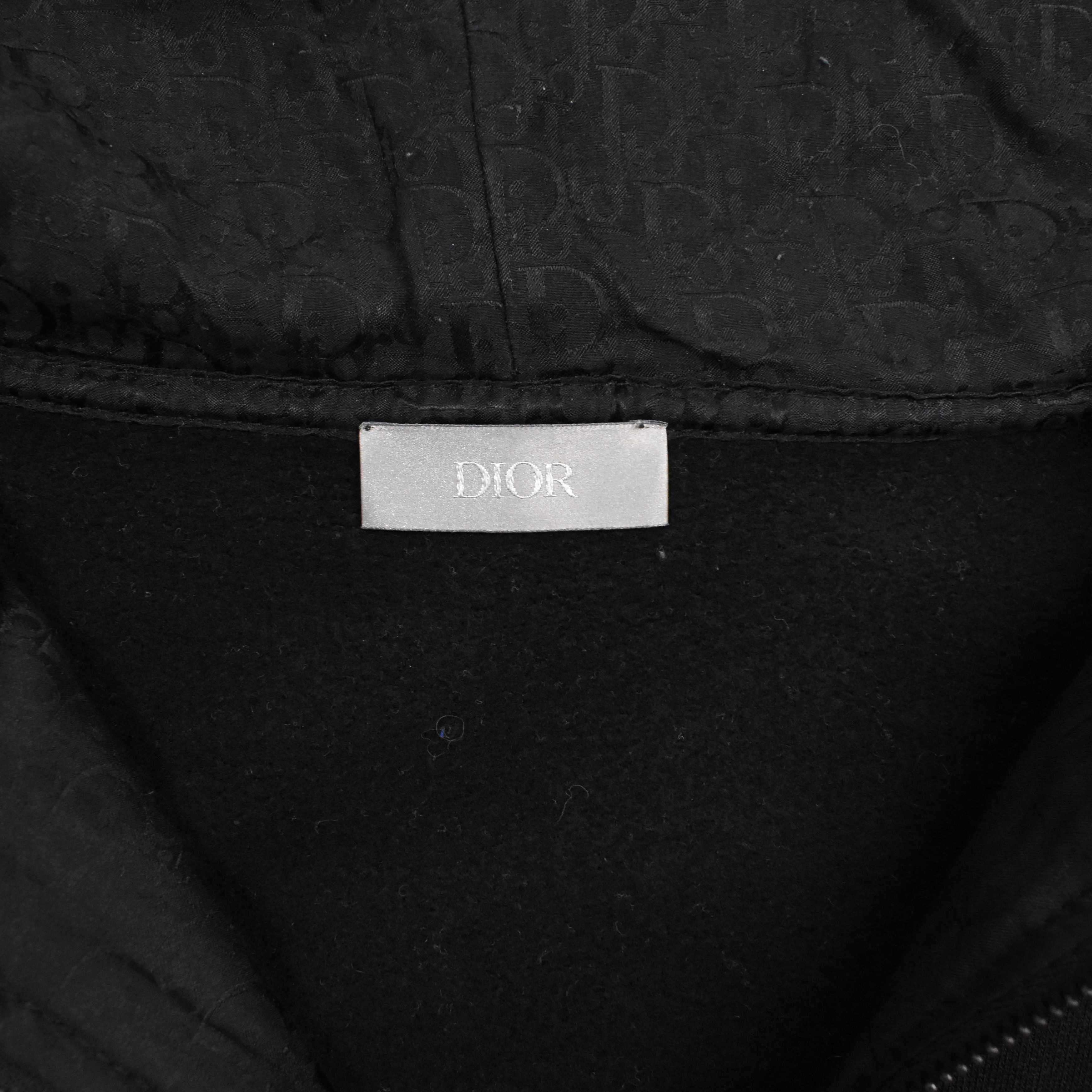 Christian Dior zip up hoodie in black cotton with kangaroo pocket, two way zipper in black hardware, ribbed trim and side slits. Featuring black monogram hood lining and small embroidered logo on the cuff.