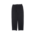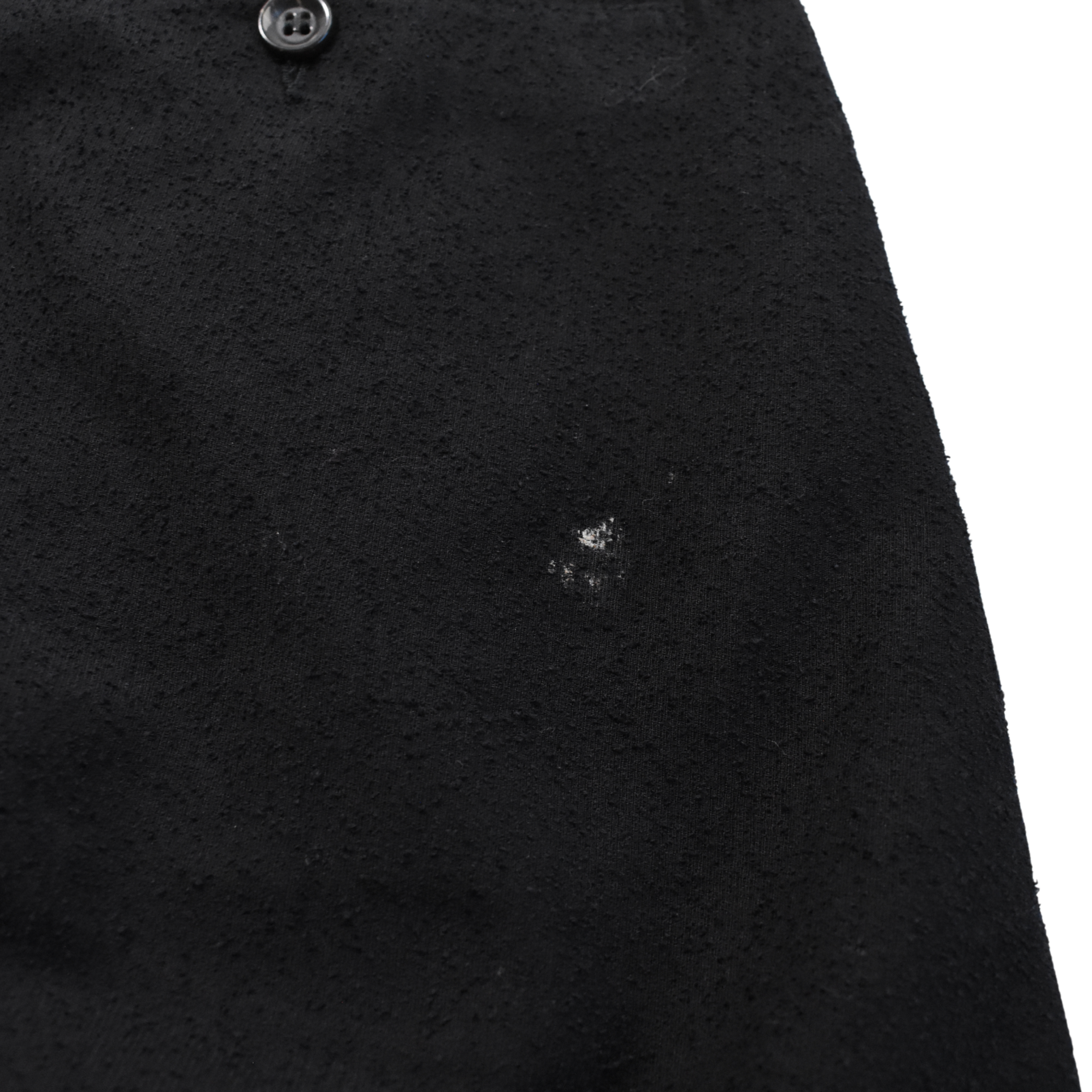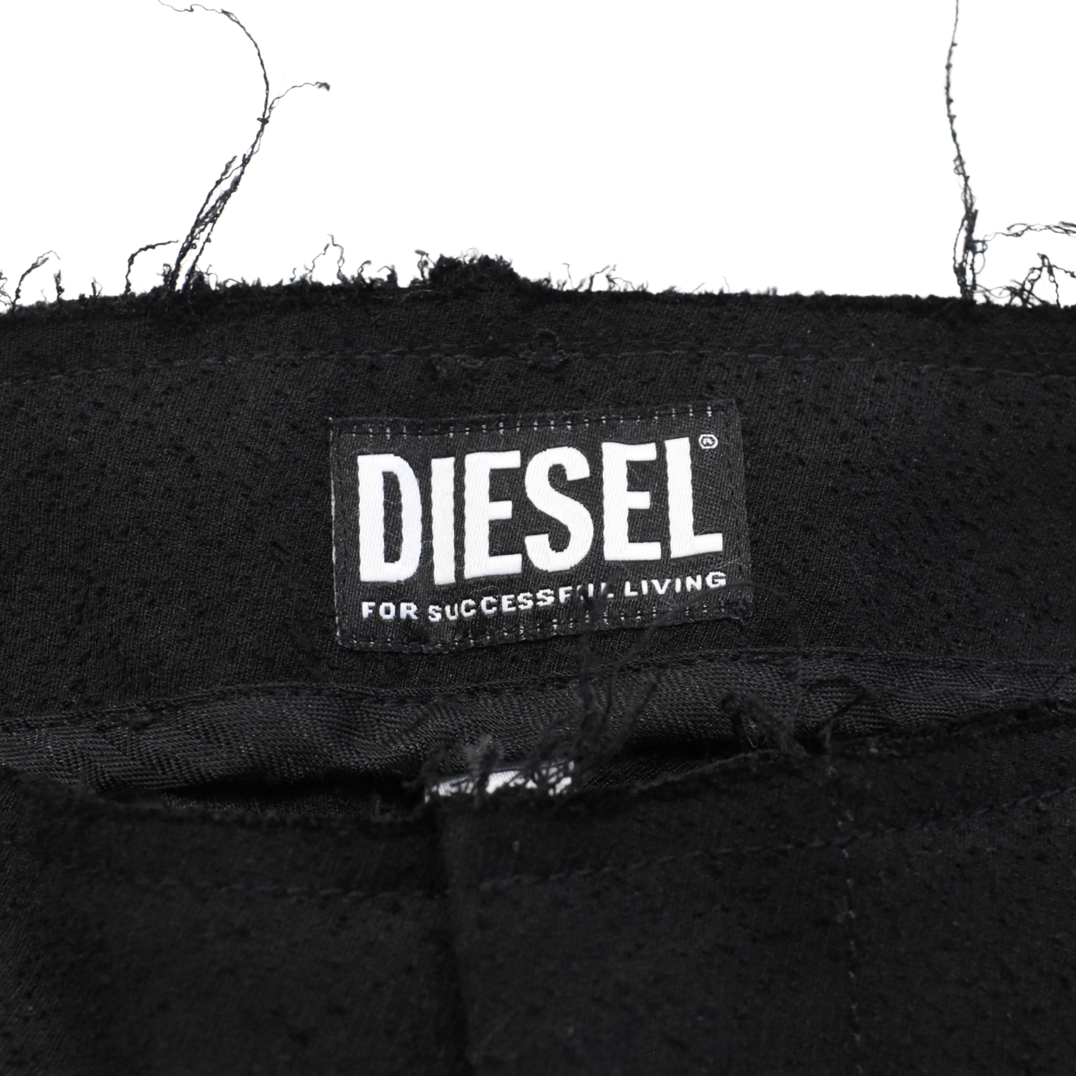 Diesel mid-rise, straight leg trousers in a heavy weight, structured material. Features raw edge details on waistband, bottom cuffs, pockets and down side seams, with a hidden hook closure and silver hardware.
