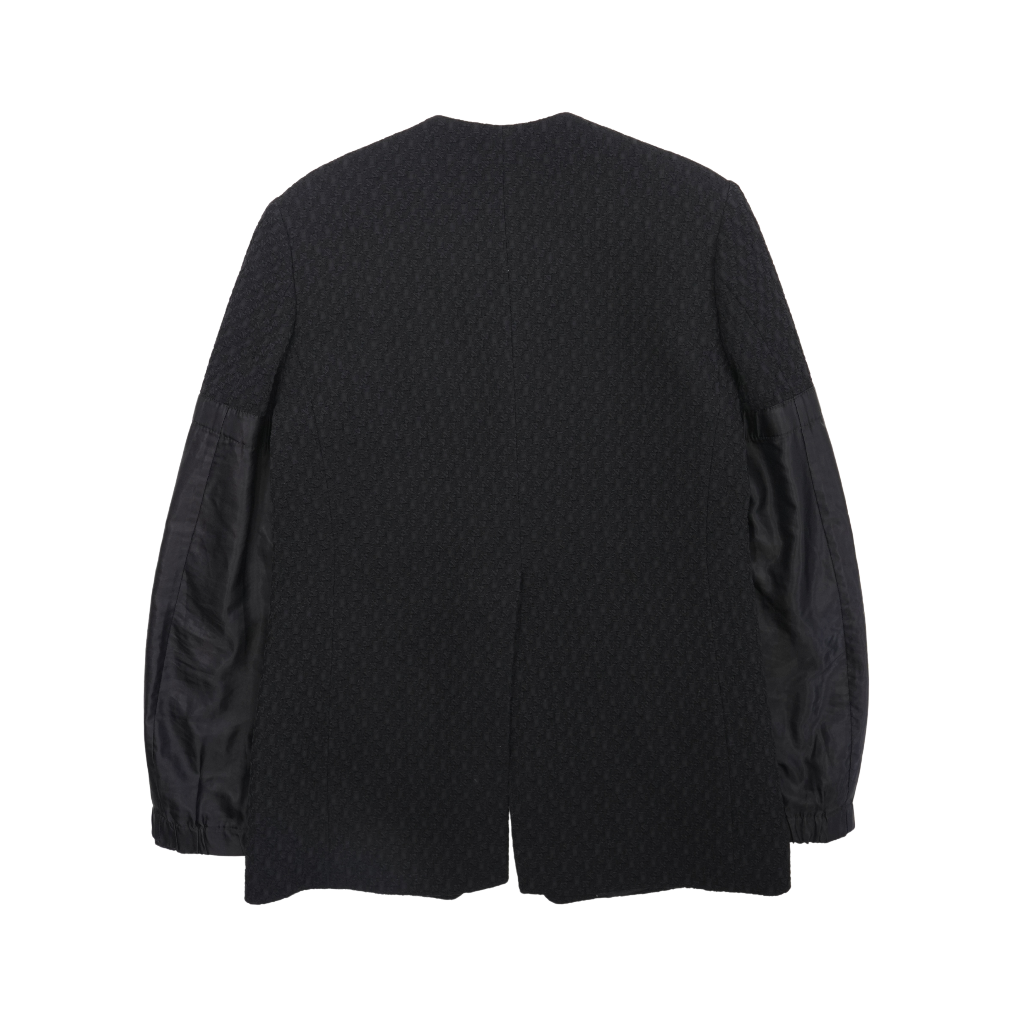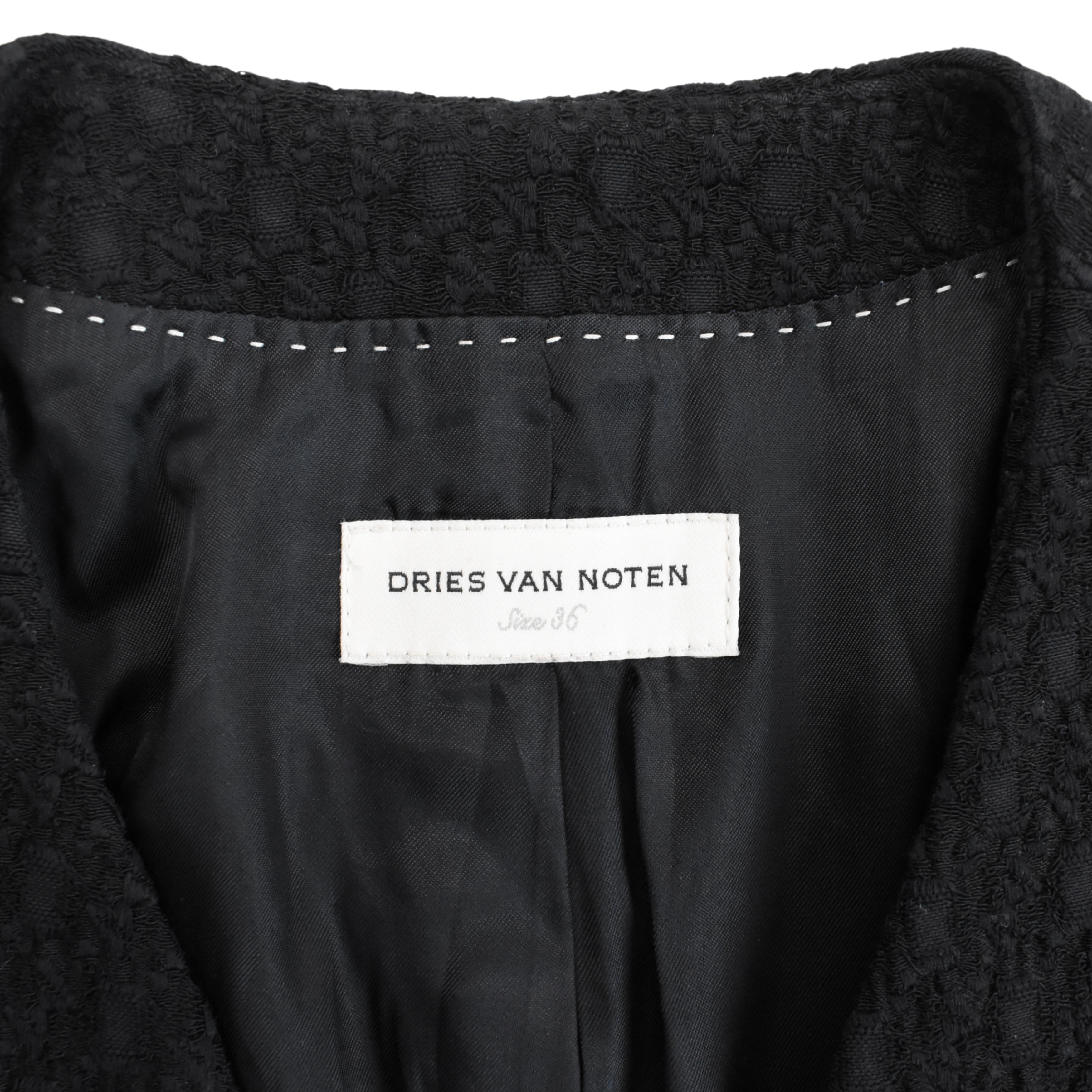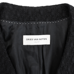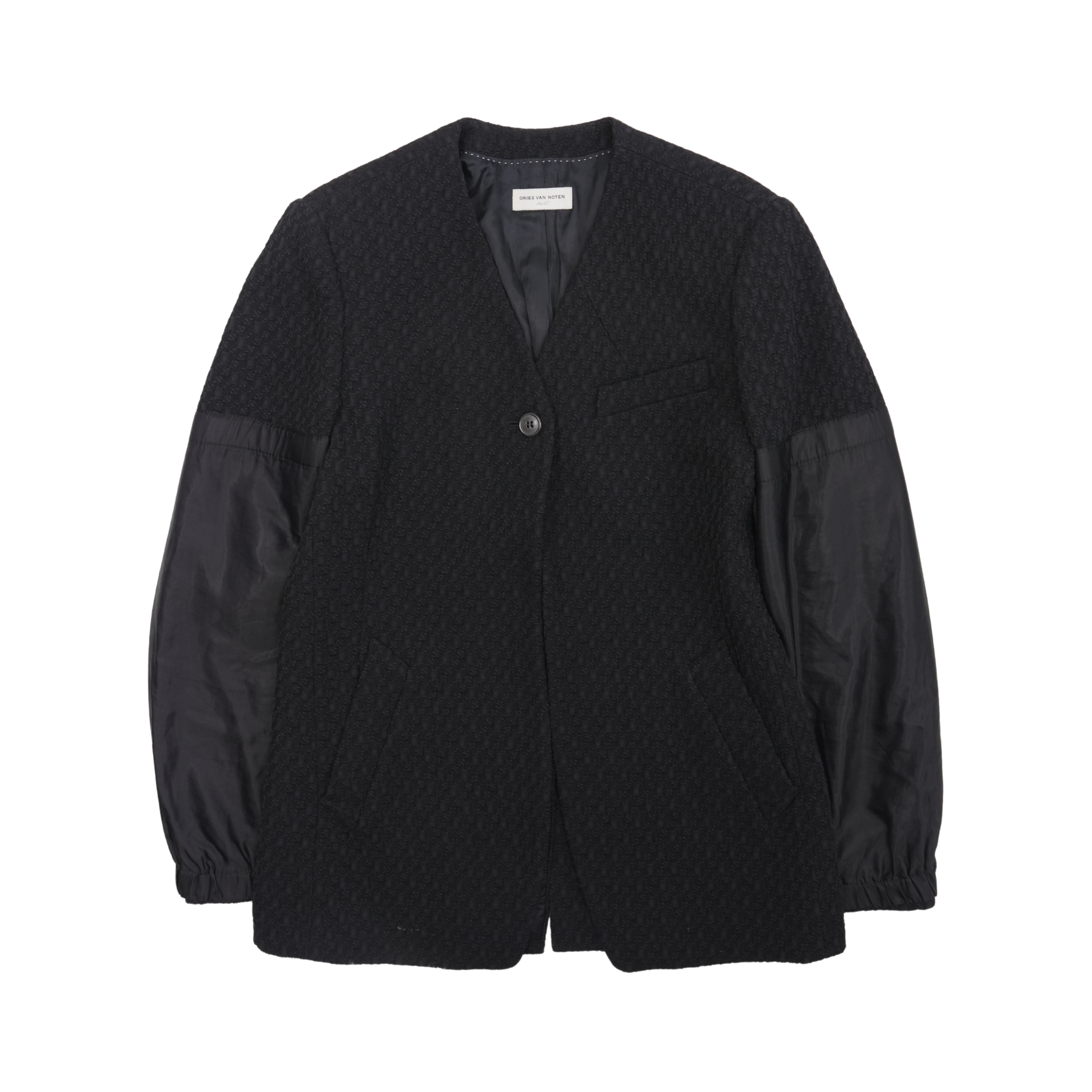 Dries Van Noten v-neck jacket in a black textured wool blend fabric with nylon sleeves and single button closure. Features three faux slip pockets and back vent.