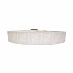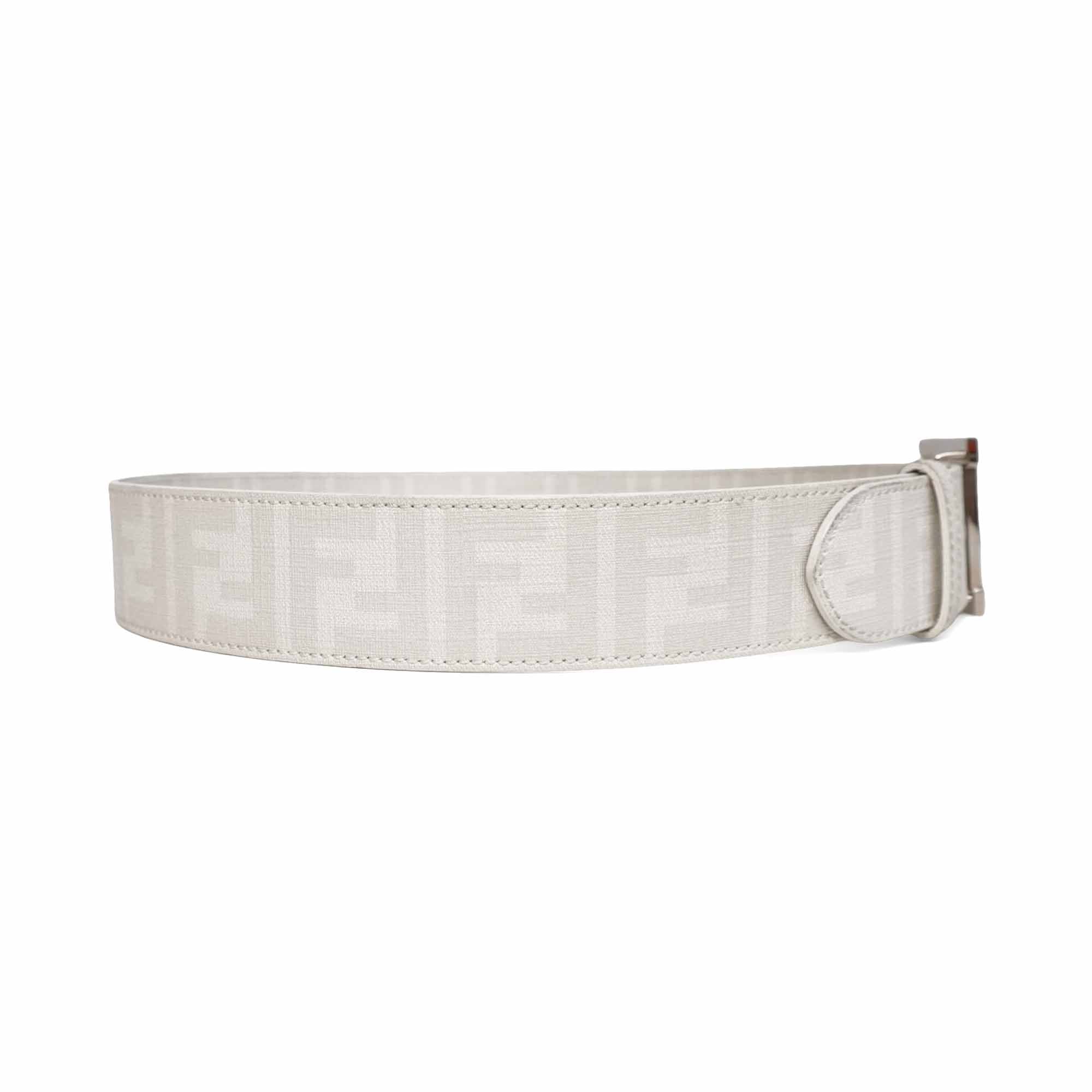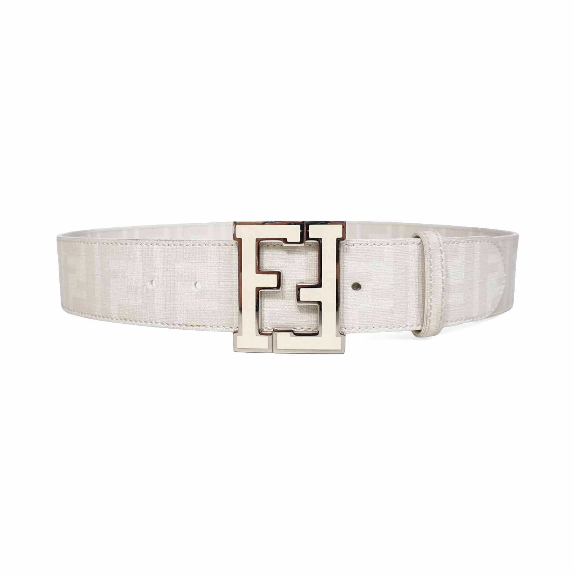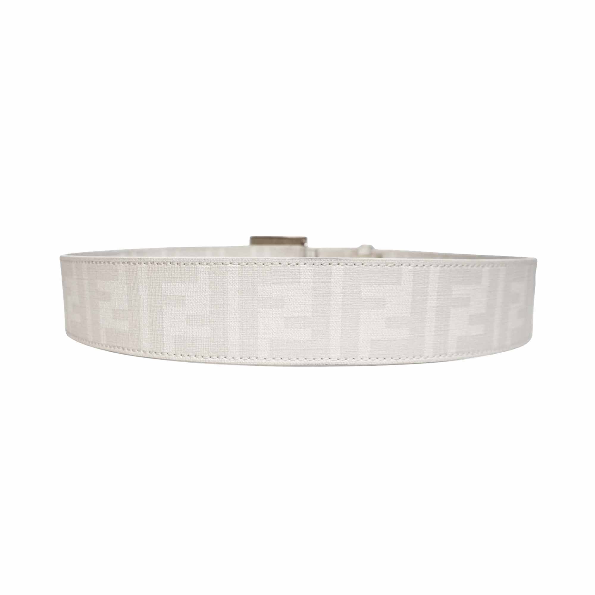 Fendi coated canvas belt in white with an all-over monogram off-white 'Zucca' pattern and cream enamel double F logo buckle with peg-and-hole closure.