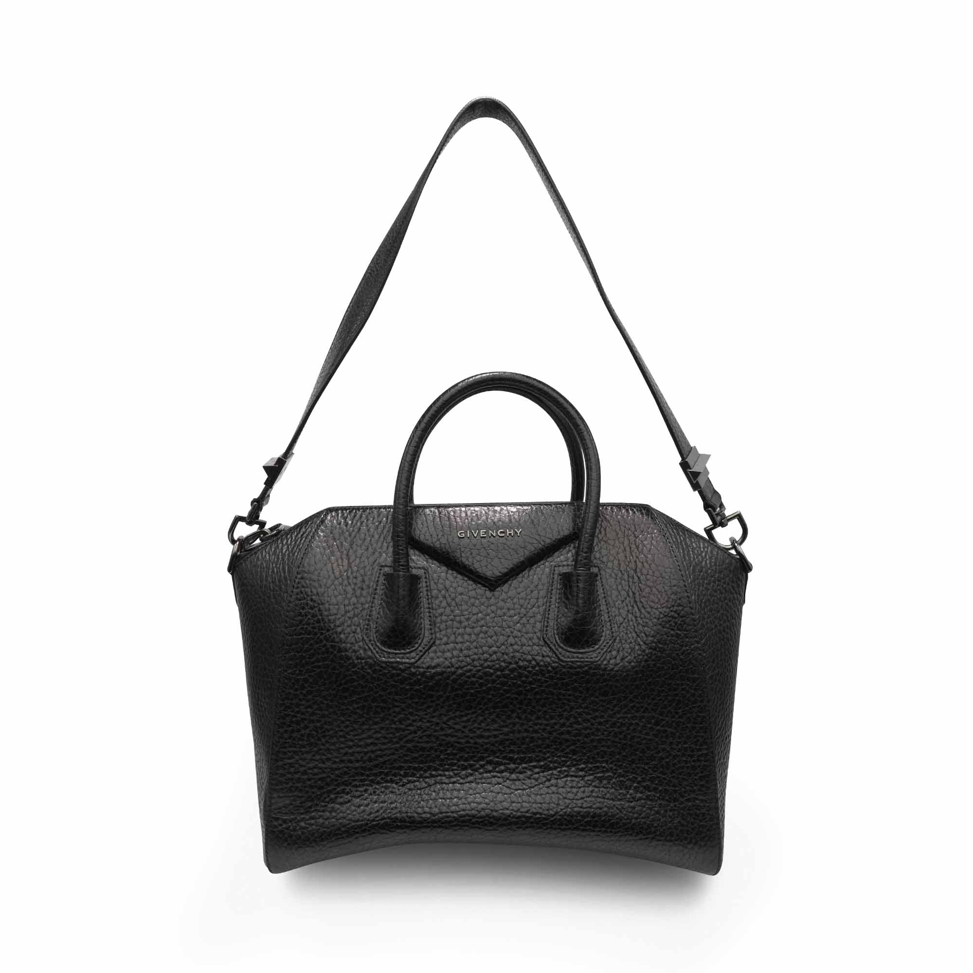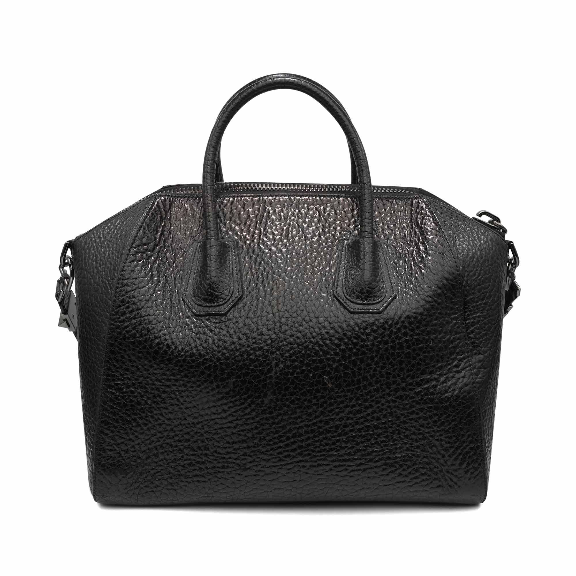 Givenchy 'Antigona' handbag in black pebbled leather with silver hardware. Features dual rolled handles, a removable leather shoulder strap, oversized silver zipper, and black fabric lining with slip and zip pockets.