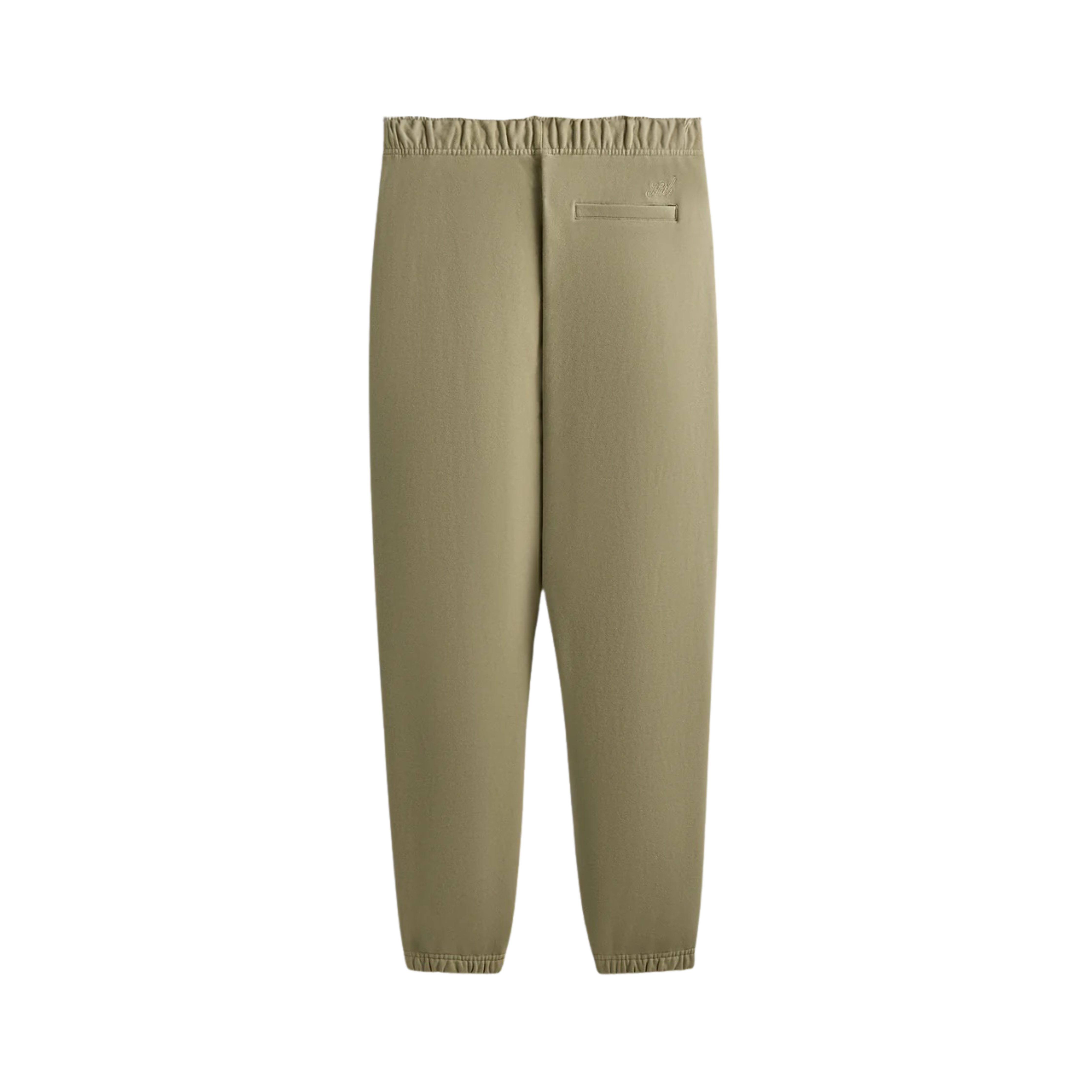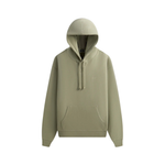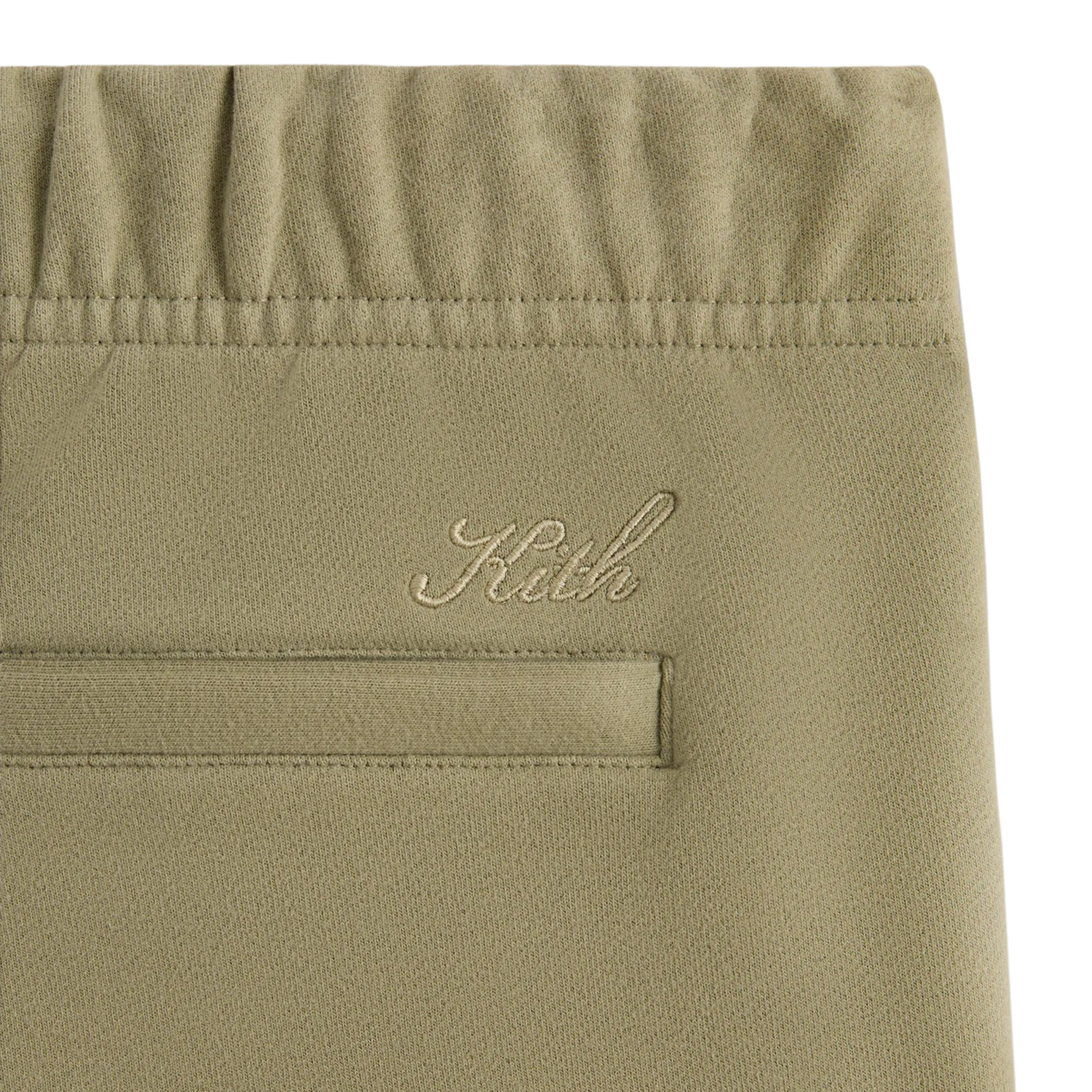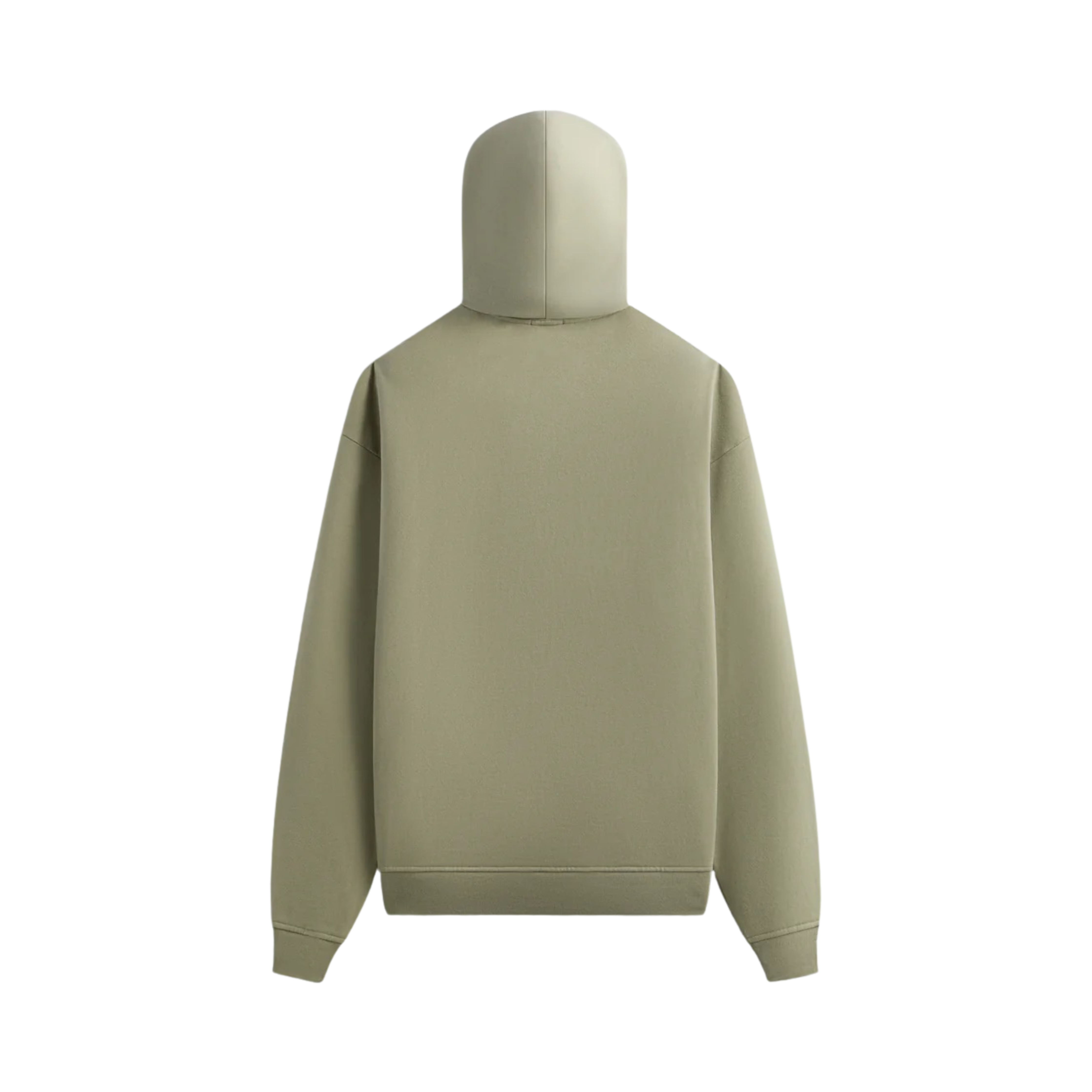 Kith meadow green sweatsuit in sueded french terry material. Includes the 'Nelson Hoodie' which features embroidered script logo on chest, ribbed sleeve cuffs, bottom hem and v-insert at neckline, and drawcord hood. Pants are the 'Emmons Sweatpant' which feature drawcord at waist, elastic cuffs, stitch detail on the front, side pockets and zippered welt pockets on the back with embroidered logo above.