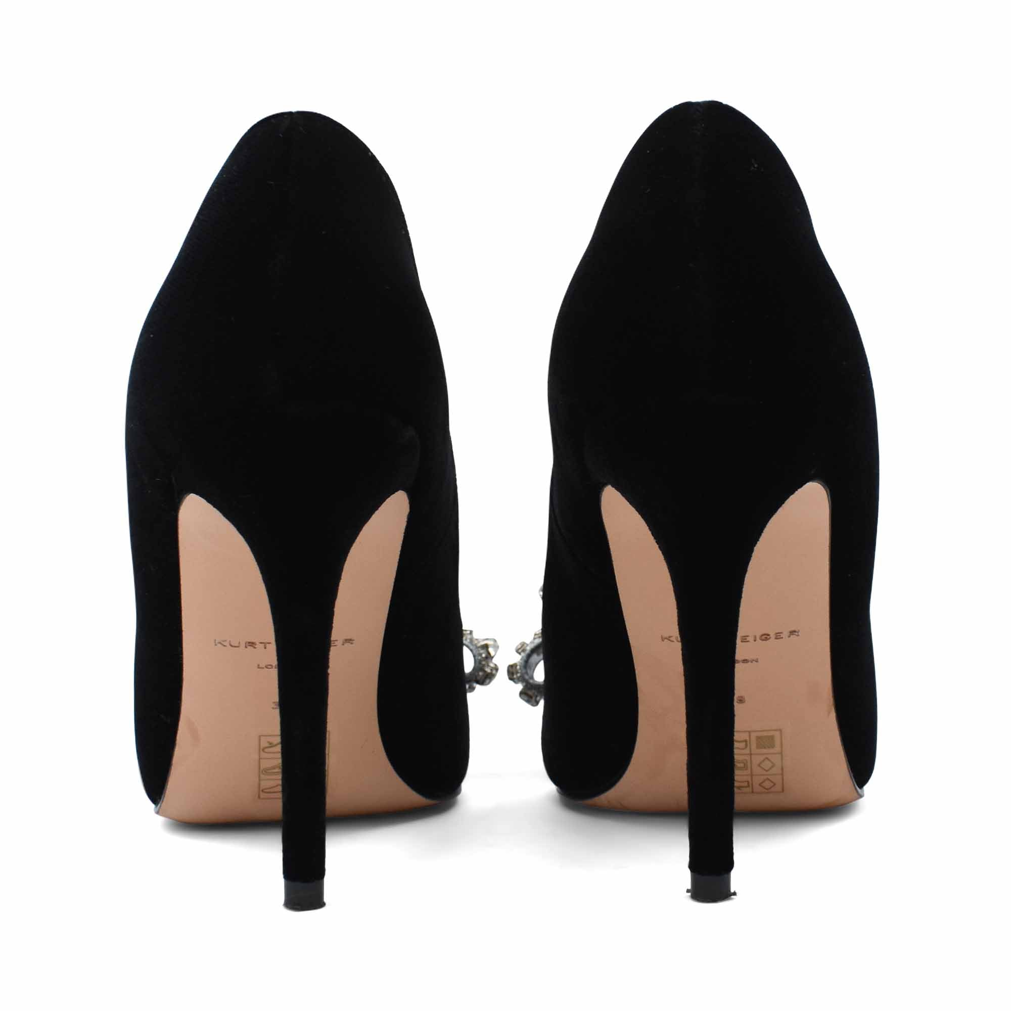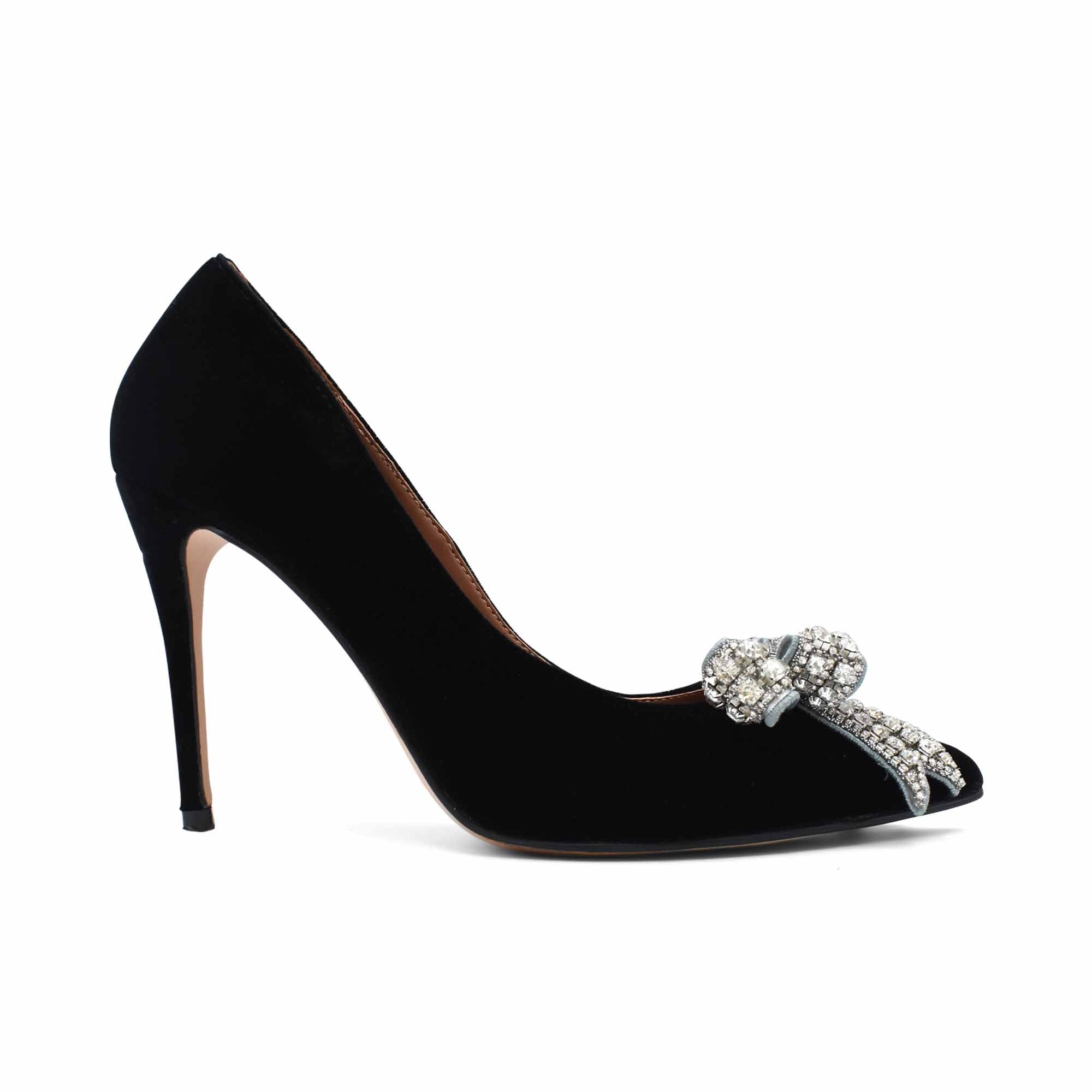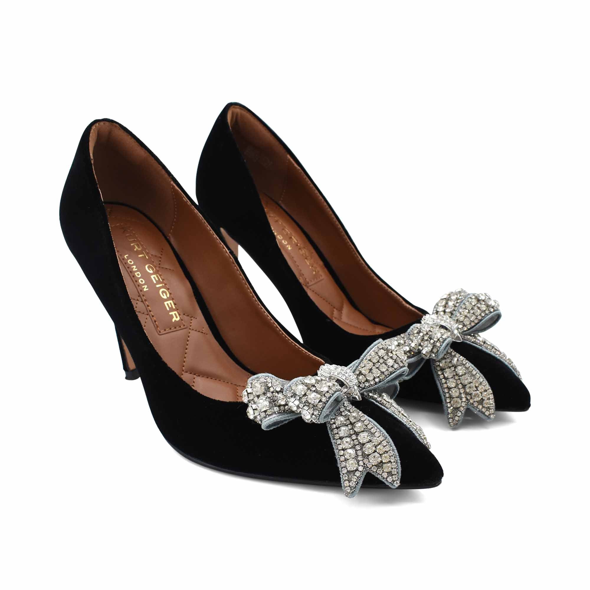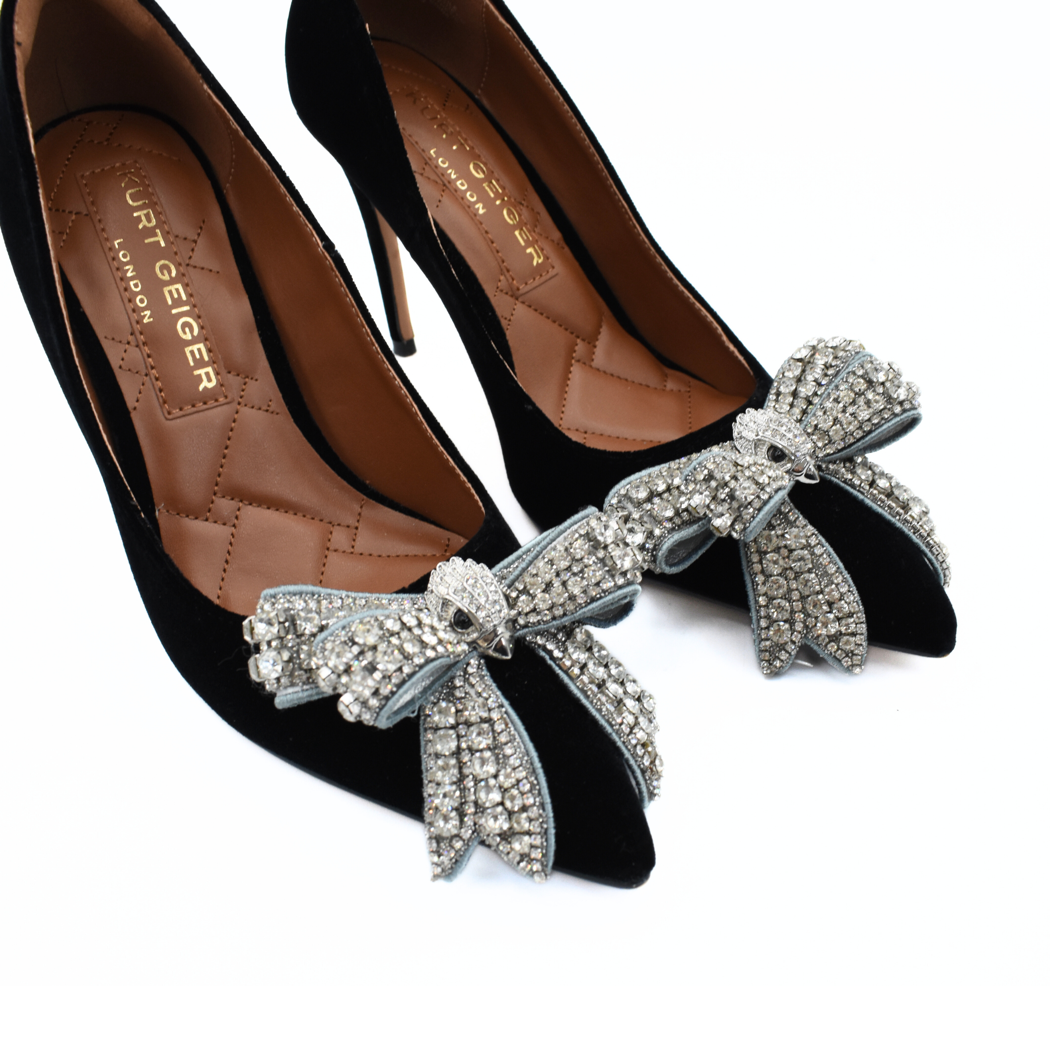 Kurt Geiger 'Belgravia Bow' pointed toe pumps in black velvet with crystal encrusted bows featuring silver bird head studs on the toe box.