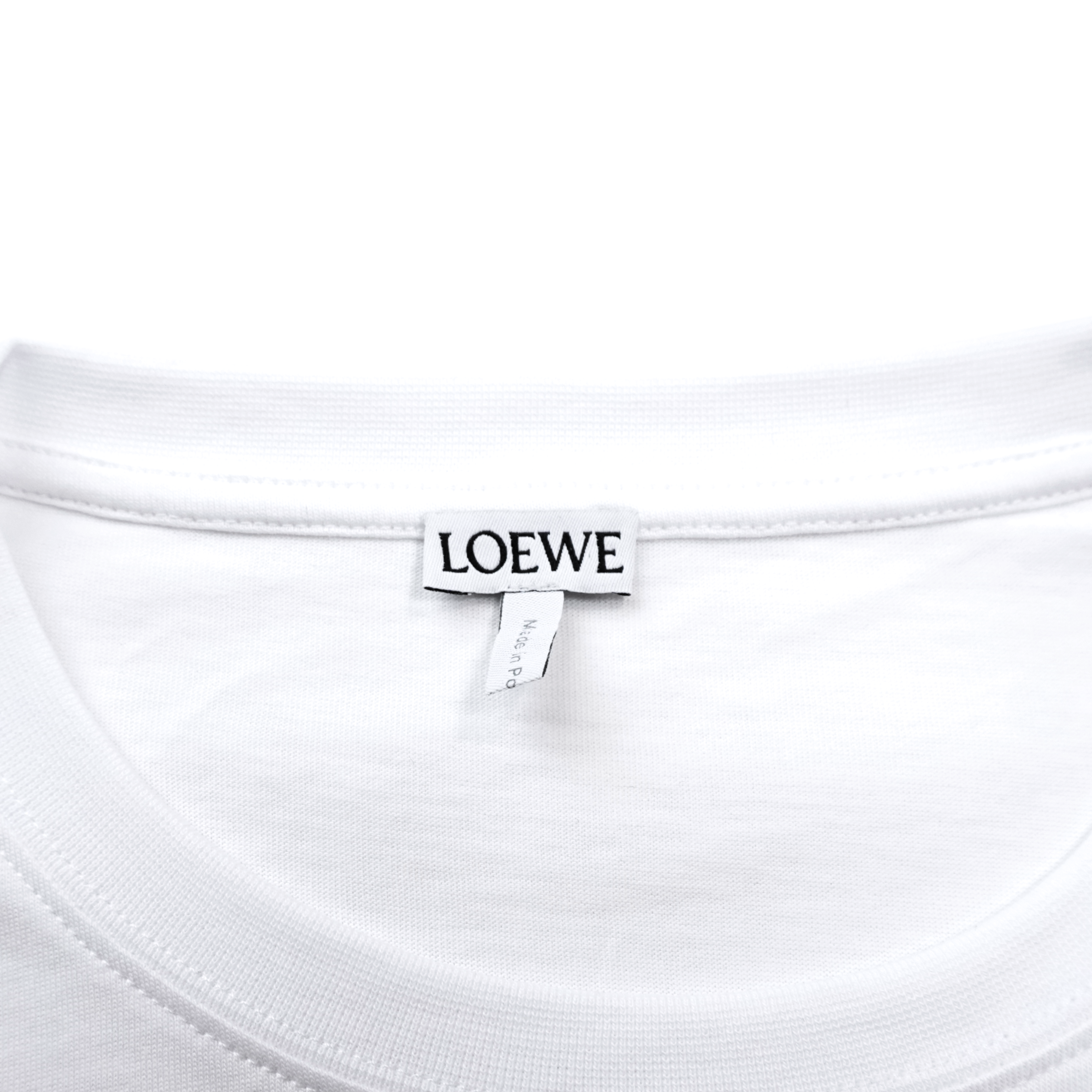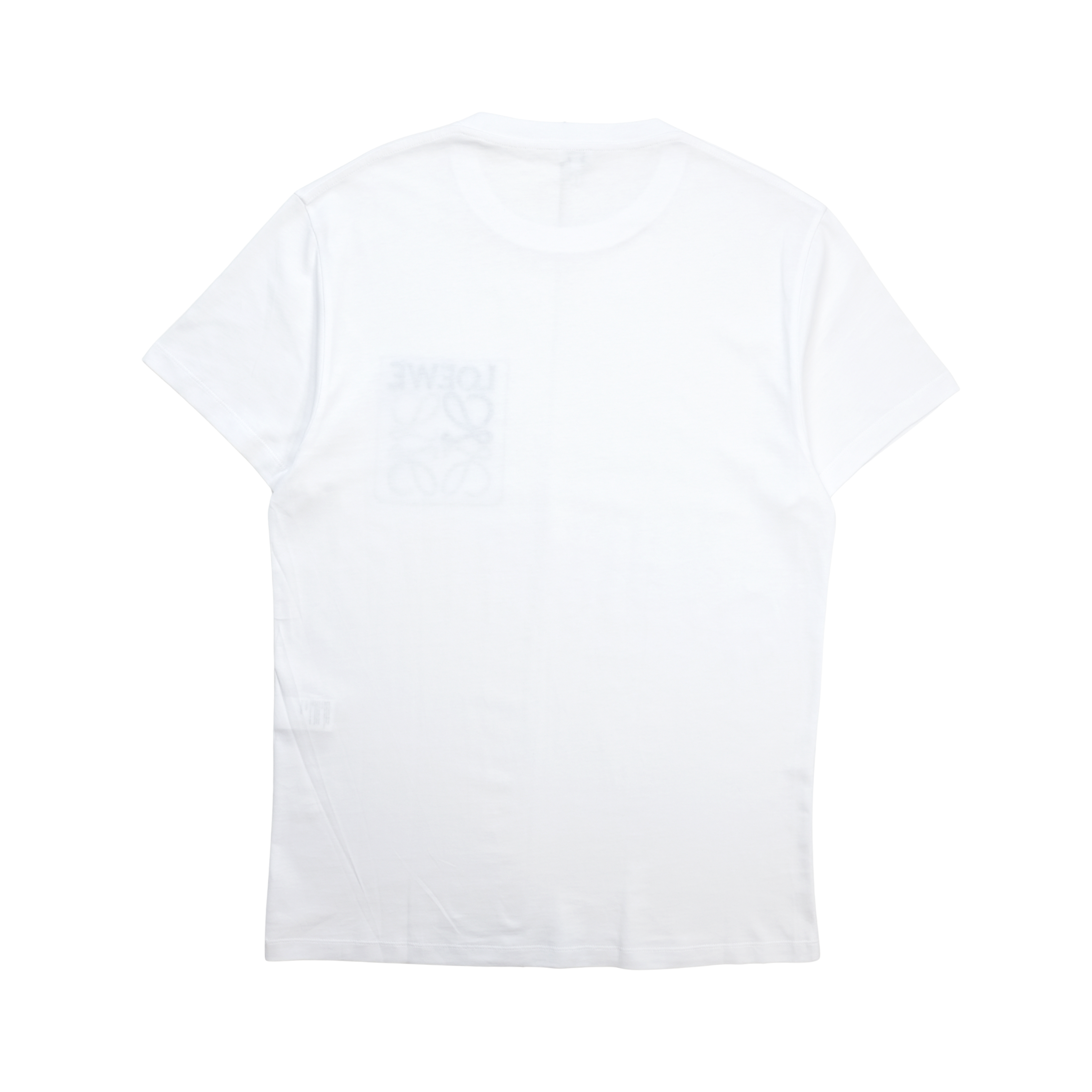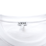 Loewe white t-shirt with embroidered and printed blue Anagram logo detail.