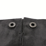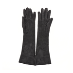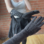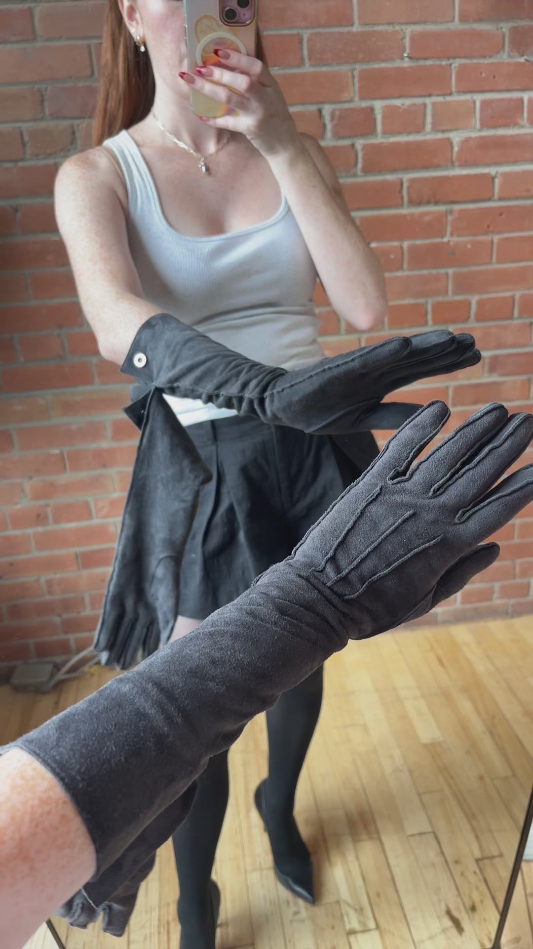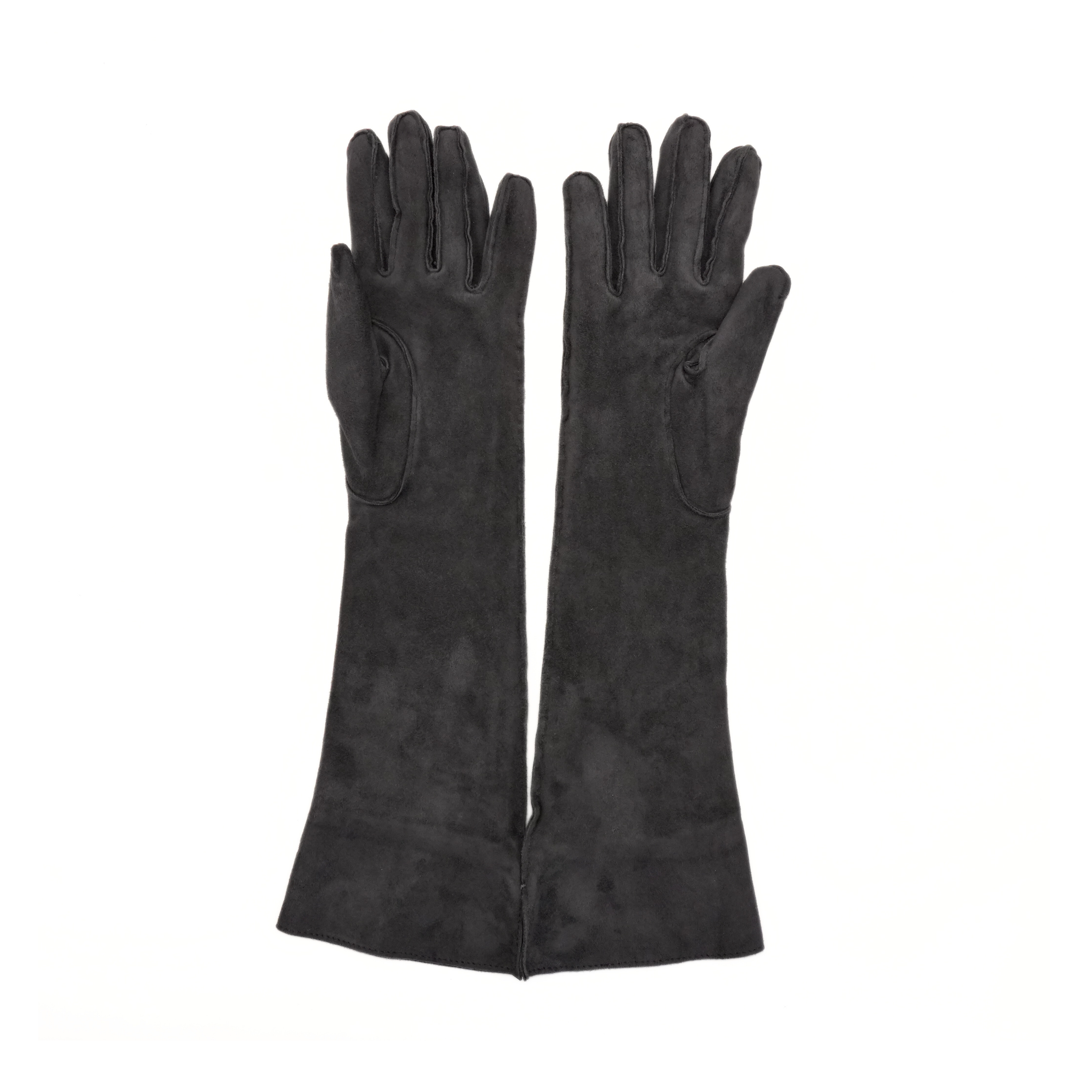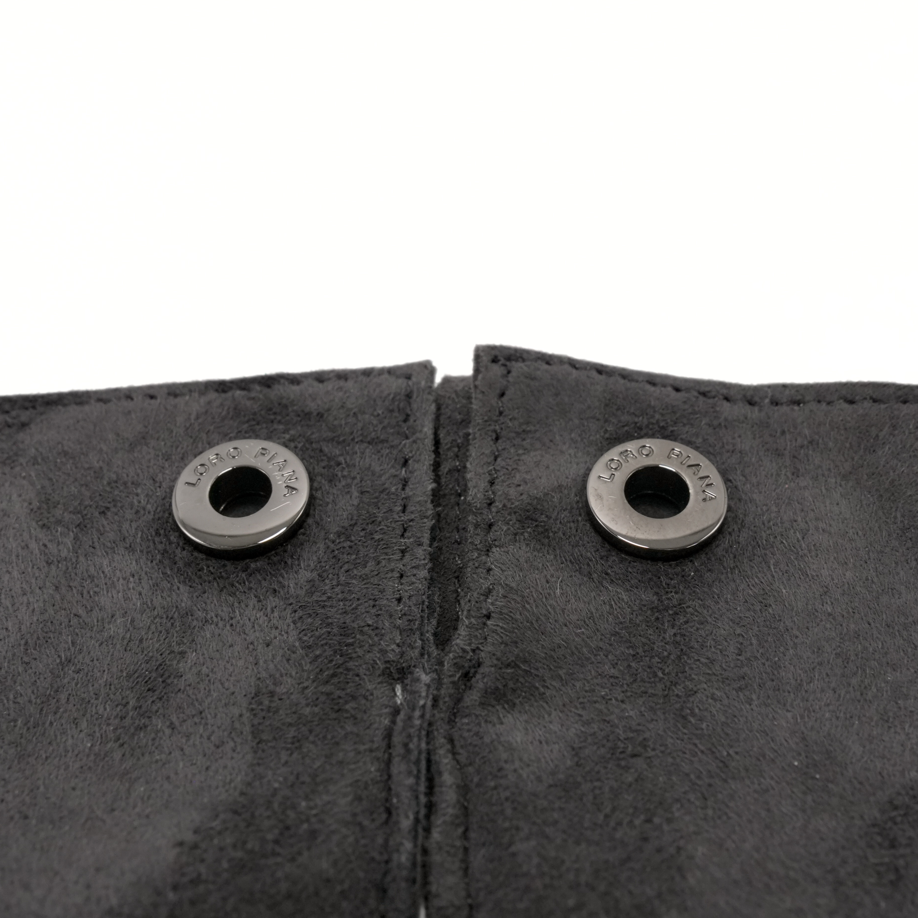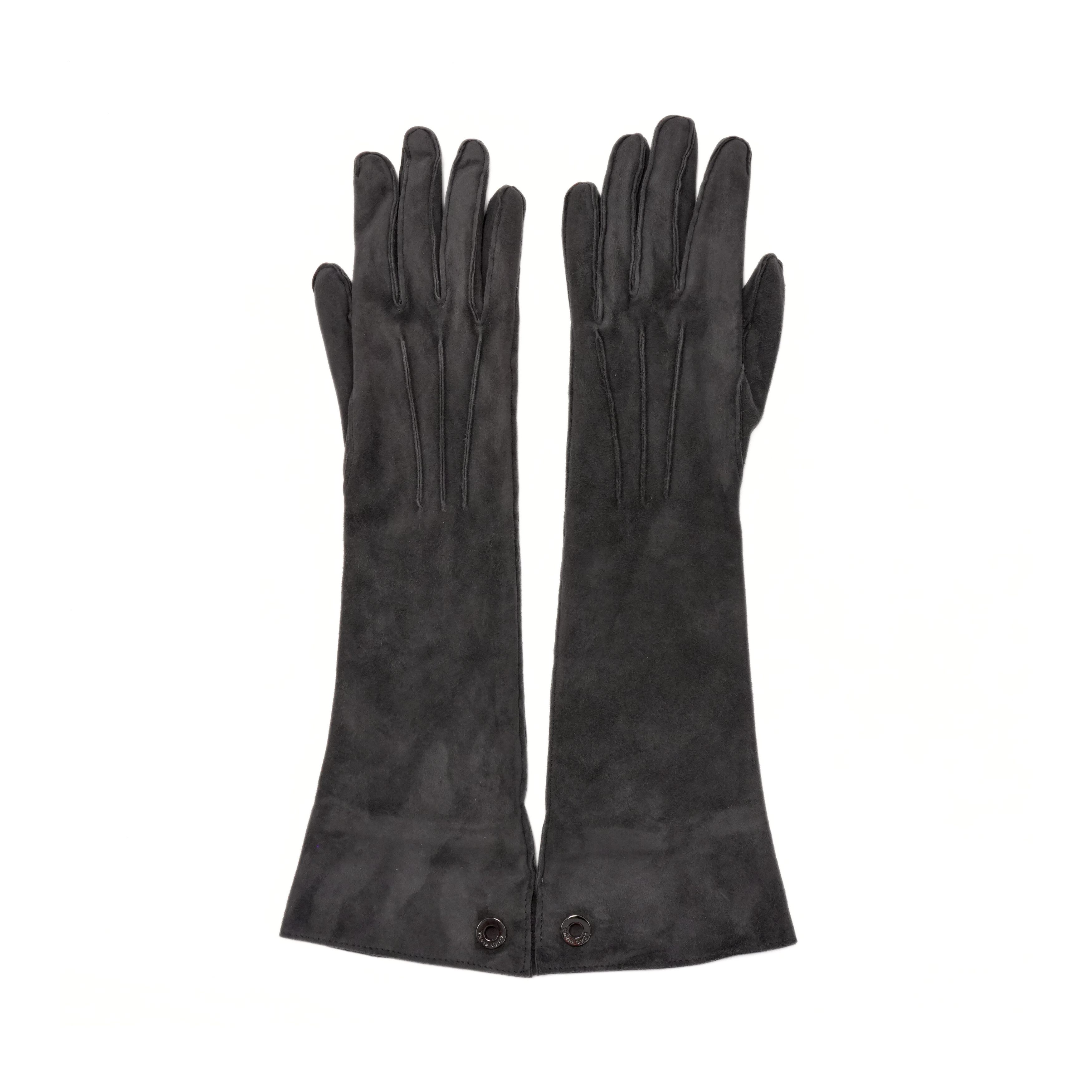 Loro Piana elbow length gloves in grey suede with gunmetal logo hardware and cashmere-silk lining.