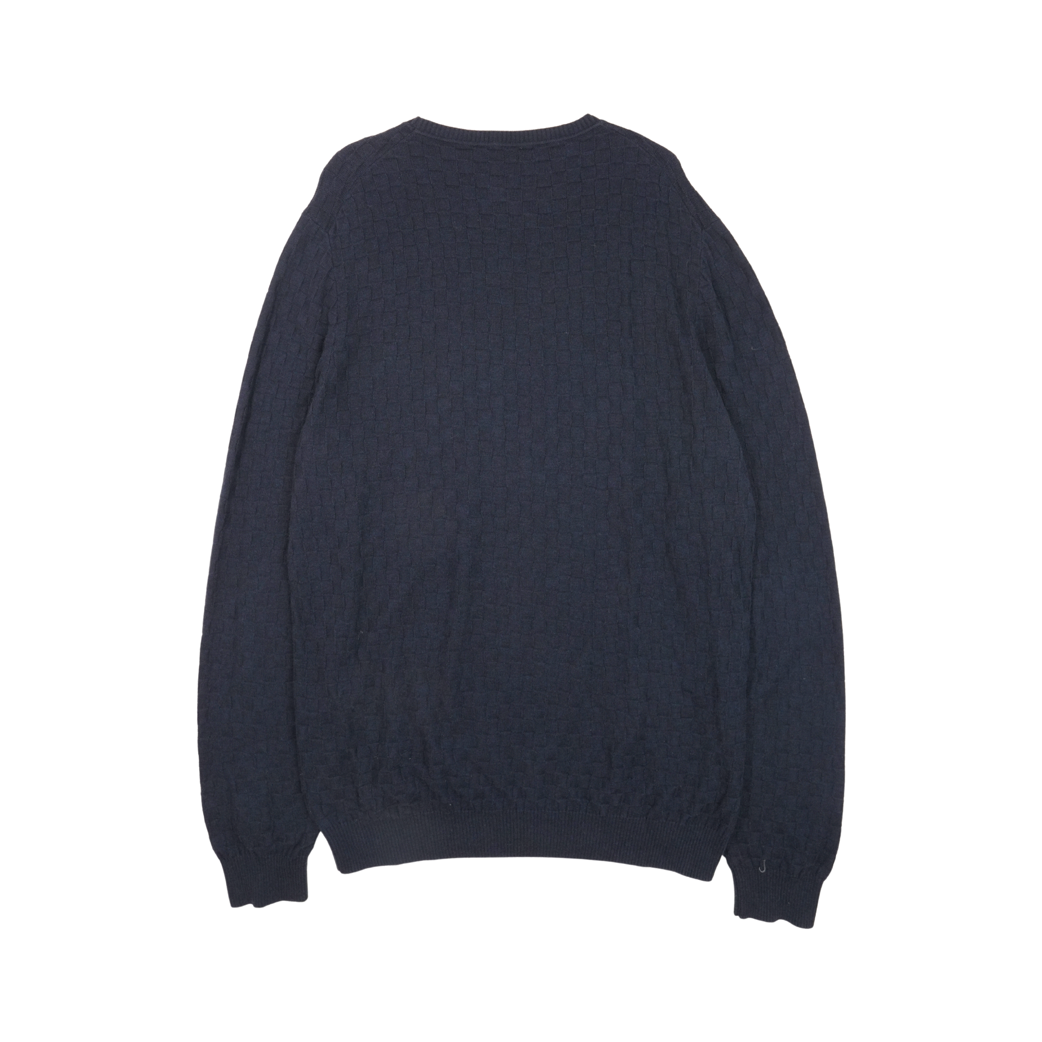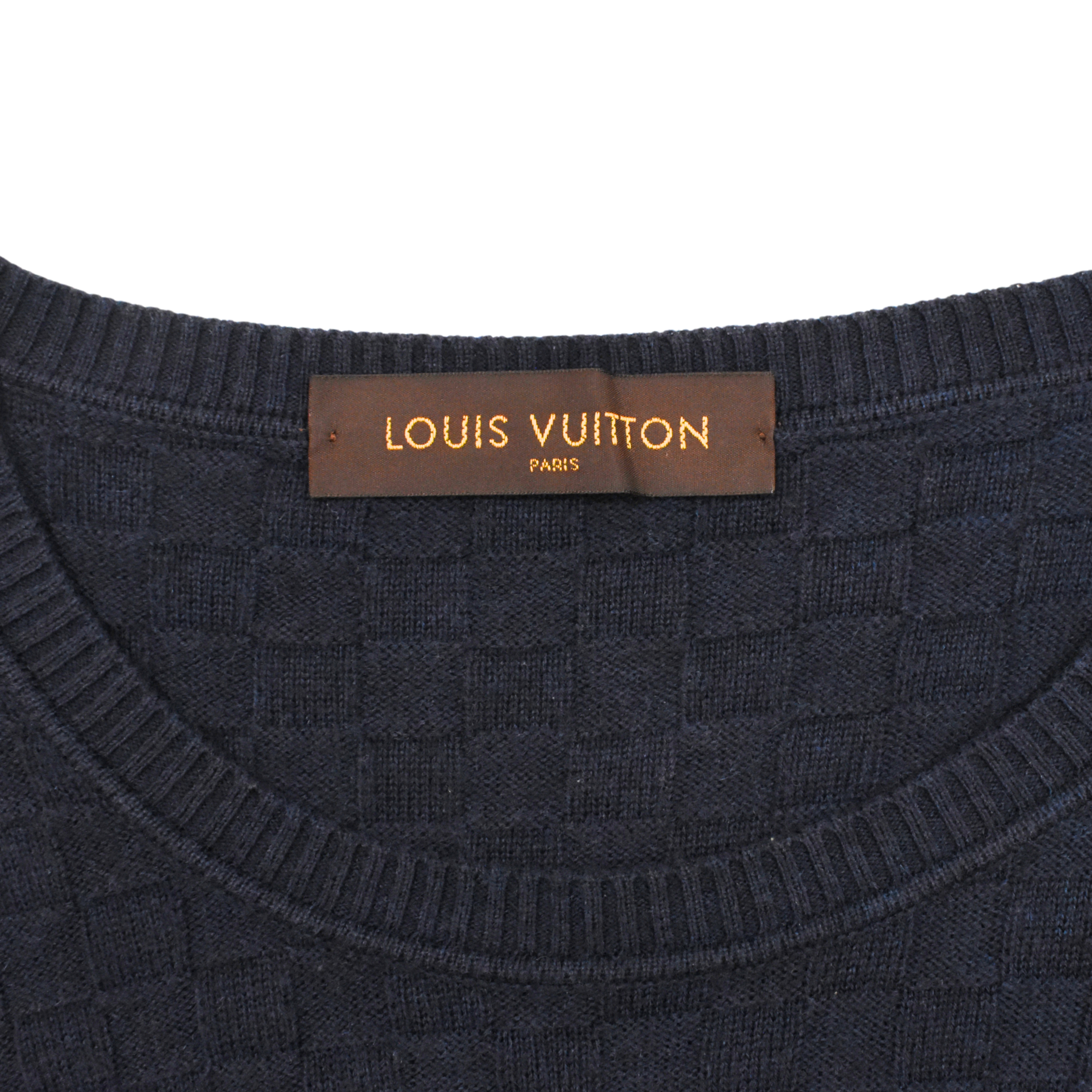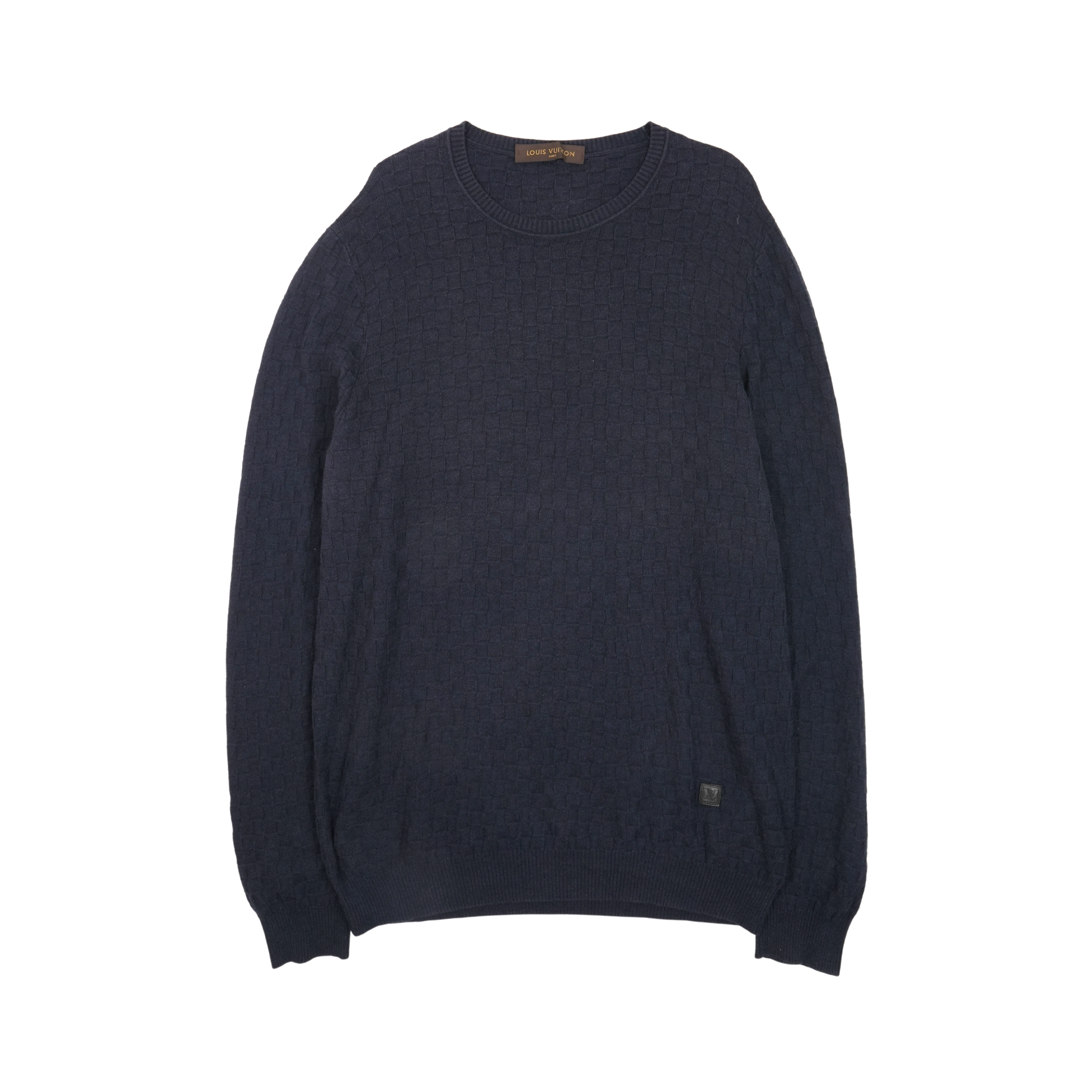 Louis Vuitton 'Damier Signature' pullover sweater in navy wool with an all-over tonal damier knit pattern, ribbed cuffs, and a small black leather logo patch on the hem.