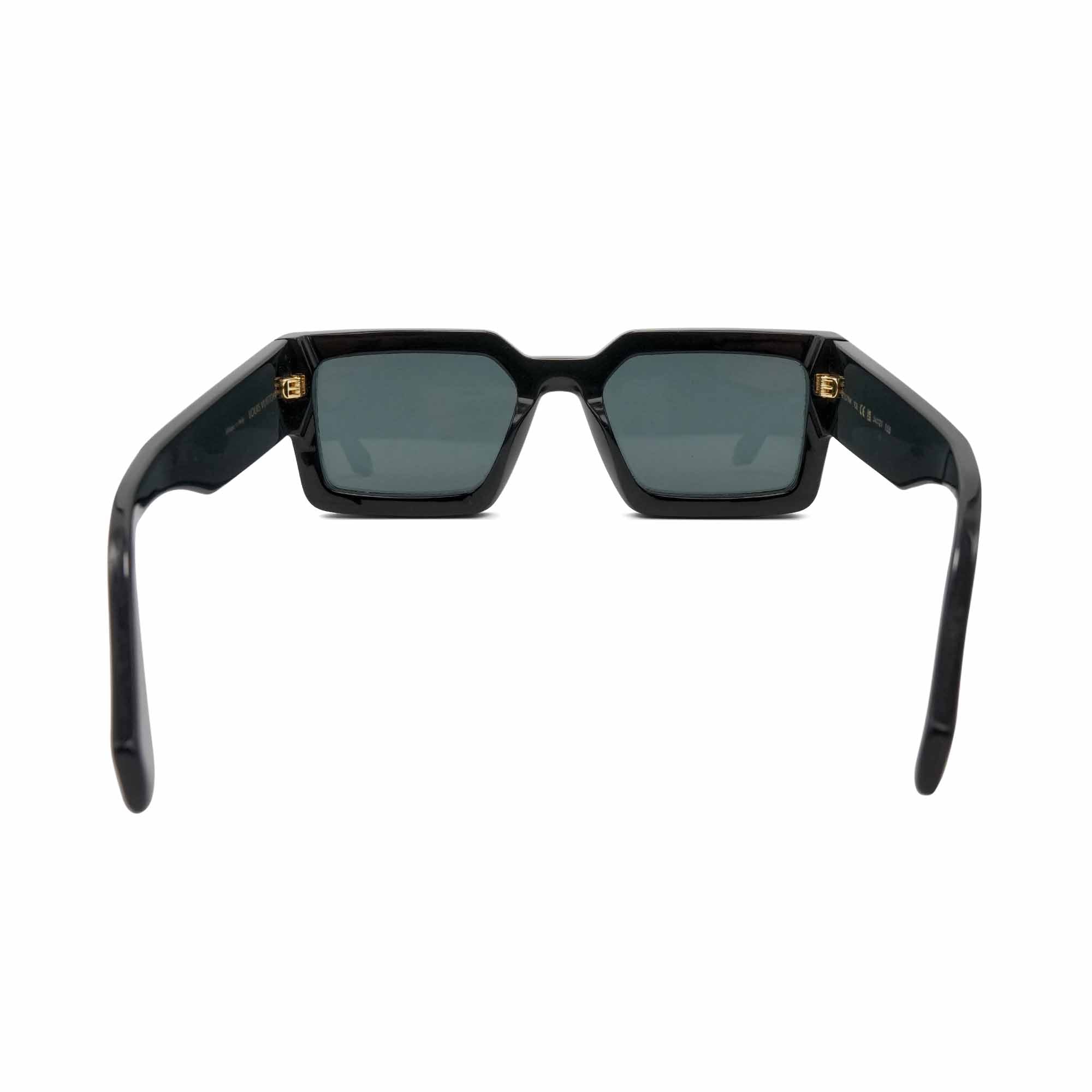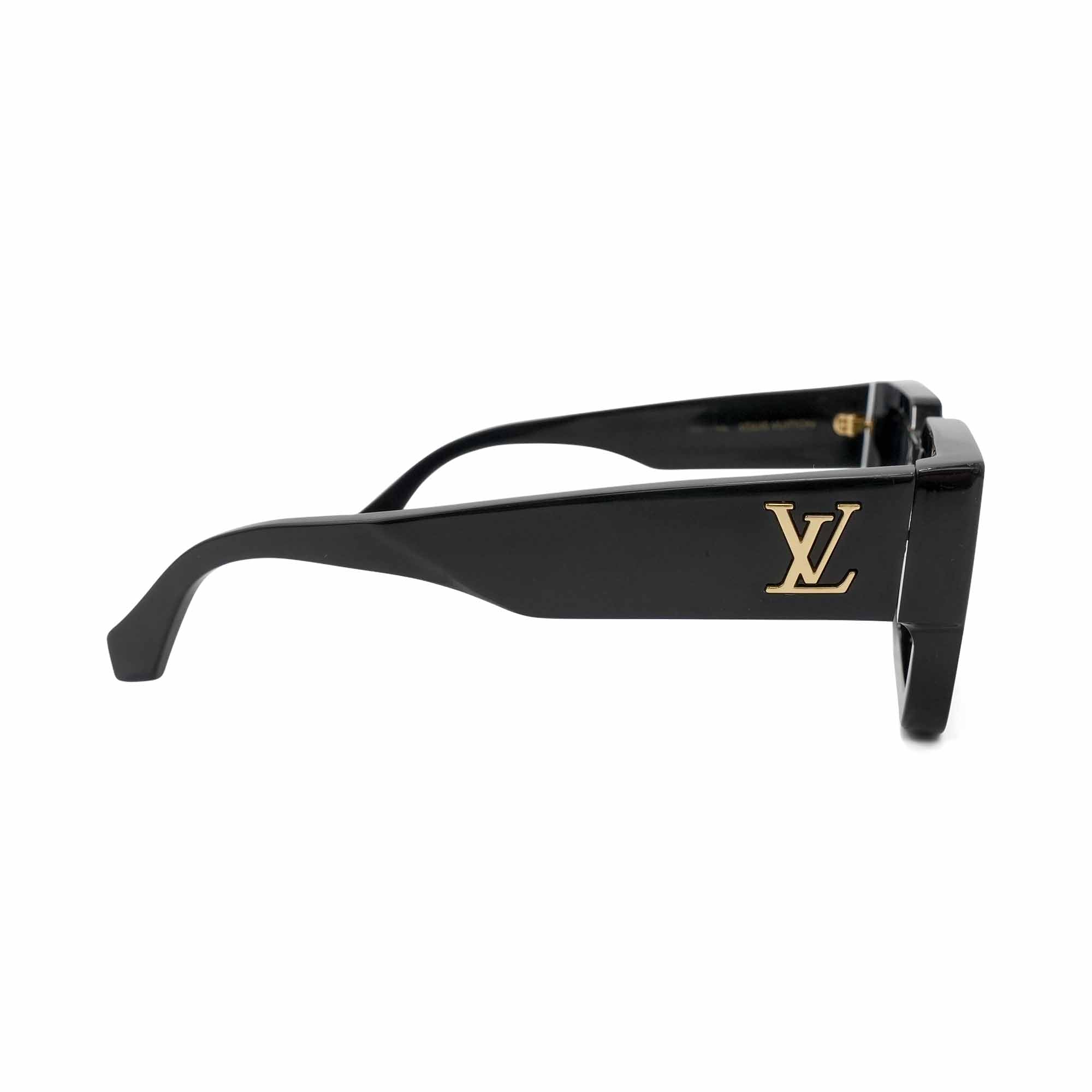 Louis Vuitton 'LV Clash' square sunglasses with thick black acetate frames and large gold LV logos on the arms.