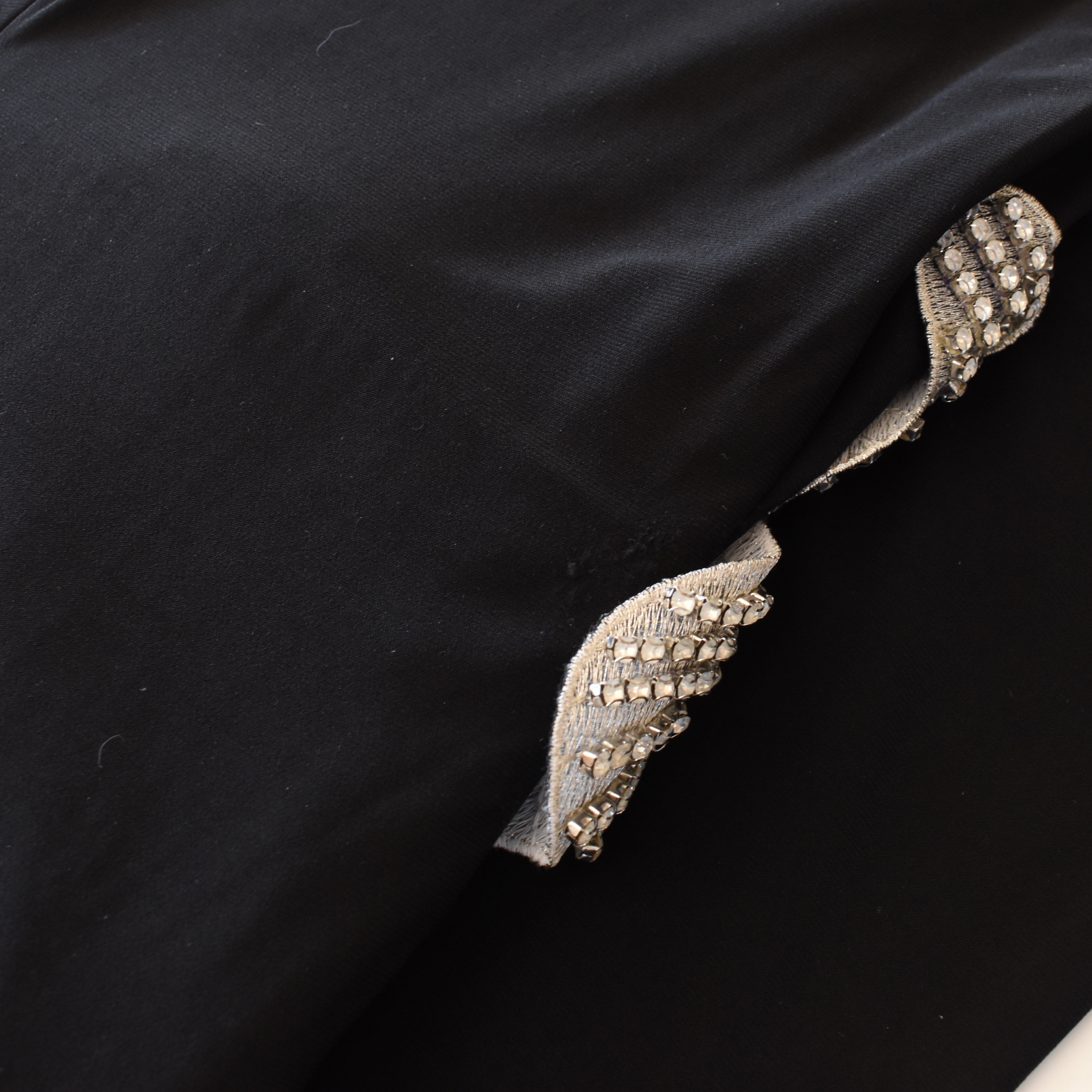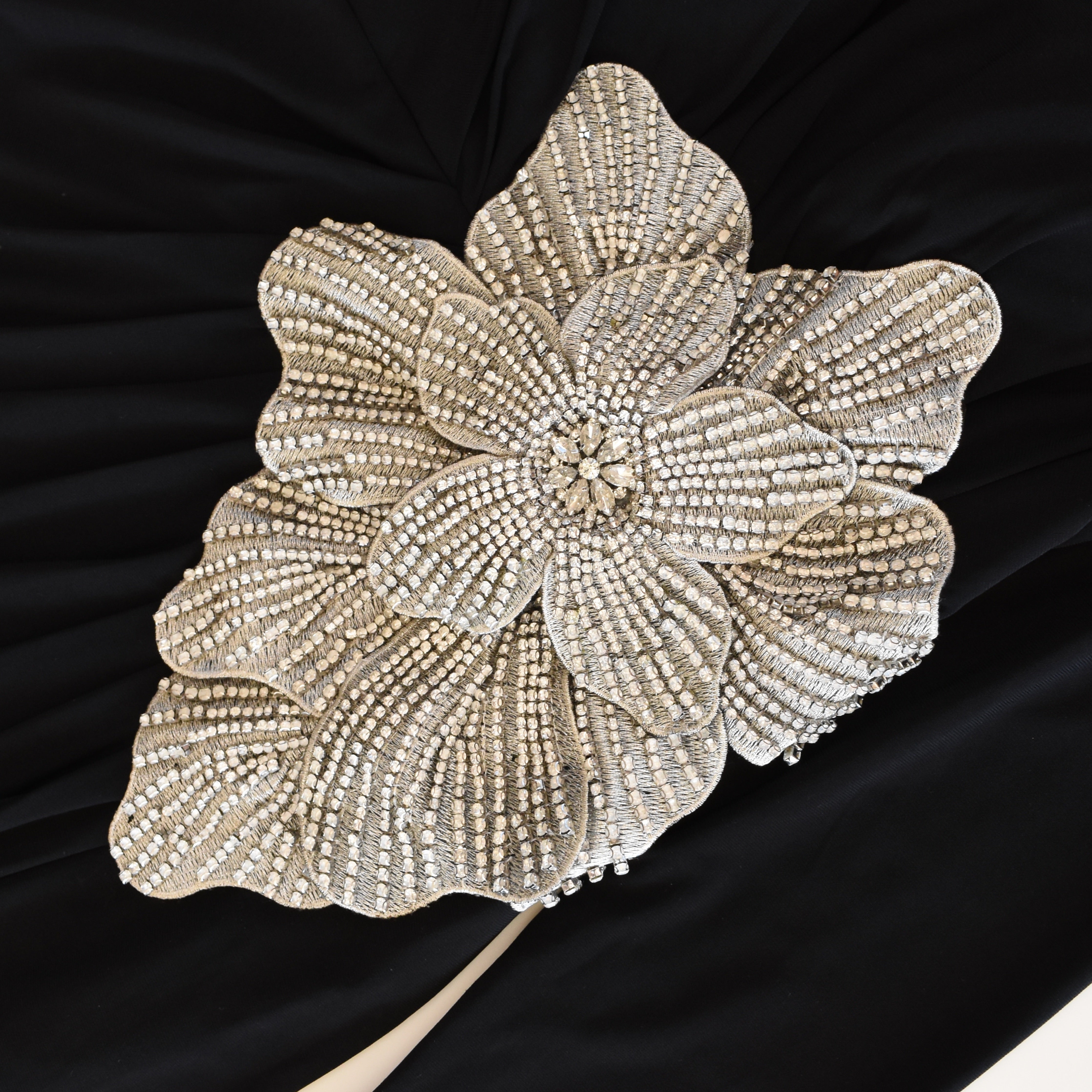 Mac Duggal full length gown in black draped jersey with large silver flower appliqué embellished with rhinestones. Features a crew neck, long sleeves, and thigh high slit.