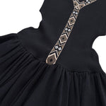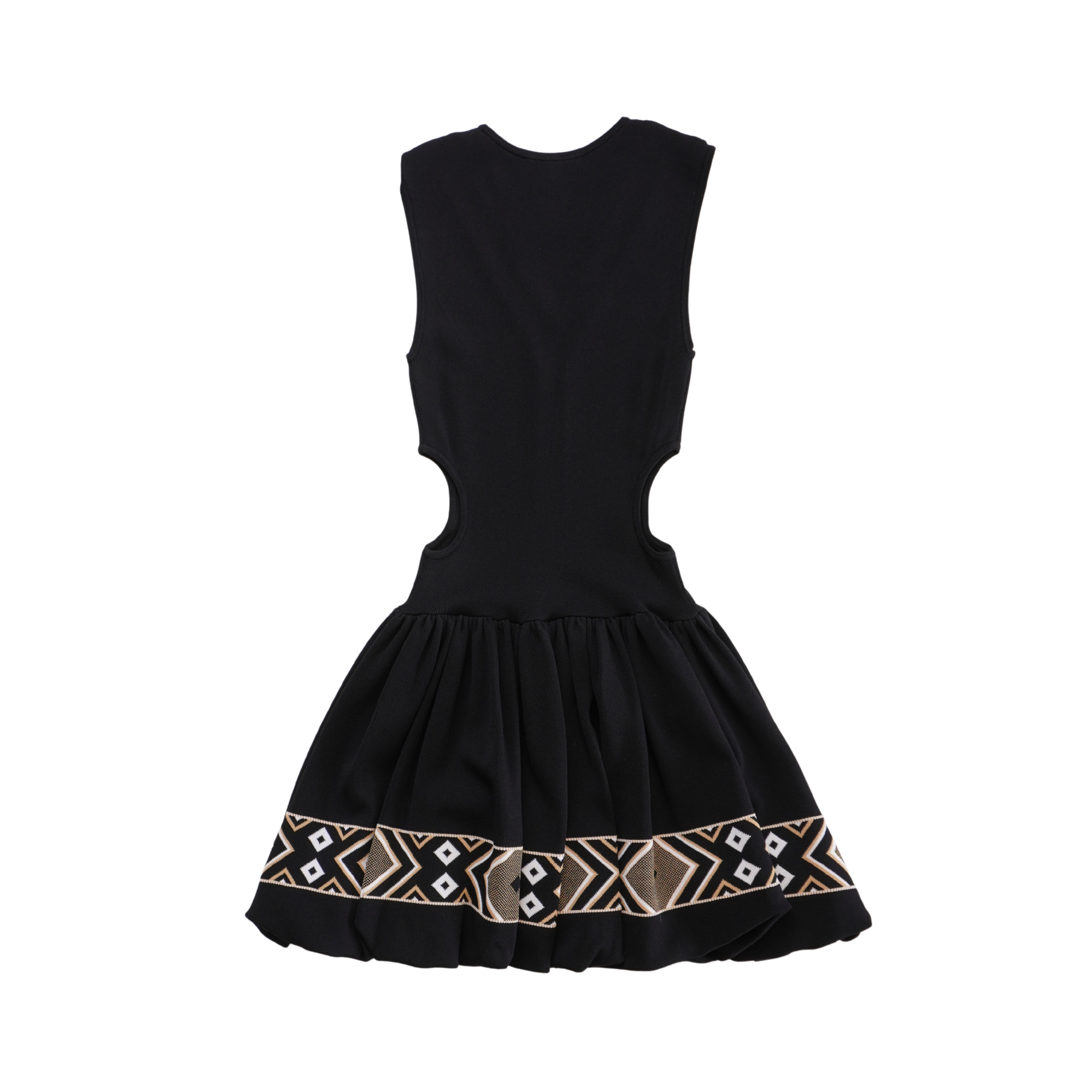 Maje mini dress in black stretch with a beige and white geometric trim along the chest and hem, cut-outs at the waist, and a flare bubble skirt.
