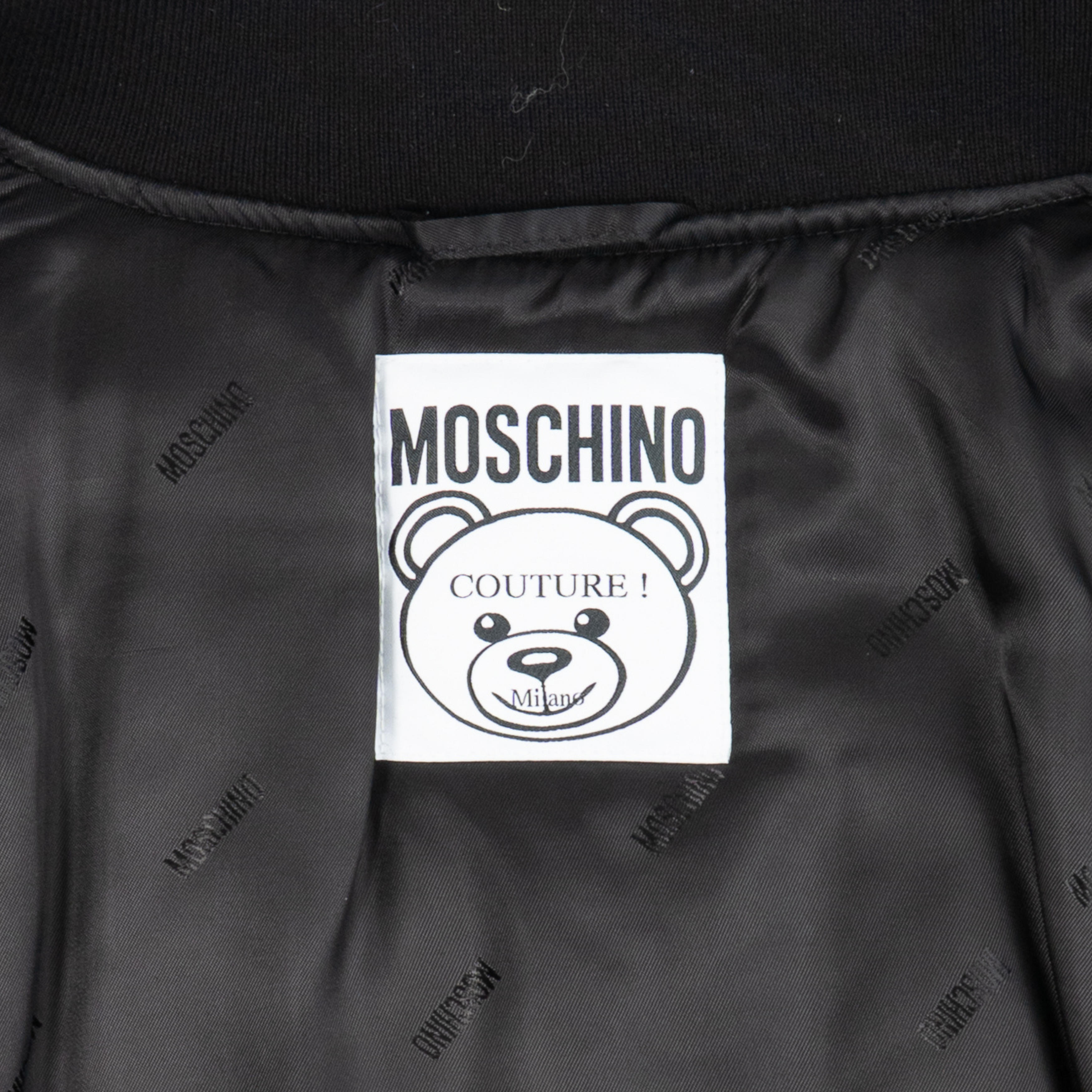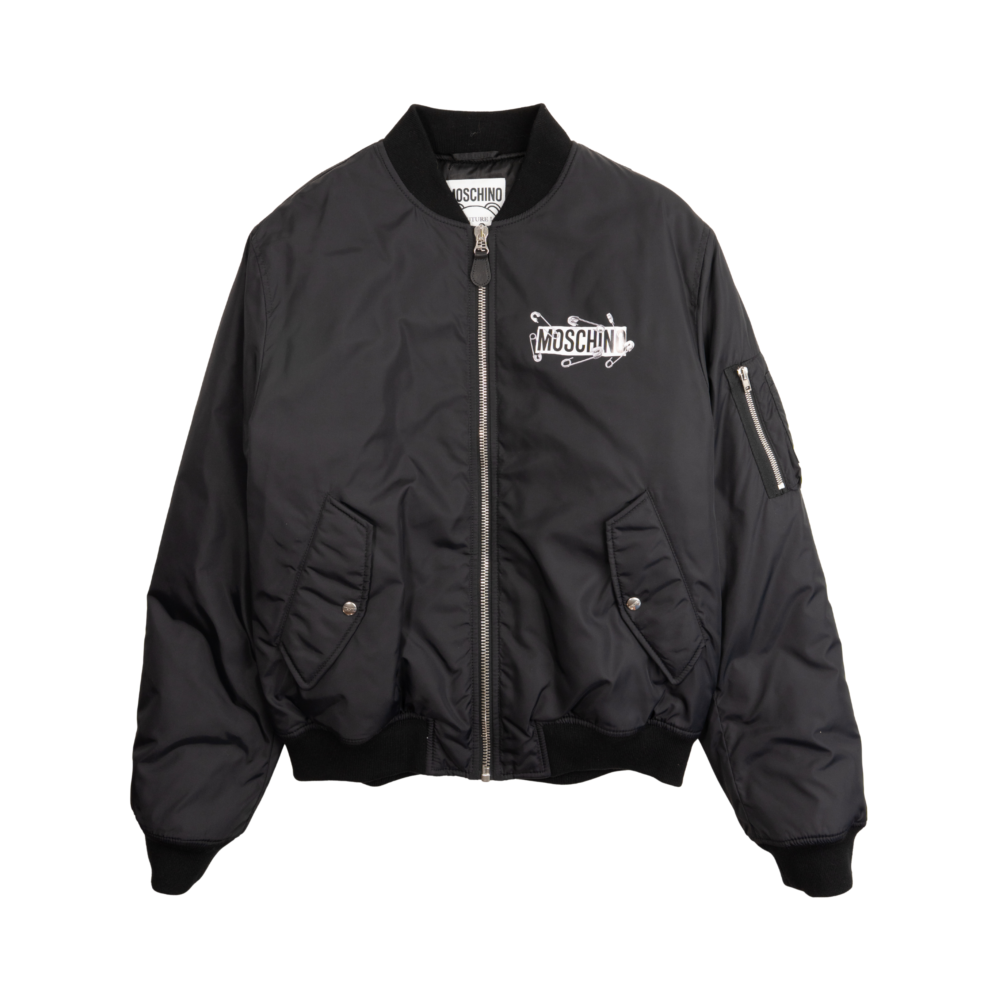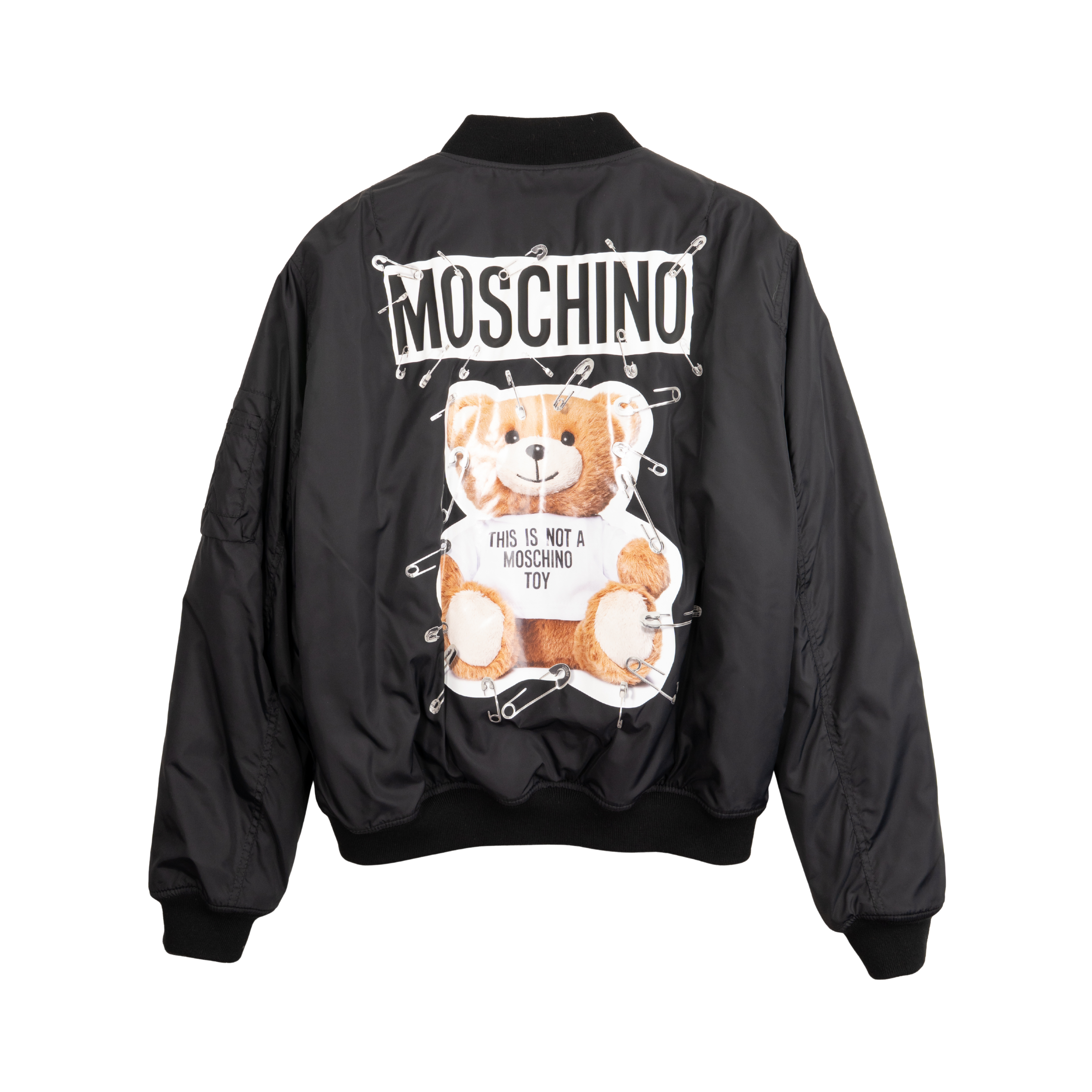 Moschino bomber jacket in black nylon with safety pin graphic details. Features 'This is not a Moschino Toy' teddy bear graphic on the back and large safety pinned logo across the back, small safety pin logo on the chest, snap closure flap pockets on the front, and pocket on the arm.