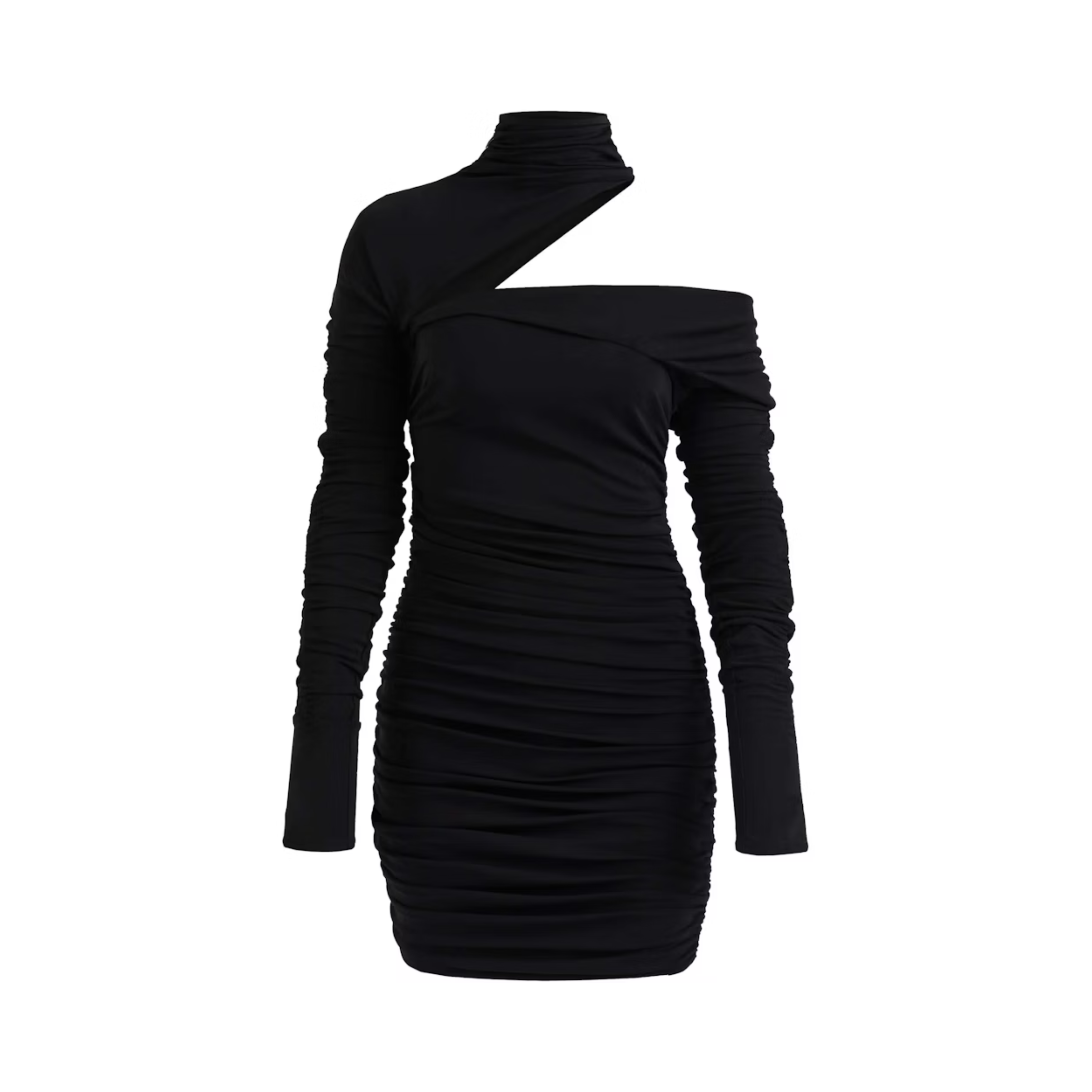 Mugler x H&M 'Gathered One Shoulder' mini dress in black with a large shoulder cut out and ruching throughout.