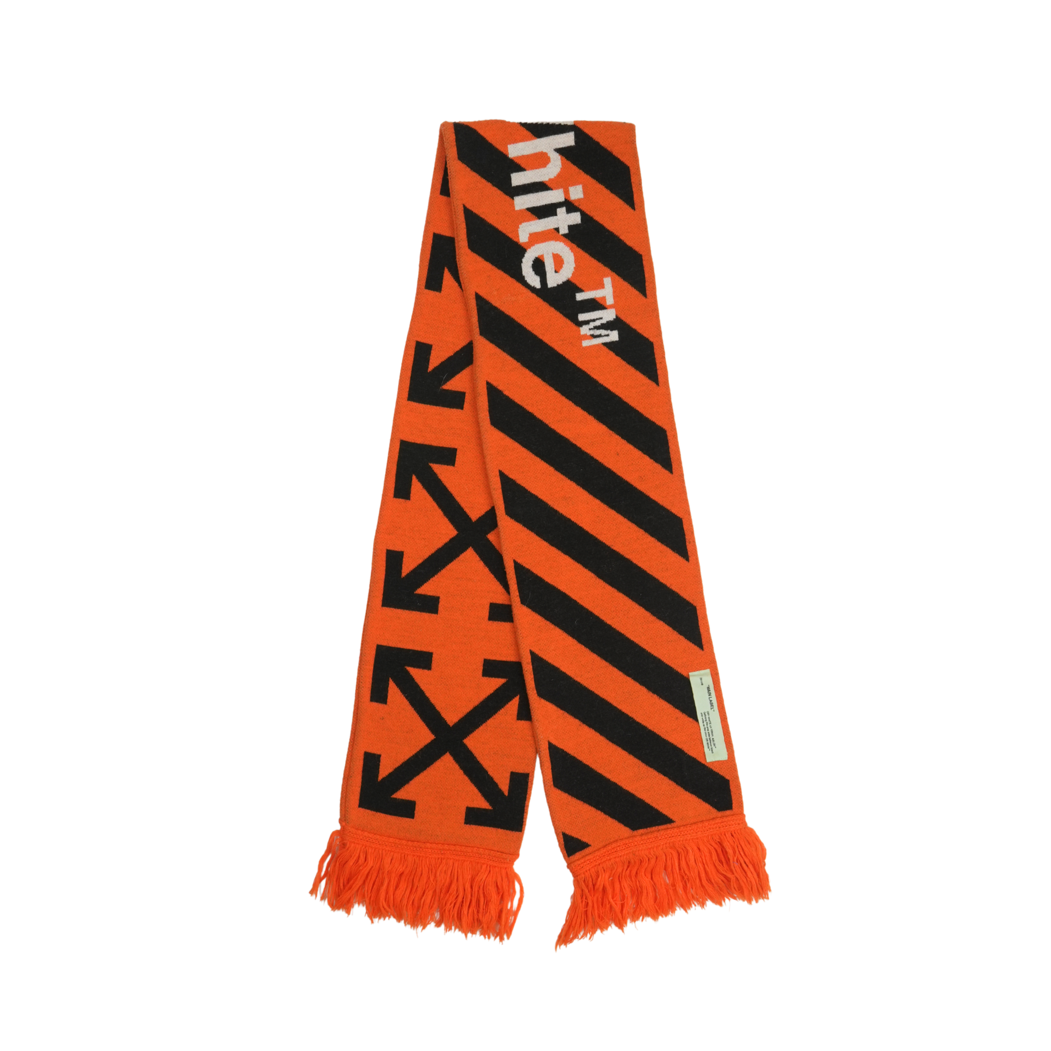 Off-white long rectangular scarf in orange wool with fringed edges . Features black diagonal arrow print on one side and black diagonal stripe print with off-white logo on other side.