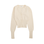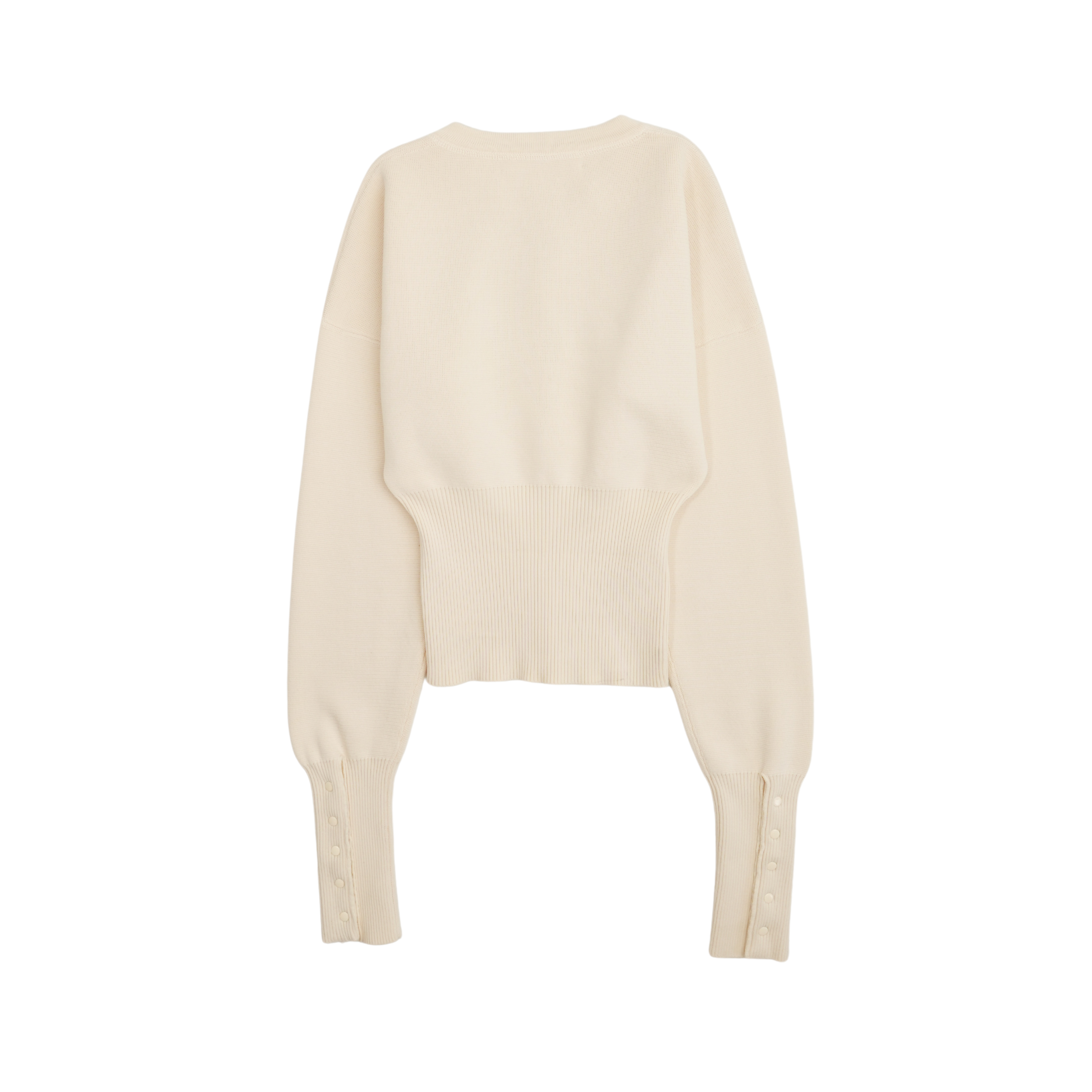 Orseund Iris 'The Weekend' knit cardigan in a cream cotton-silk blend. Features ribbed waist and cuff details for cinched effect, monochromatic cream snap buttons down front and on sleeves.