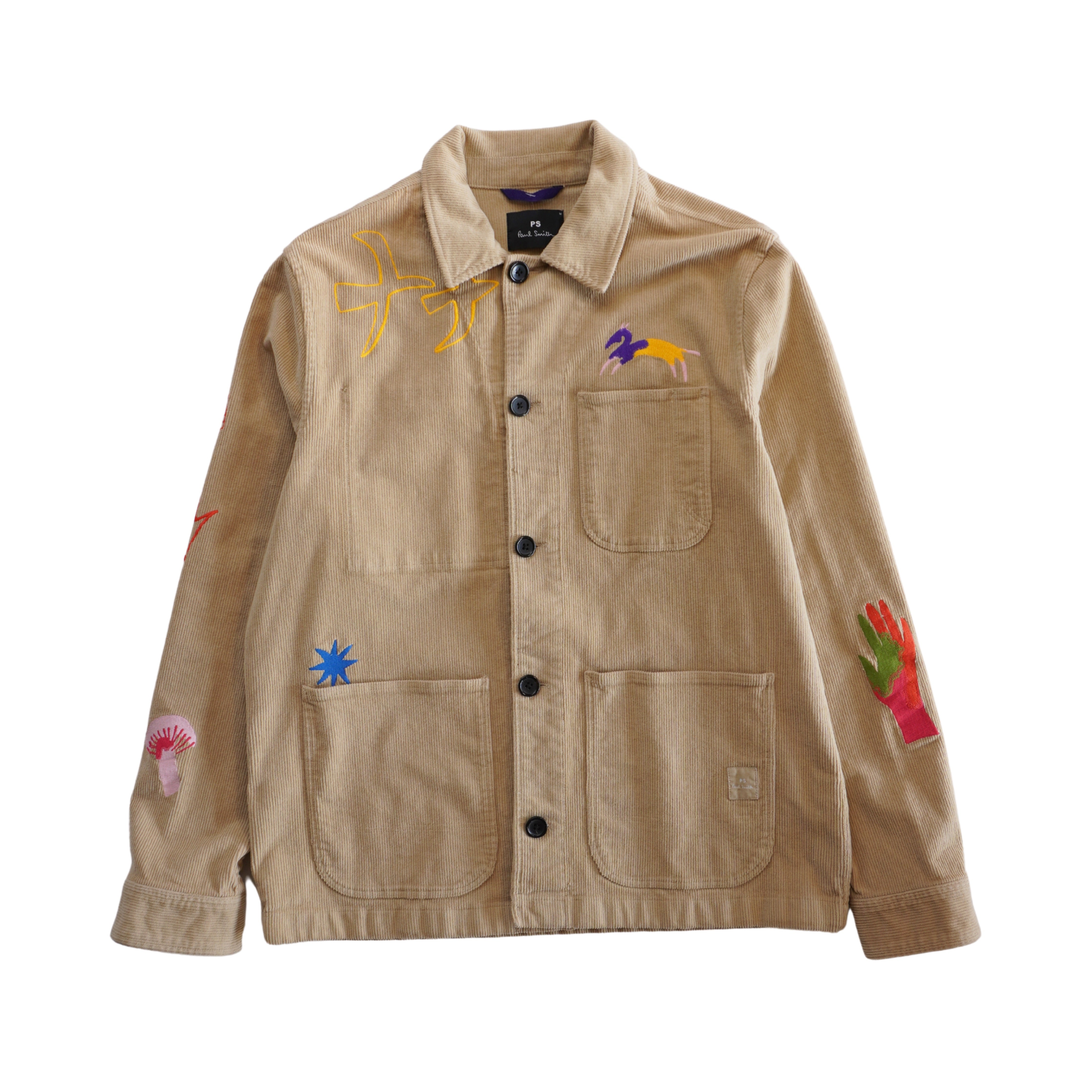 Paul Smith workwear jacket in beige corduroy with all-over multicolour embroidered designs, front patch pockets, and black buttons.