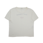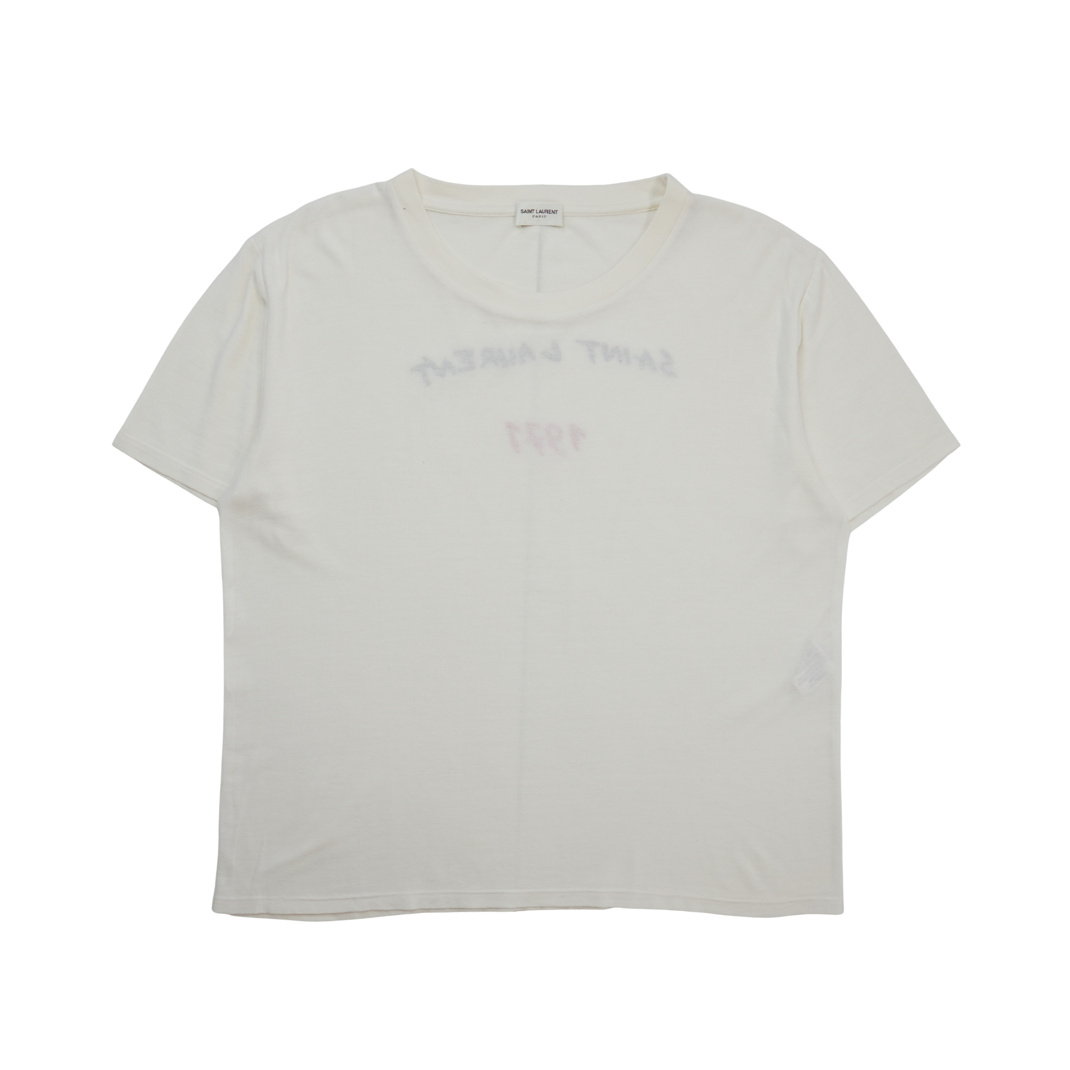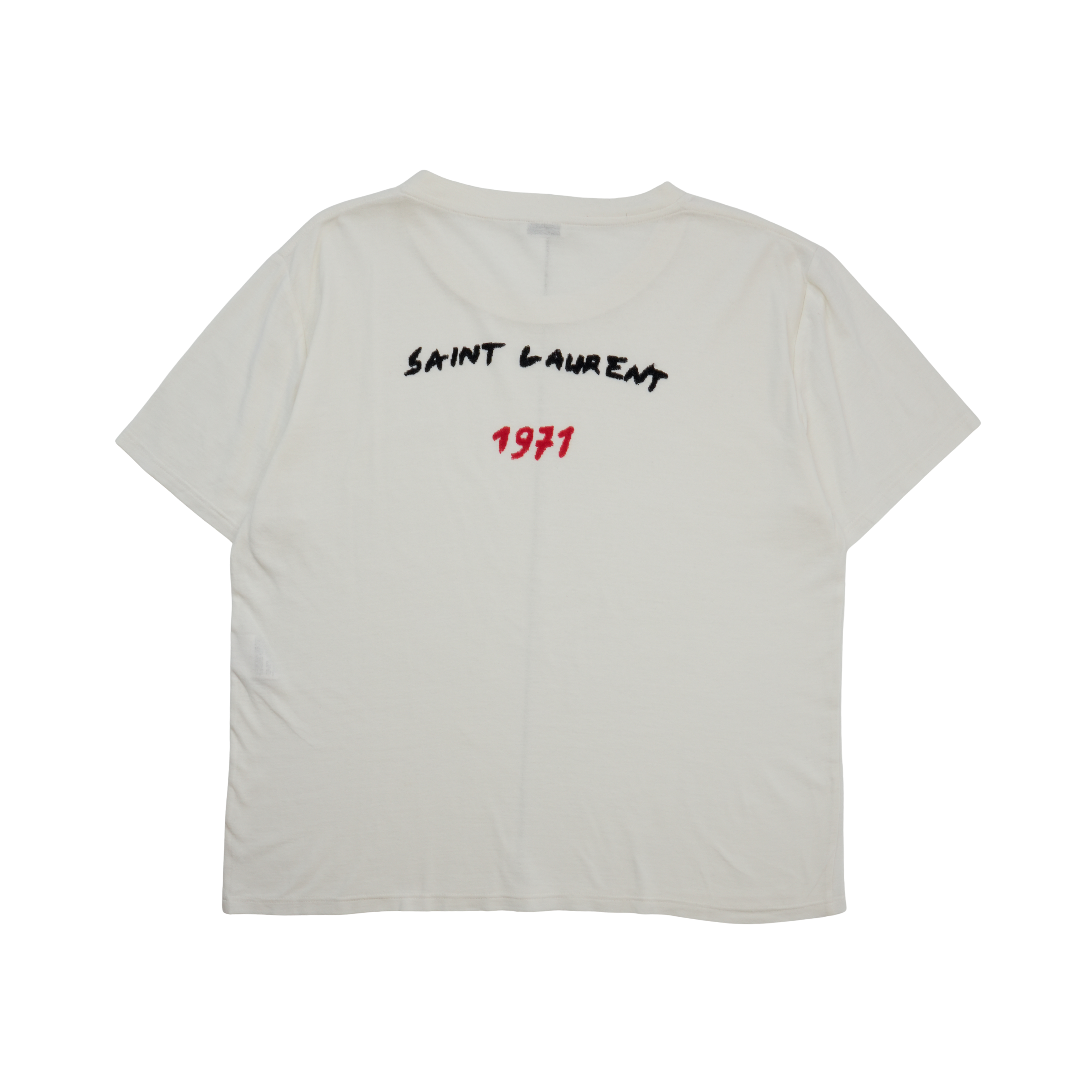 Saint Laurent cream short sleeve t-shirt with red and black flocked logo on the back.