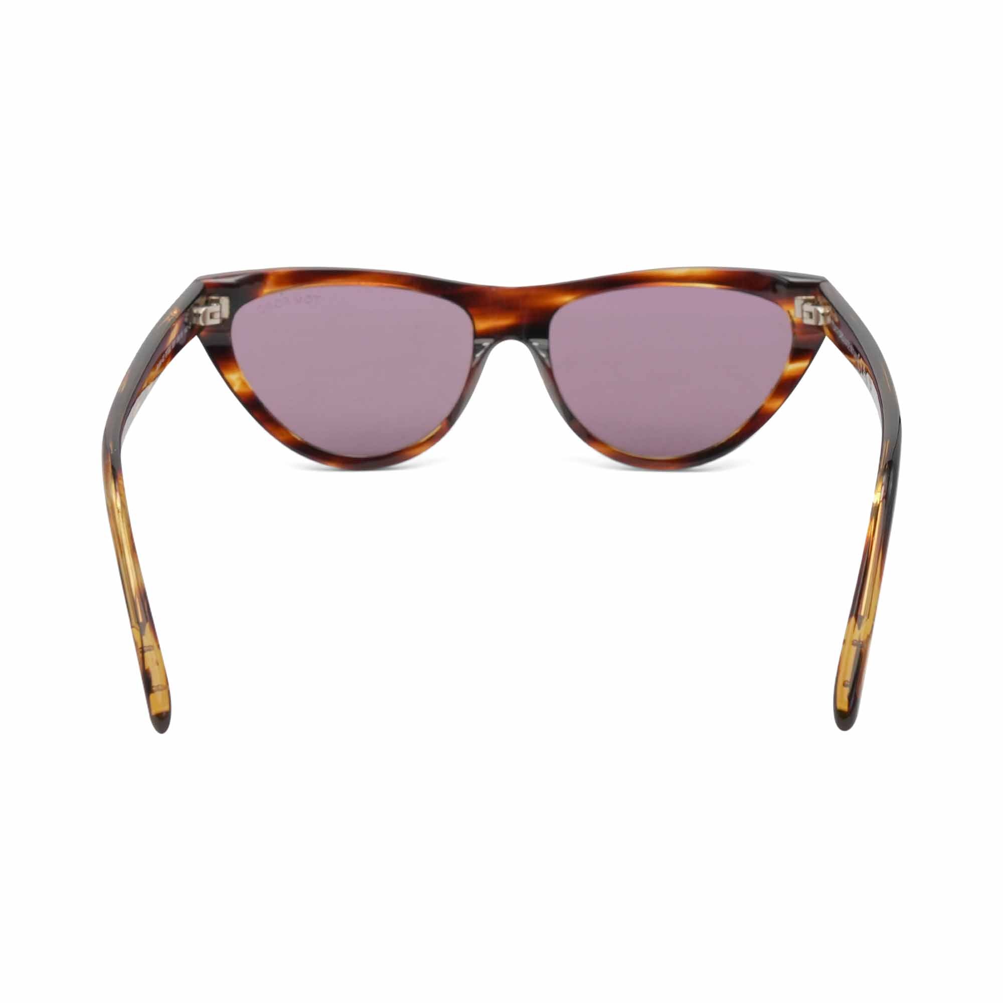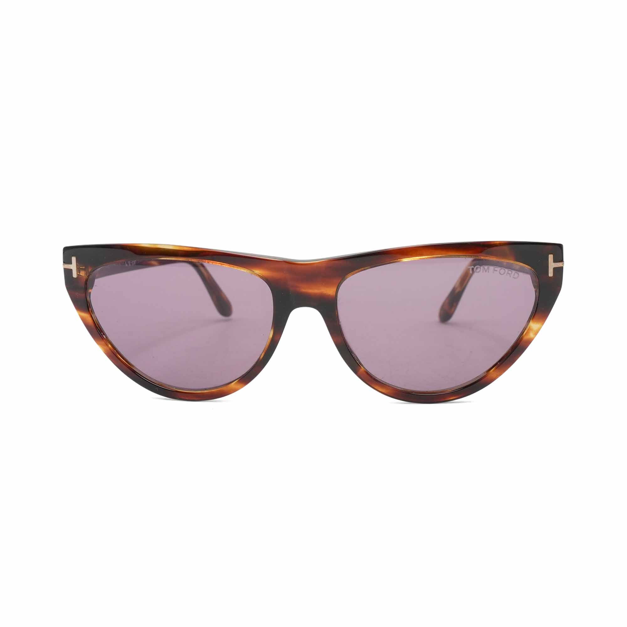 Tom Ford 'Amber 02' sunglasses in brown tortoise acetate with purple cat-eye lenses, a flat brow, and signature gold 'T' bars on the temples.