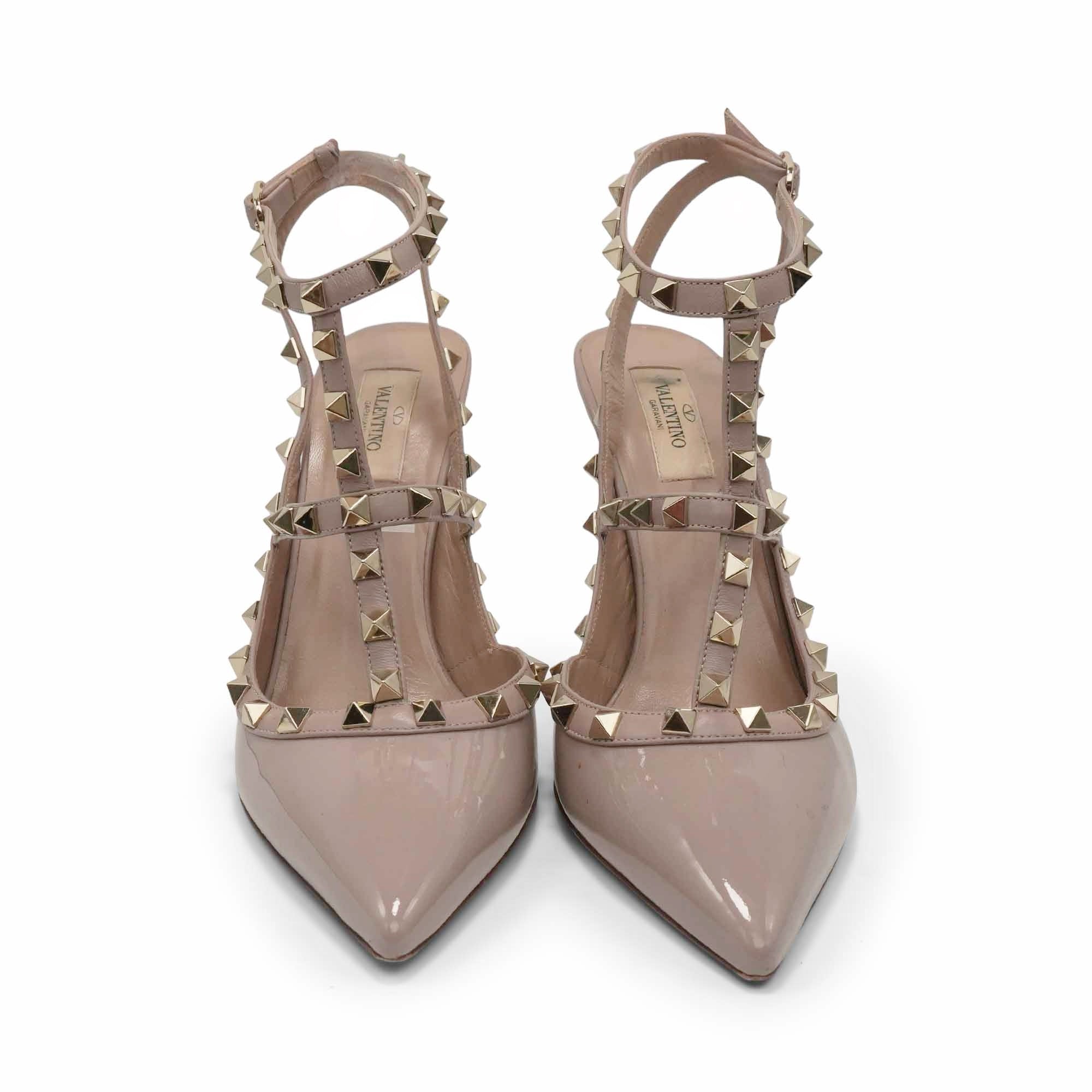 Valentino pointed-toe cage heels in light blush pink patent leather with stiletto heels and brushed gold rockstud detailing.