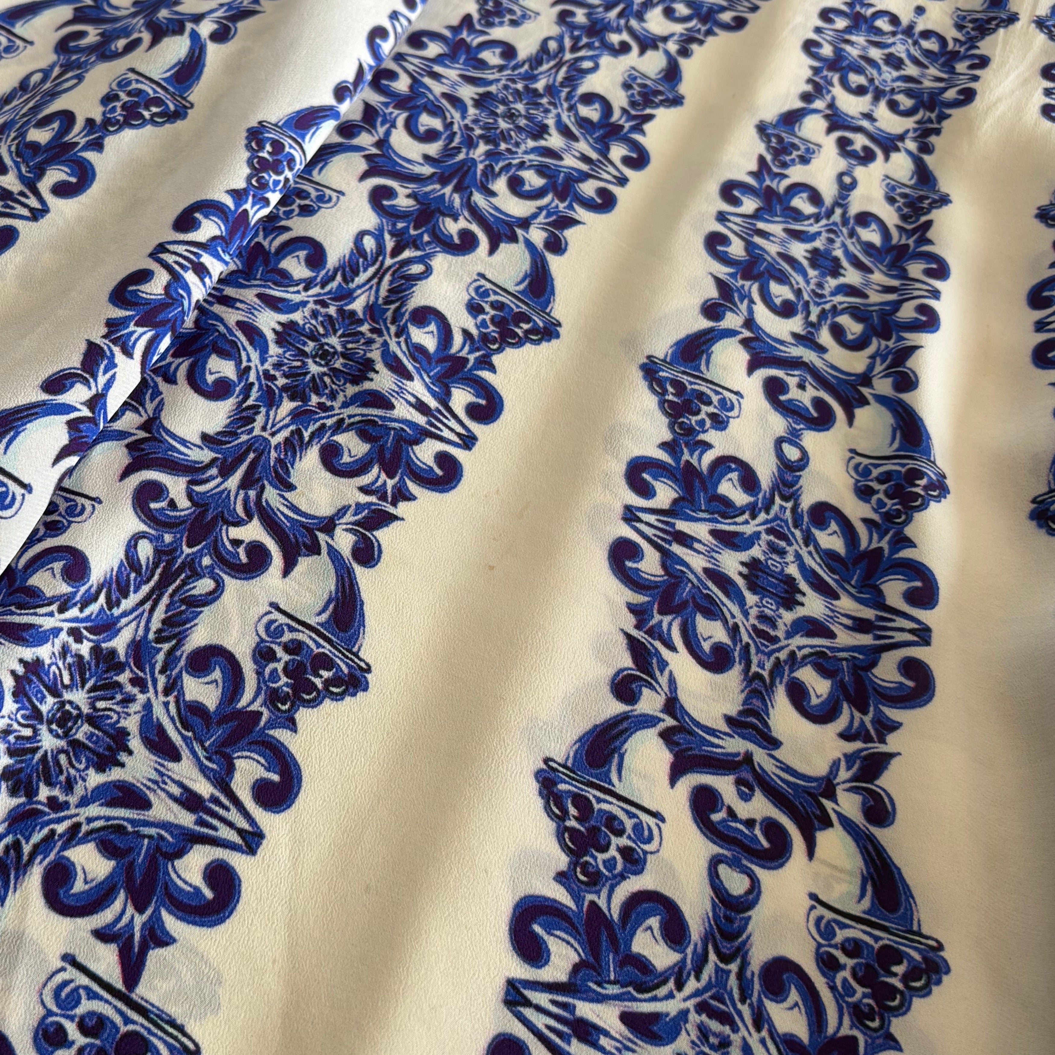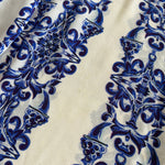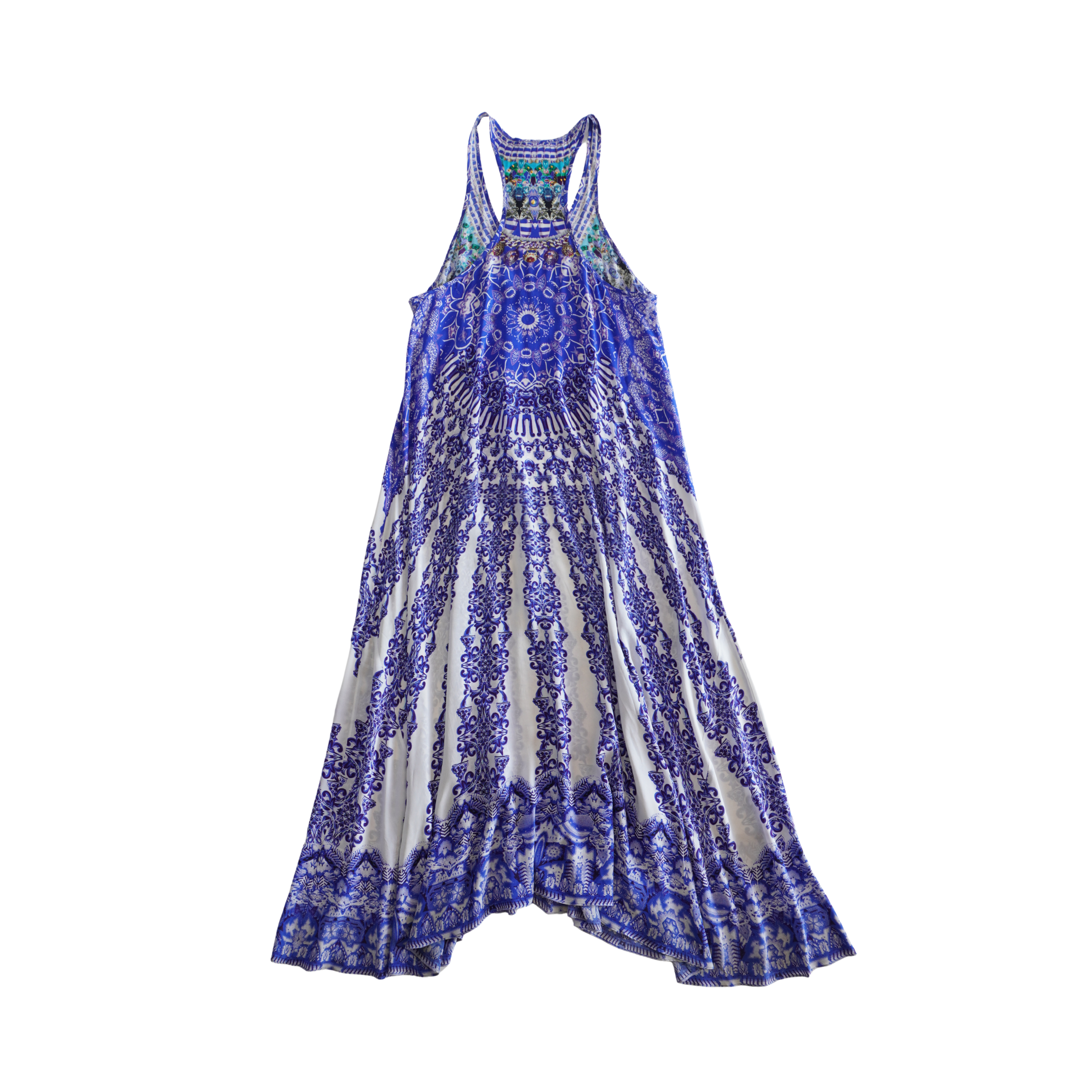 Camilla 'It Was All A Dream' A-line maxi dress in blue and white silk with ornate brocade print and V-neckline featuring rhinestone details.