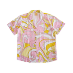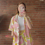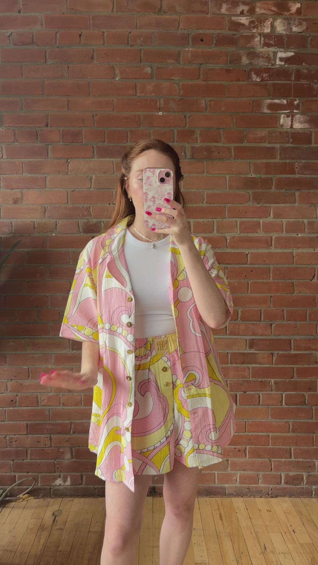 Cin Cin 'Troppo' bowling shirt and 'Breaker' boxer short set in pastel pink and yellow retro abstract print. The shirt has gold buttons down the front and an oversized fit. The shorts are hight waisted with an elastic waistband, embroidered logo patch, and decorative gold buttons.