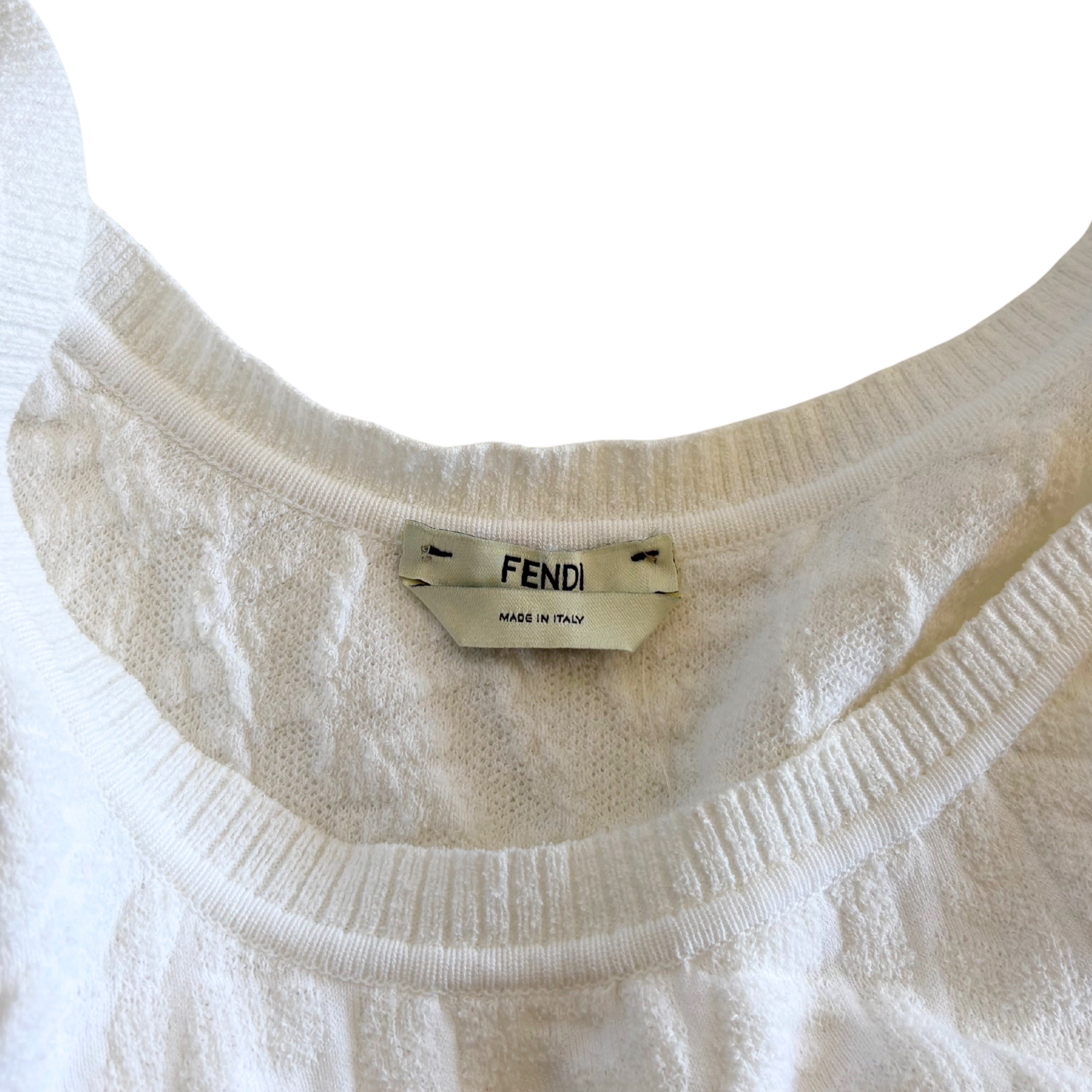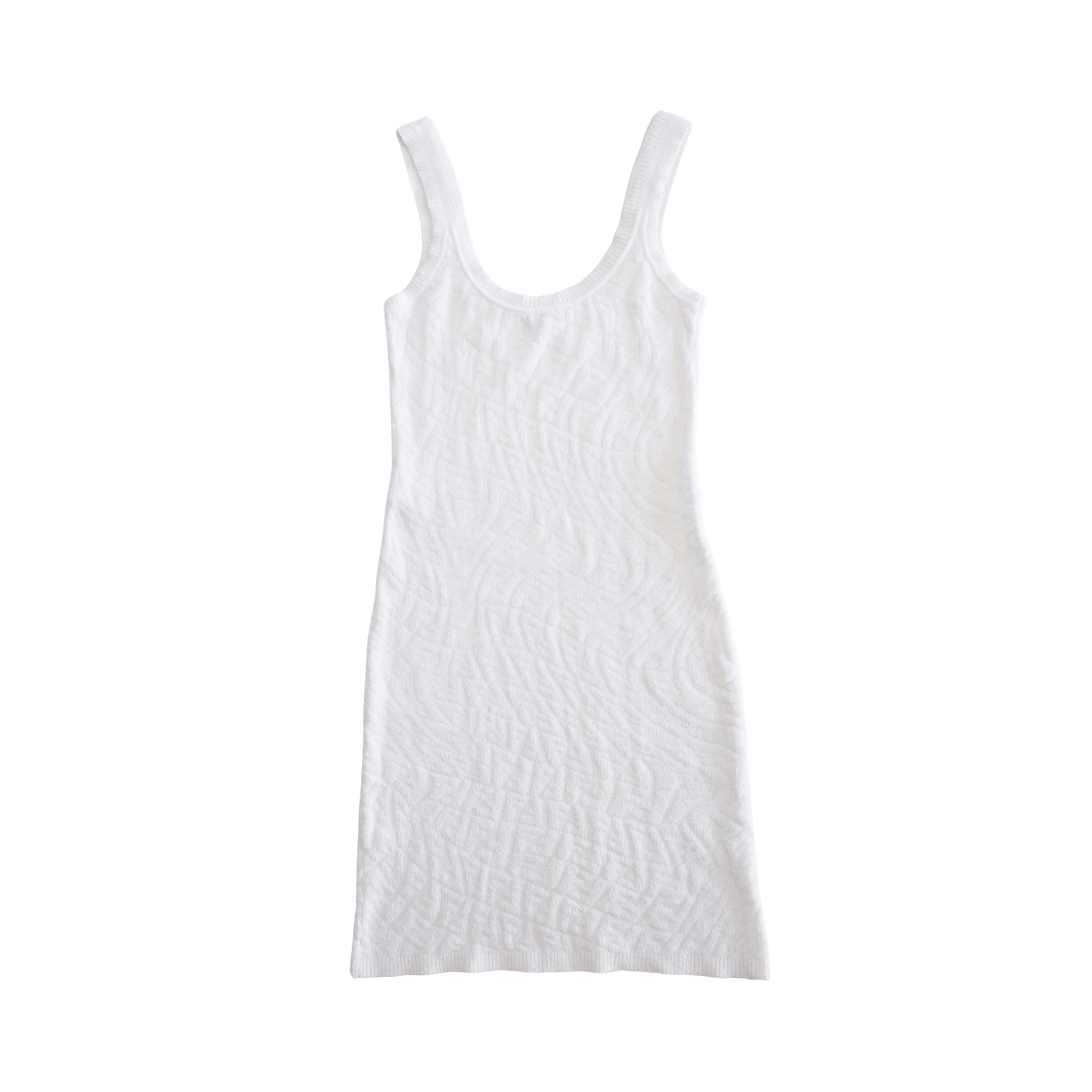Fendi 'FF Vertigo' bodycon scoop neck dress in white stretch terry cloth with textured zucca monogram knit.