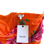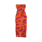 Sau Lee 'Farrah' strapless midi dress in ruched orange mesh pink floral print. Features a partial lining and slit in the back.
