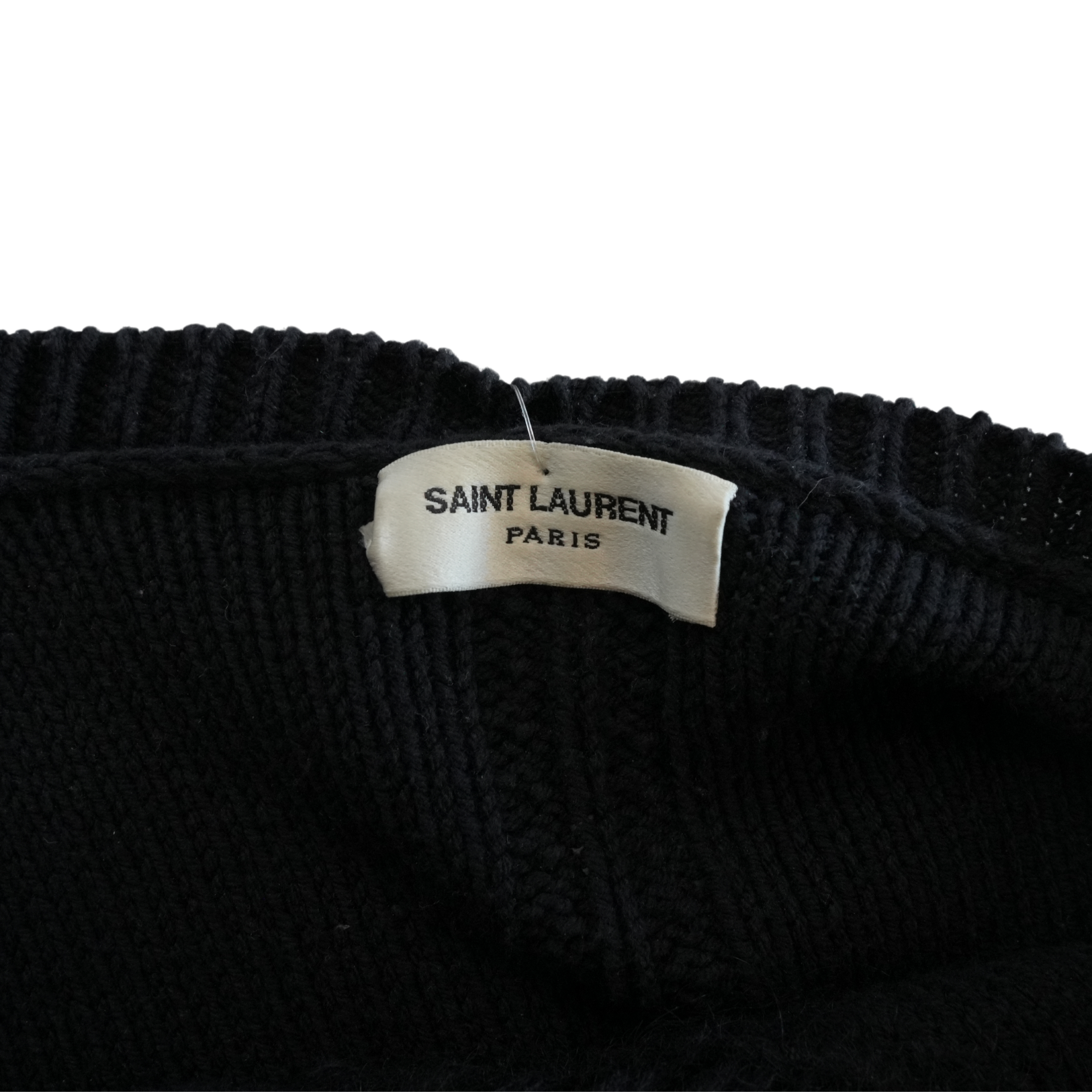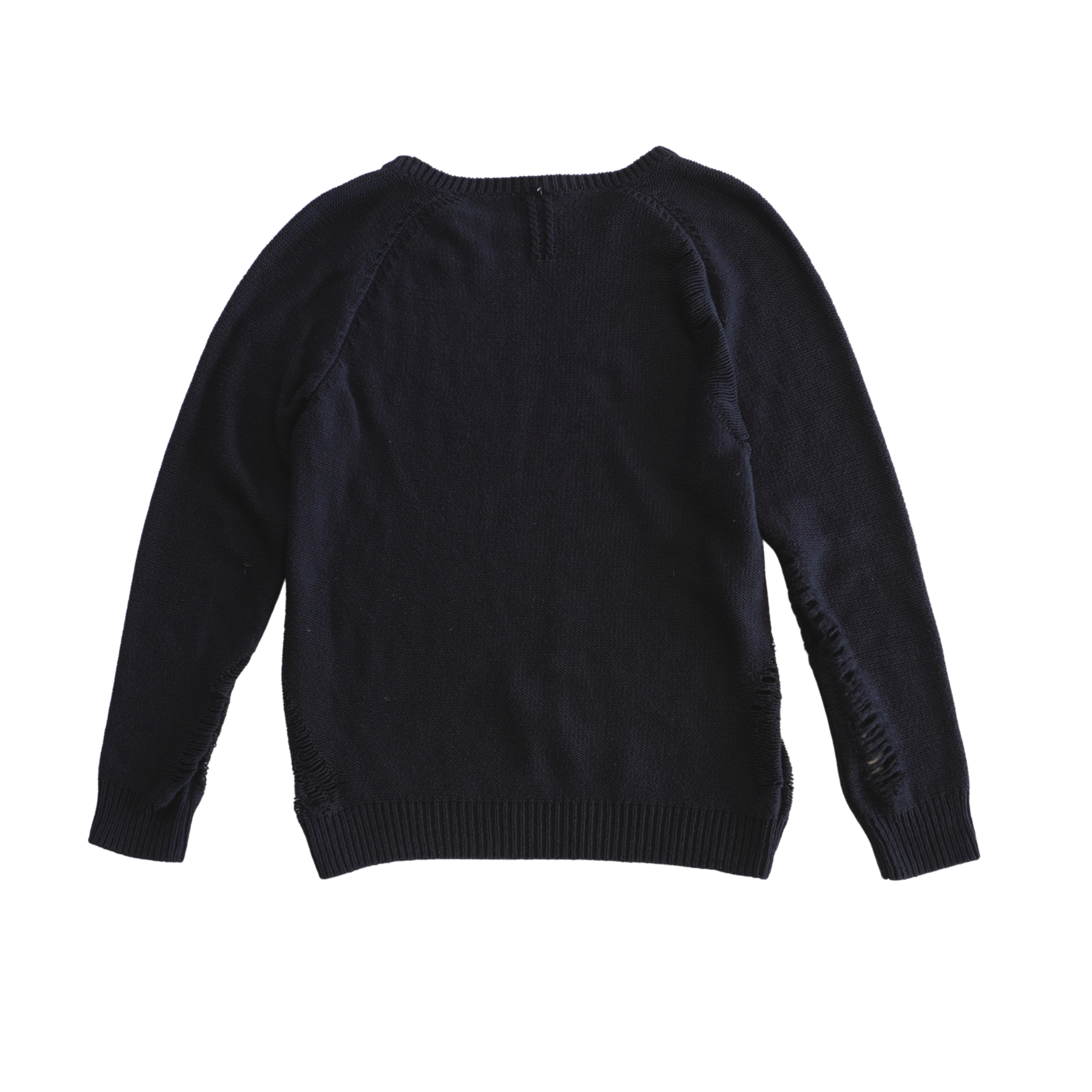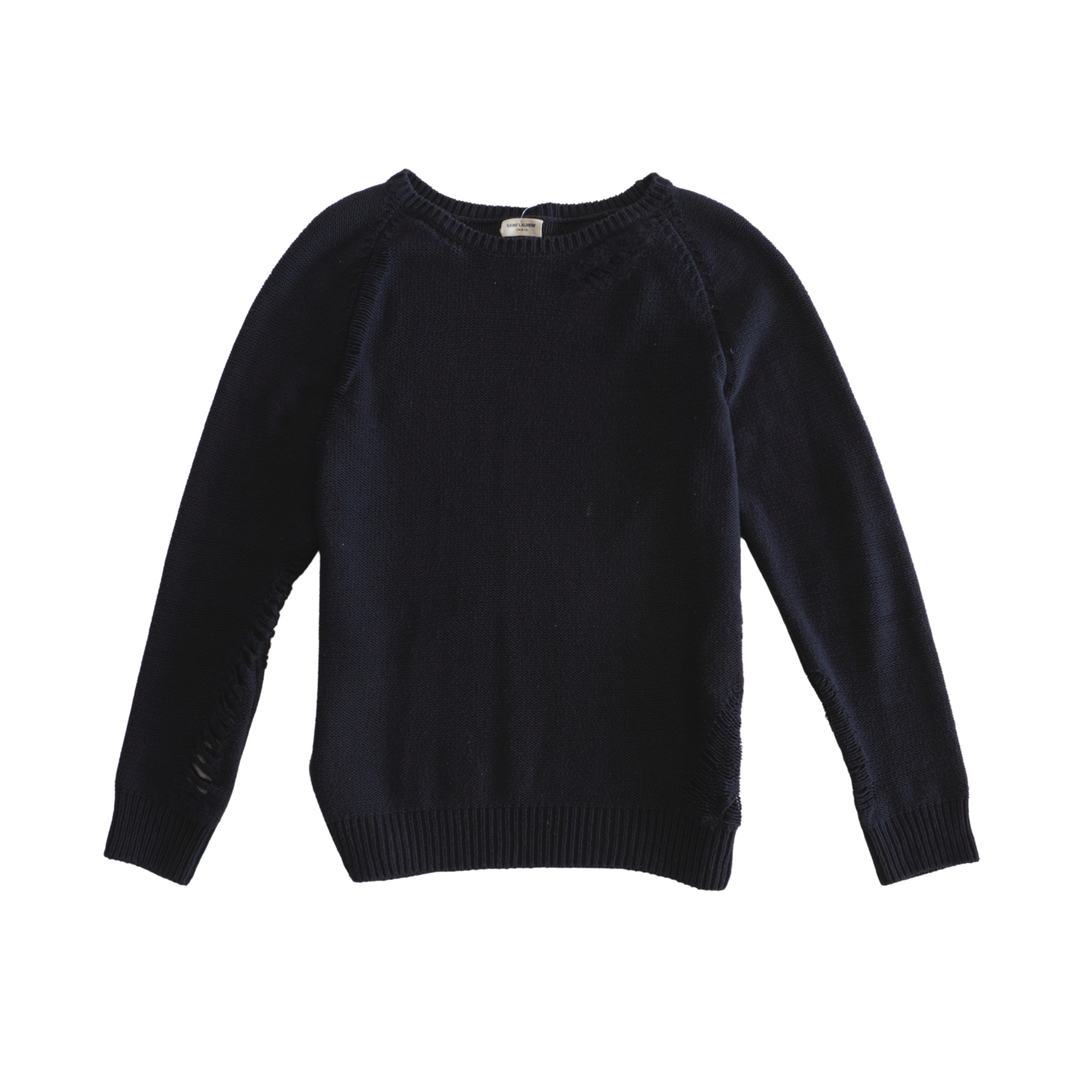 Saint Laurent distressed crewneck sweater in black knit with raglan sleeves, ribbed trims and hem and all over distressing.