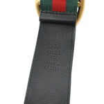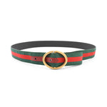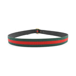 Gucci belt in red and green racing stripe cotton with black leather backing. Features a round gold hardware adjustable pin buckle.