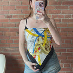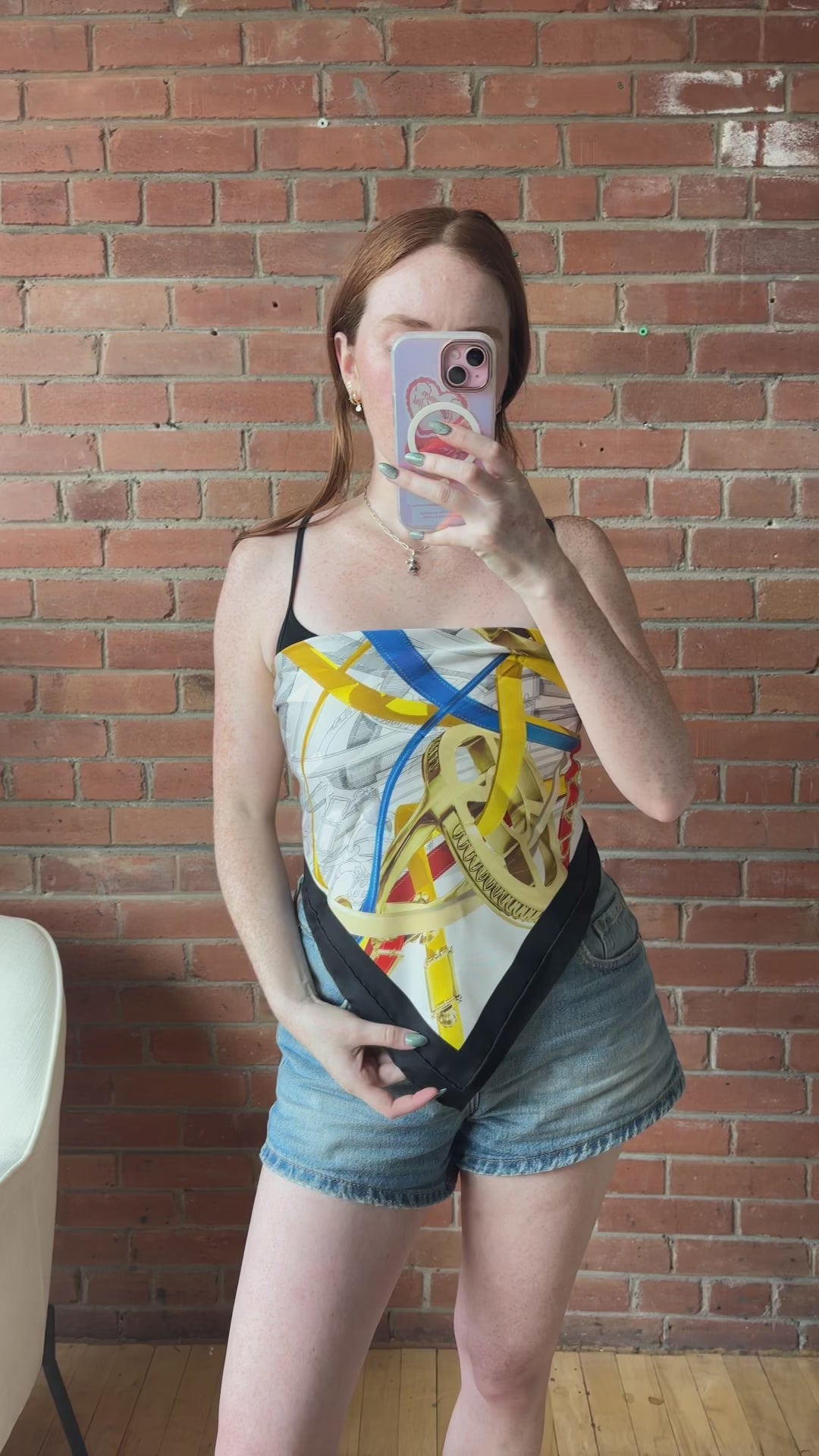 Hermes 'Cavalcadour Voltigeur' scarf in white silk with a black trim and a large red, blue, yellow and gold ribbon and hardware print.