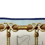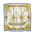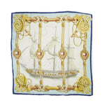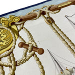 Hermes 'Tribord' square scarf in blue and cream silk with nautical boat graphics throughout.
